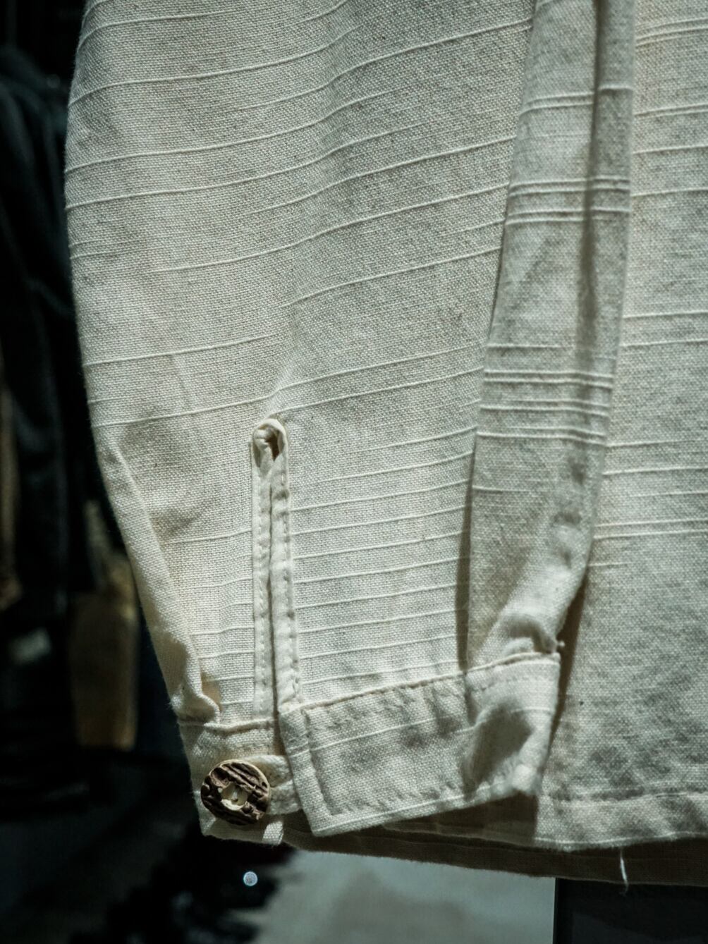 リネンの様なドライな質感のアイボリーカラーのボディに、様々なパターンの織りによって、若干の柄模様を載せた1着。