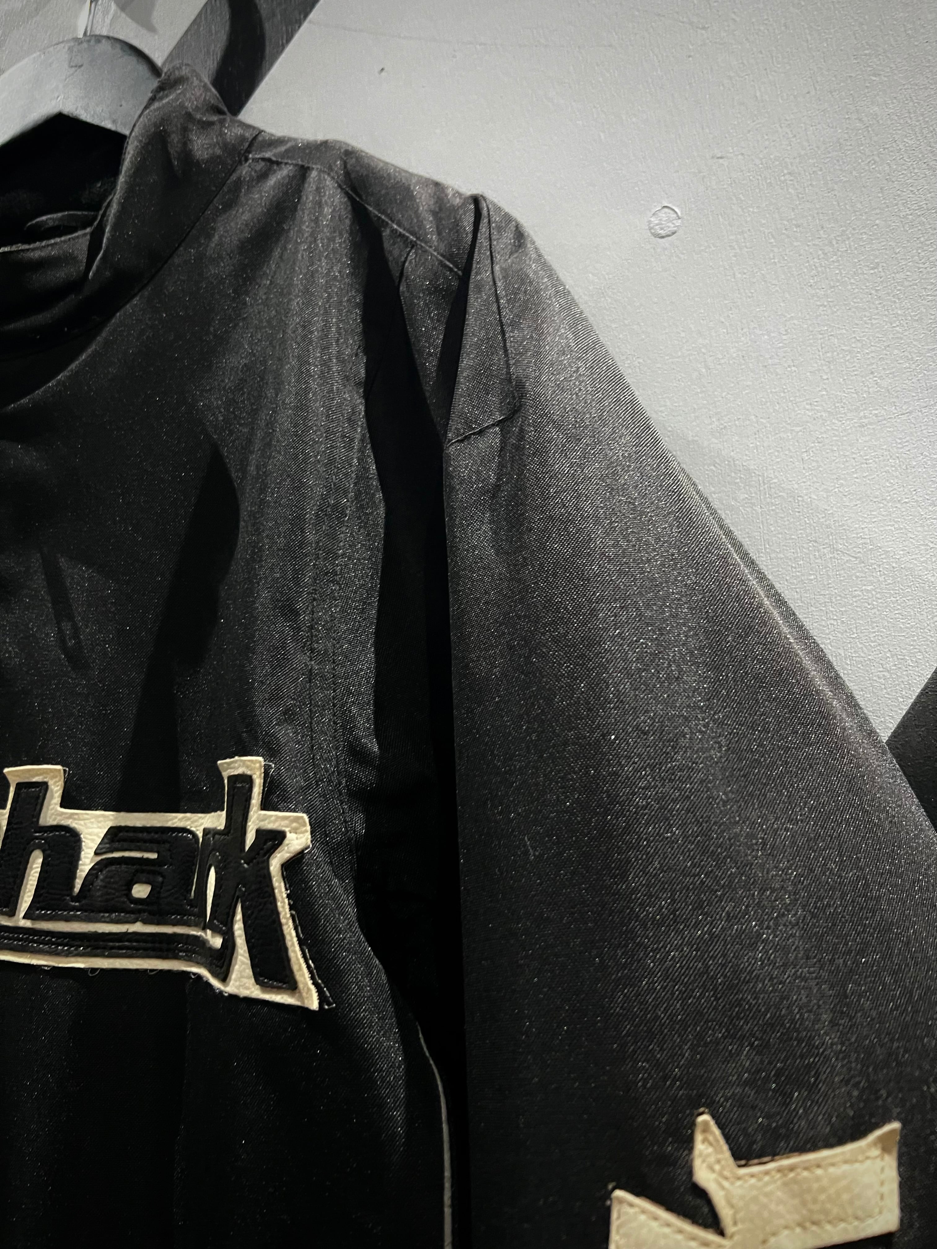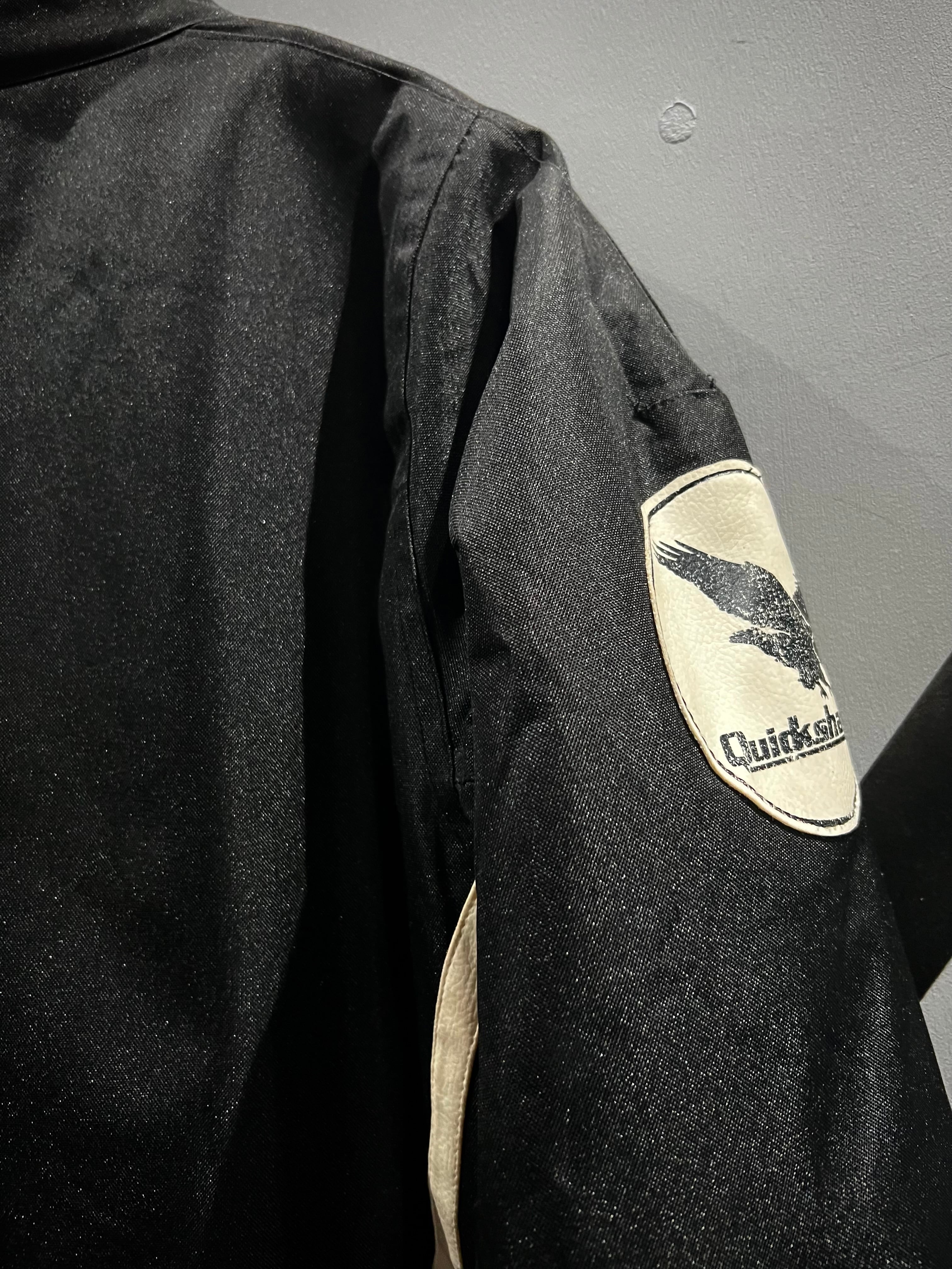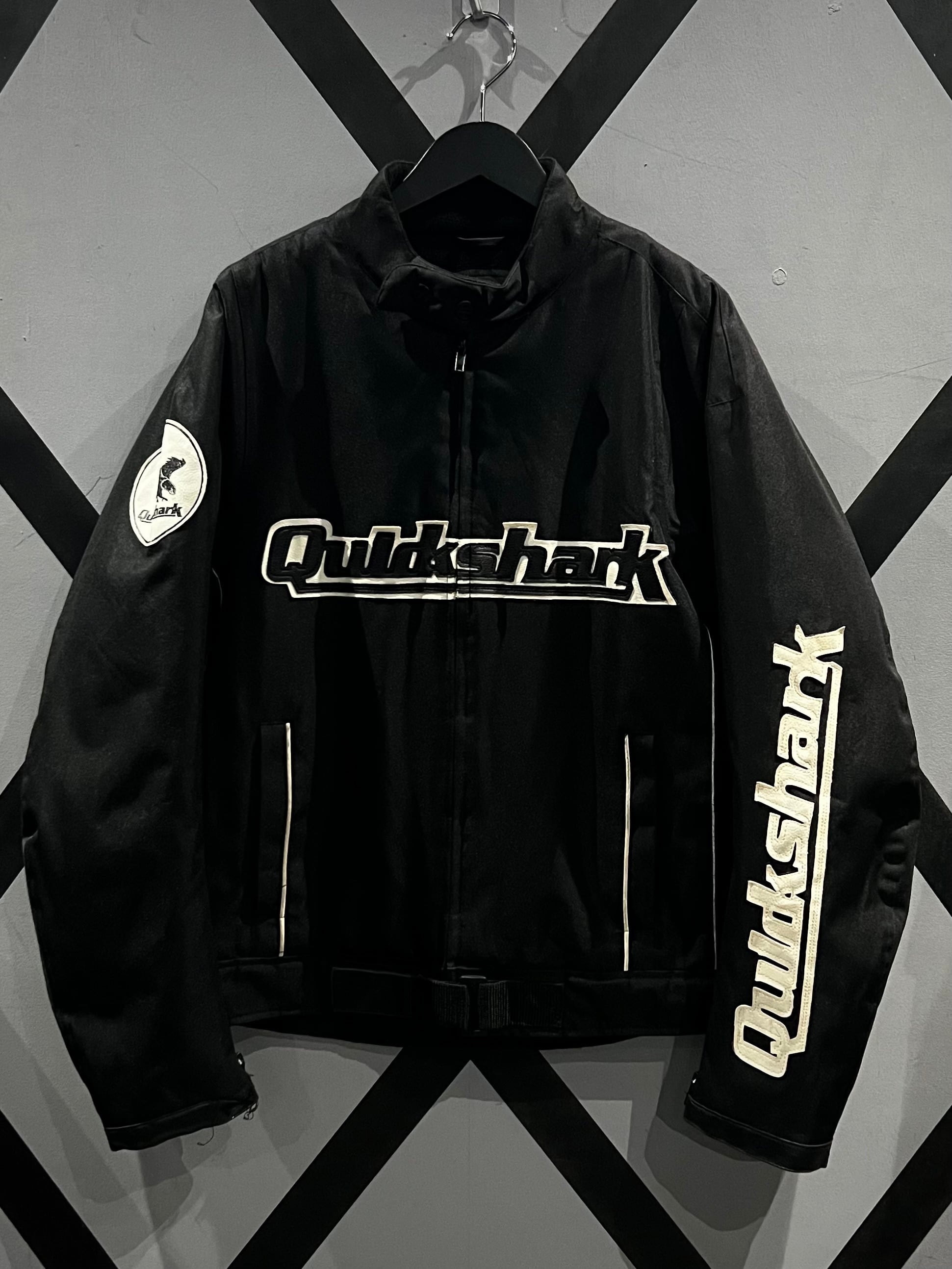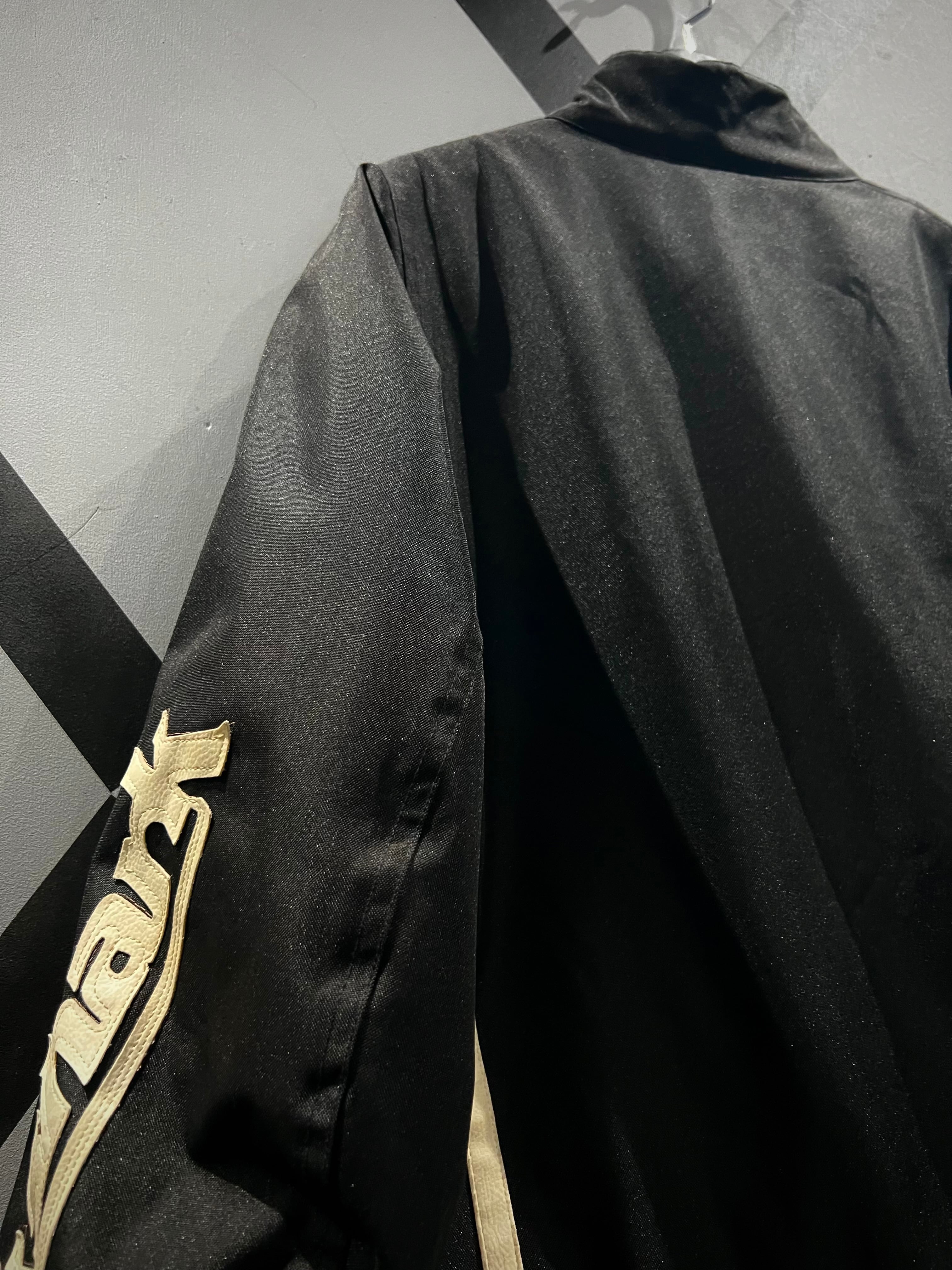 ハリのあるタフな素材を用いたブラックのボディに、レザーを用いてロゴを載せたレーシングジャケット。