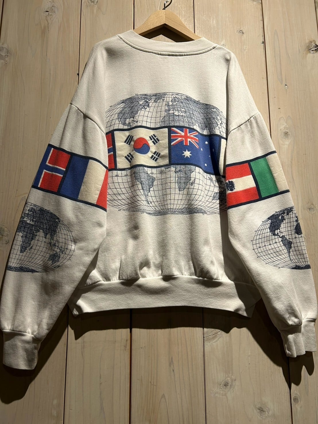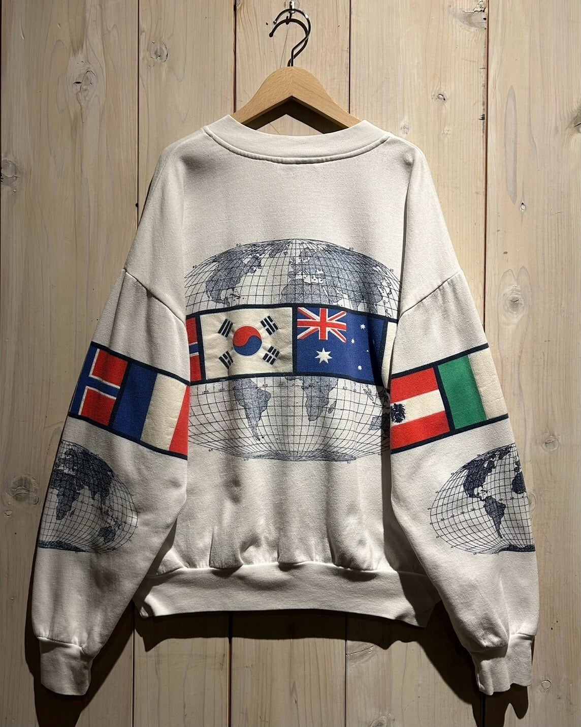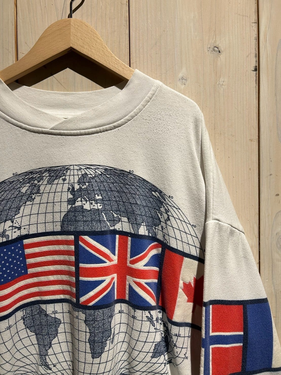 程よく肉感のあるホワイトのボディに、ボディとアームには地図、そして様々な国の国旗をプリントで載せたスウェット。