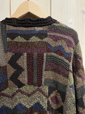 コットンの全体の生産量のわずか5%しか採取できない超高級素材“ピマコットン”を用いて、落ち着きのある多彩なカラーリングで幾何学柄を載せたニットカーディガン。