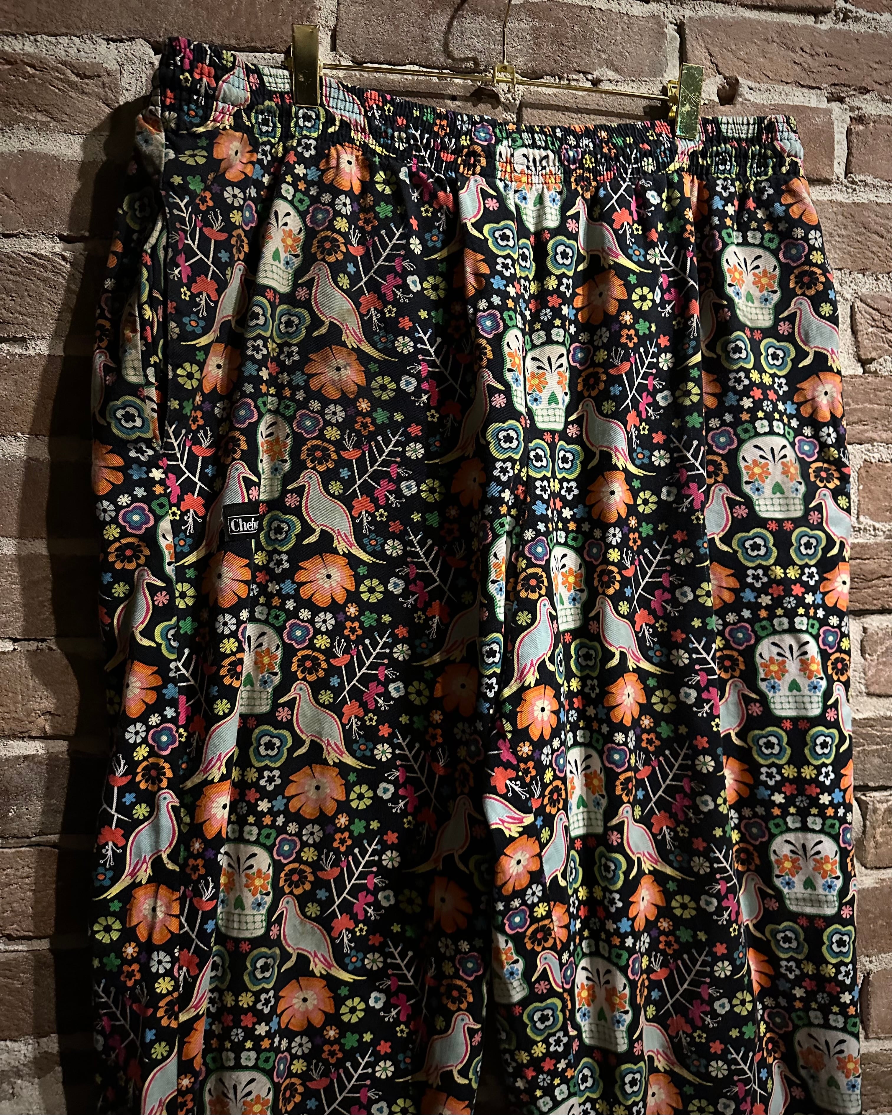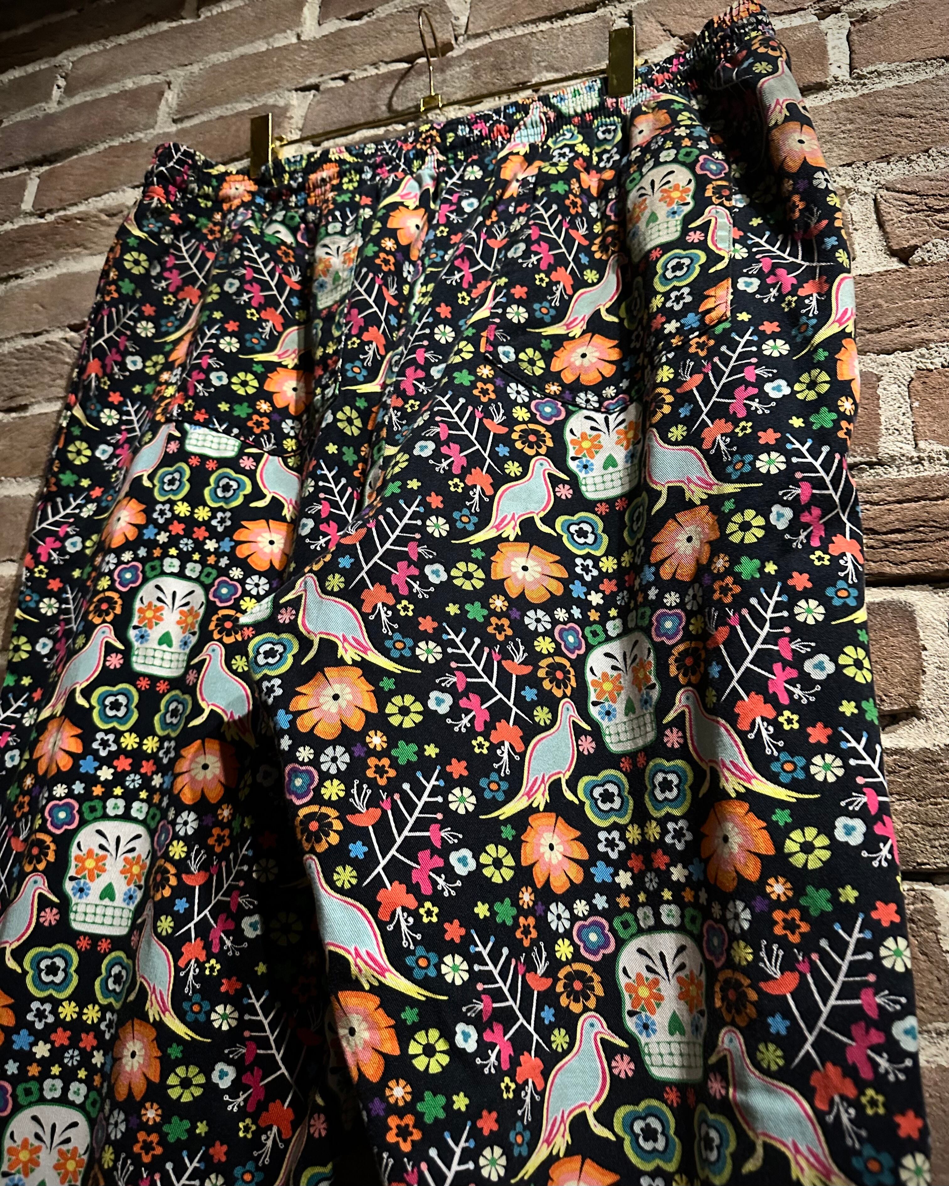 柔らかくしなやかなツイル織のボディに、メキシコの伝統的な柄模様"カラベラ"のデザインを落とし込んだパンツ。