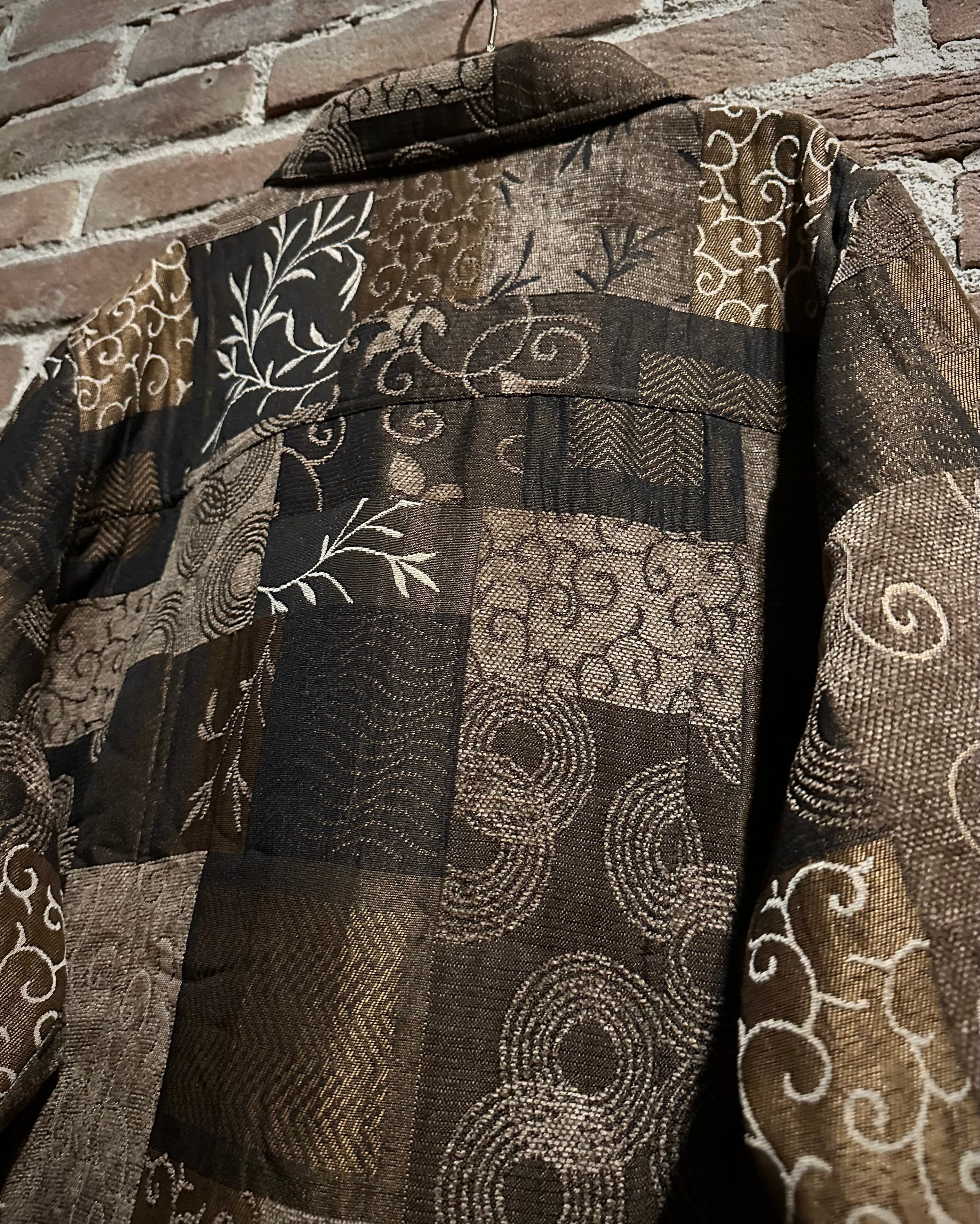 上品なブラウンカラーをベースとし、ゴブラン織りとシェニール織りを所々で使い分け、それらをパッチワーク状に繋ぎ合わせたジャケット。