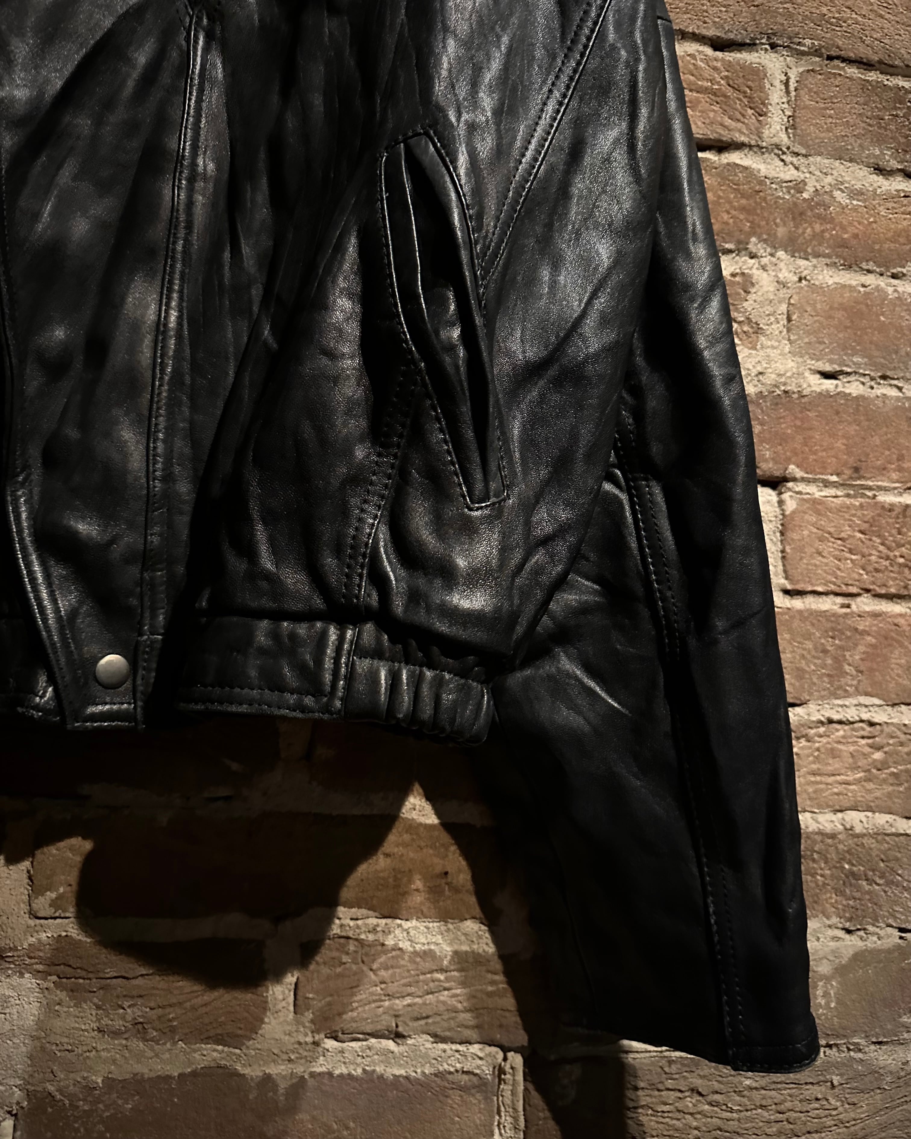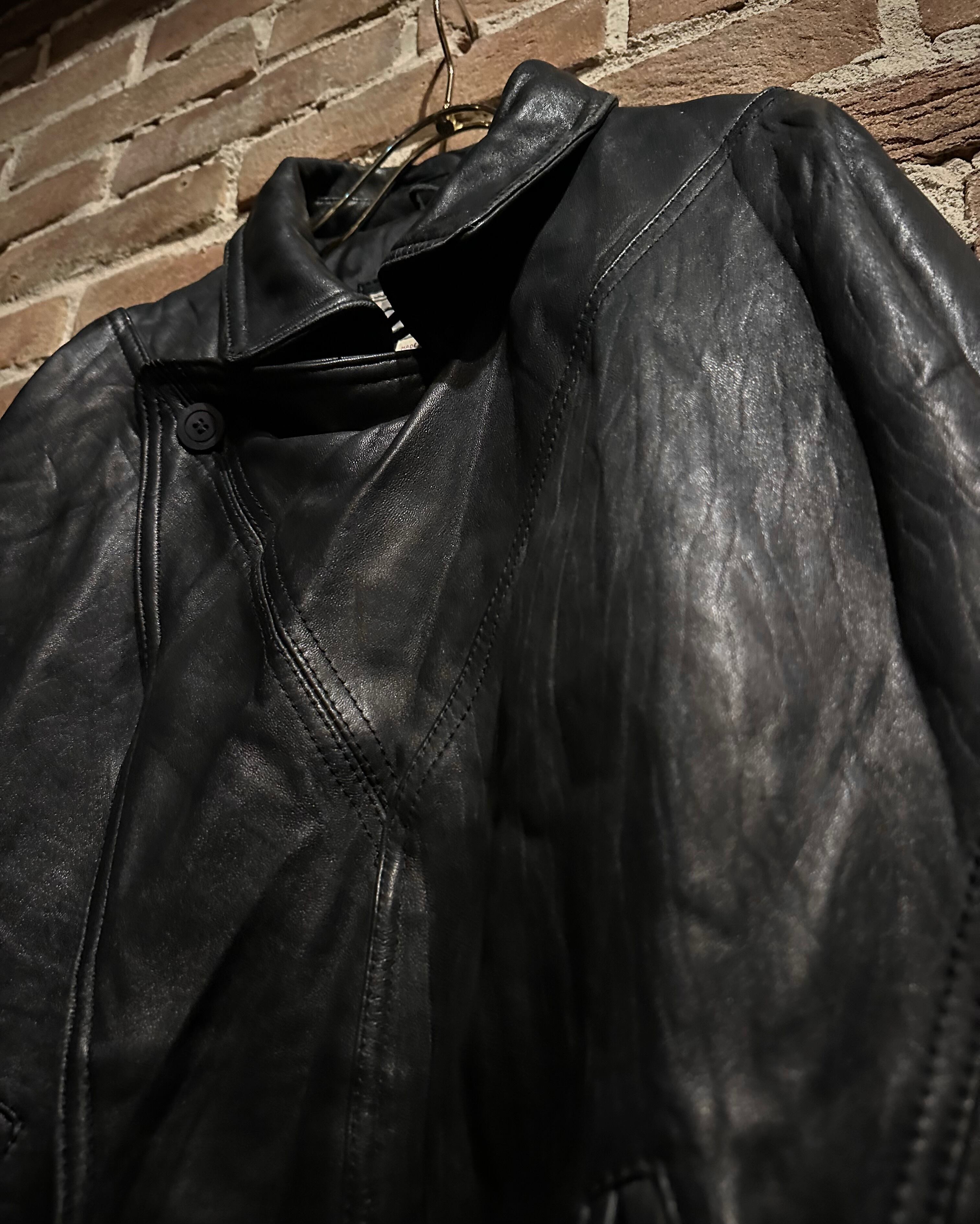 柔らかくハリのある上質なブラックレザーを用いて、襟元から前たてにかけて変形させたスペシャルなレザージャケット。