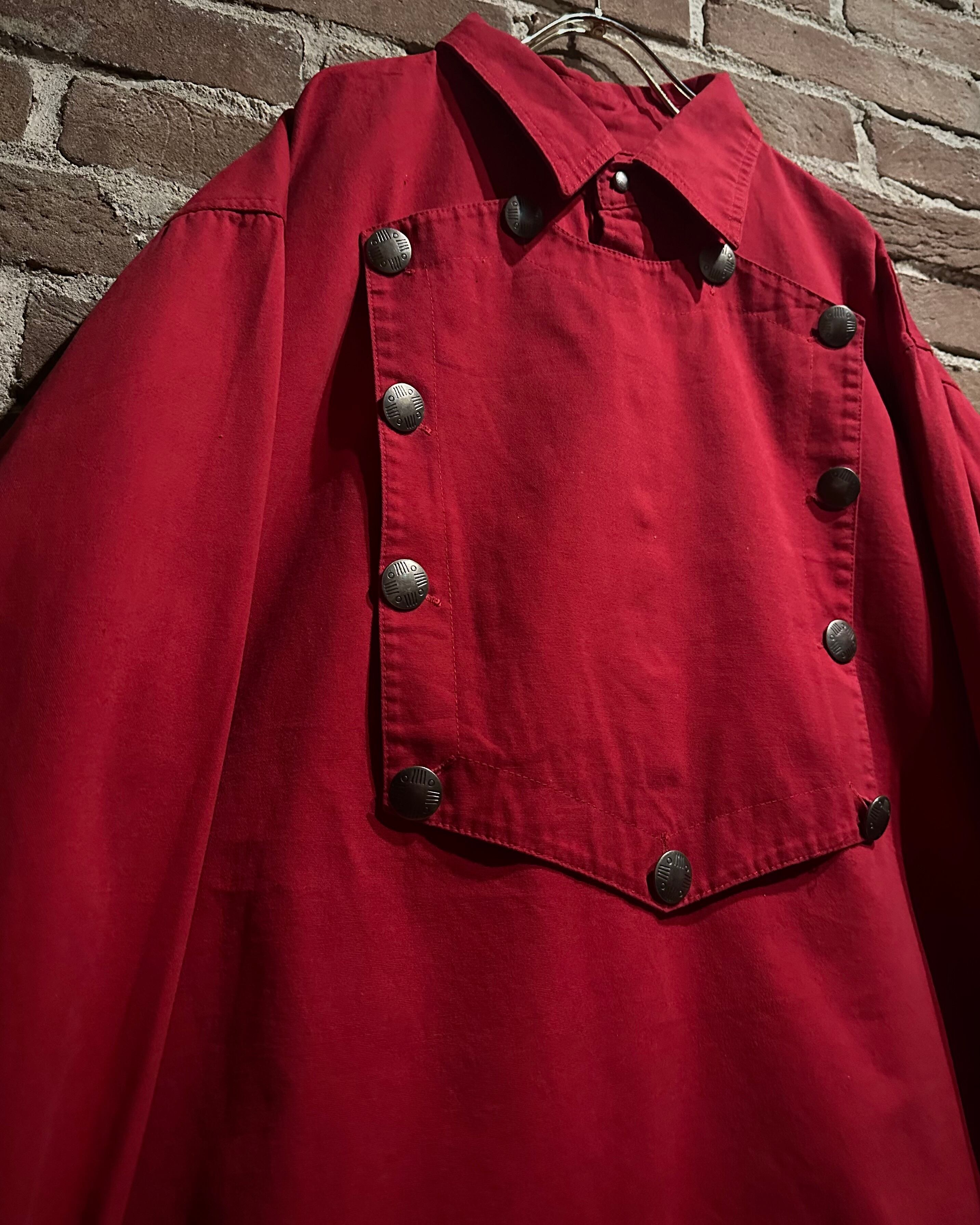 鮮やかな赤色のボディに、キャバルリーシャツ最大の特徴であるビブにはデザインが施されたメタルボタンを用いており、よりファッショナブルなアイテムへと昇華してくれています。