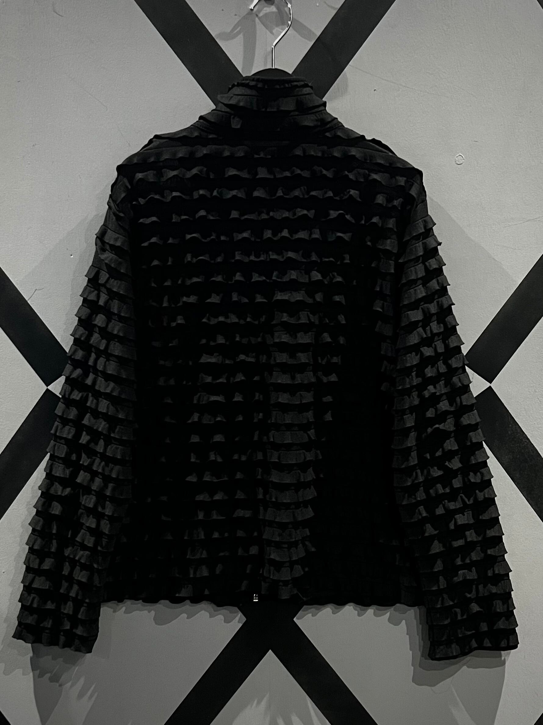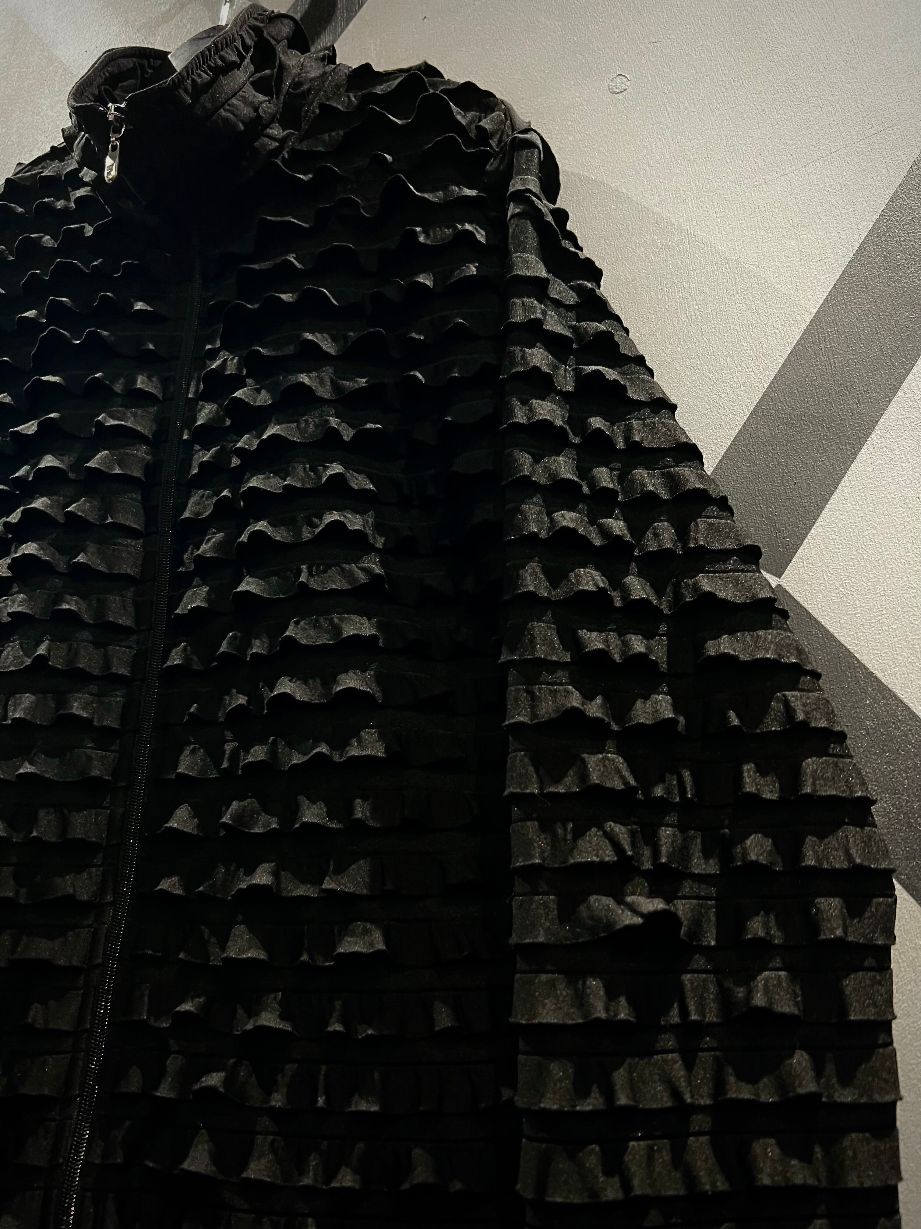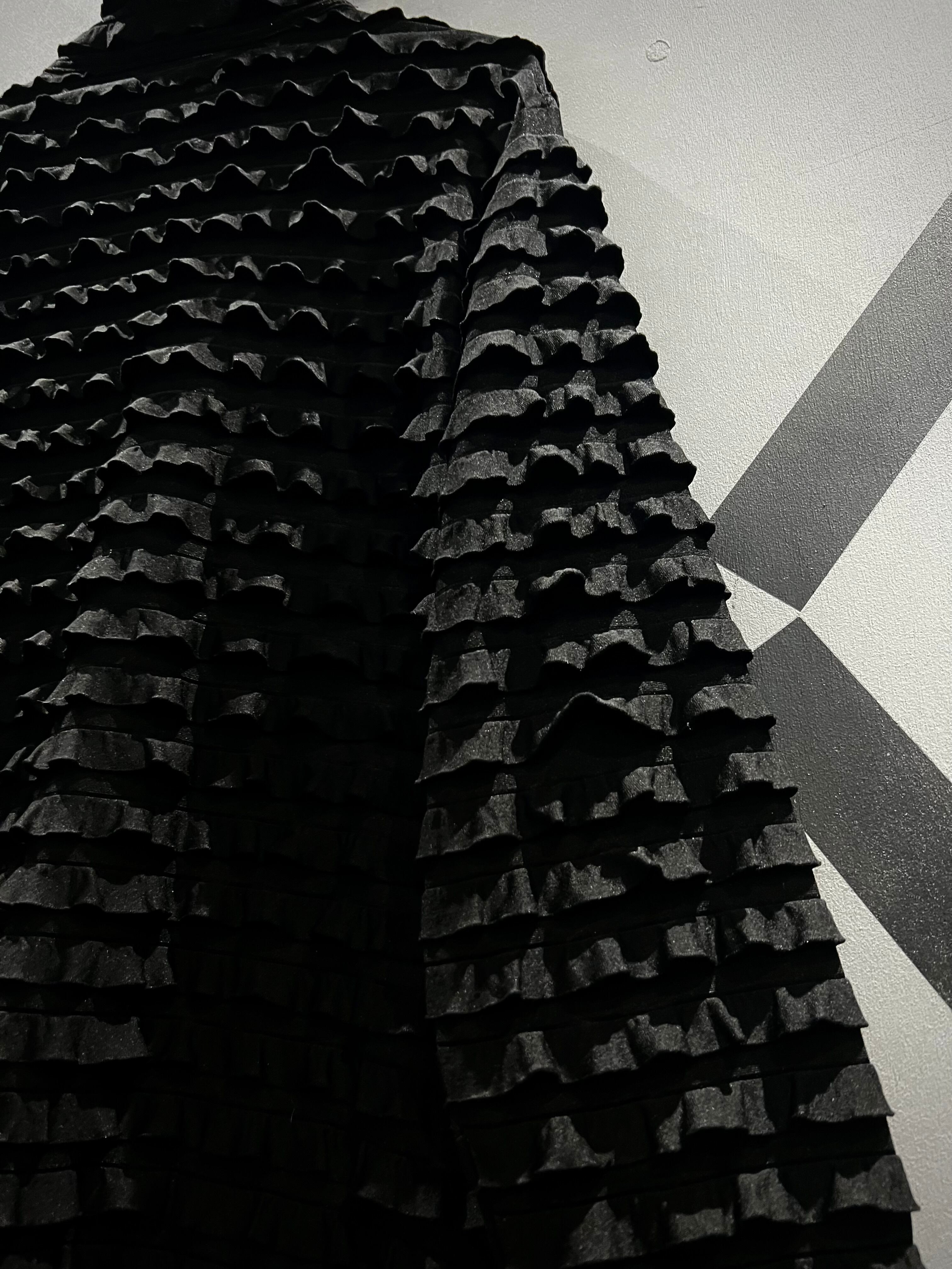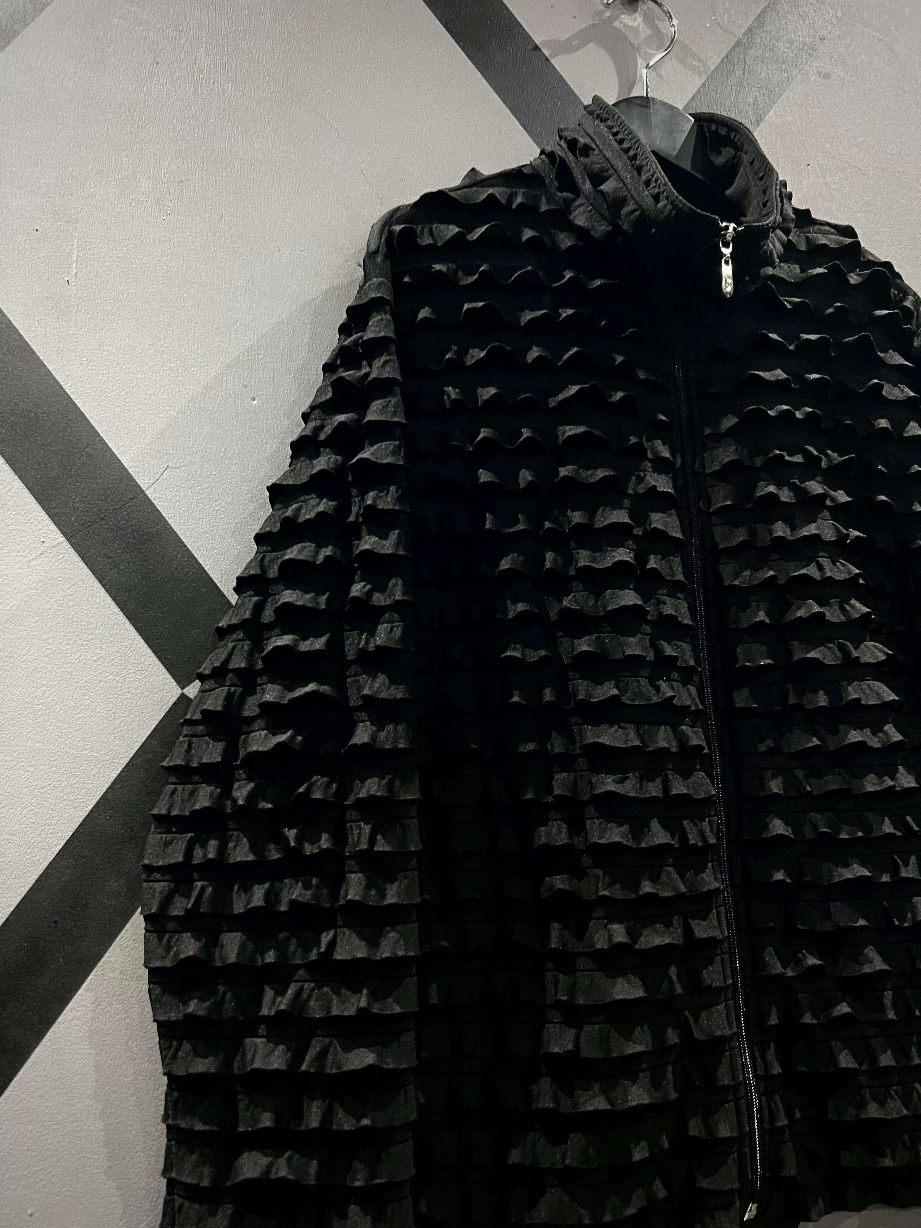ブルゾン型のブラックのボディに薄い生地をボーダー状に無数に配し、プリーツのような立体感のある表情を生み出したジャケット。