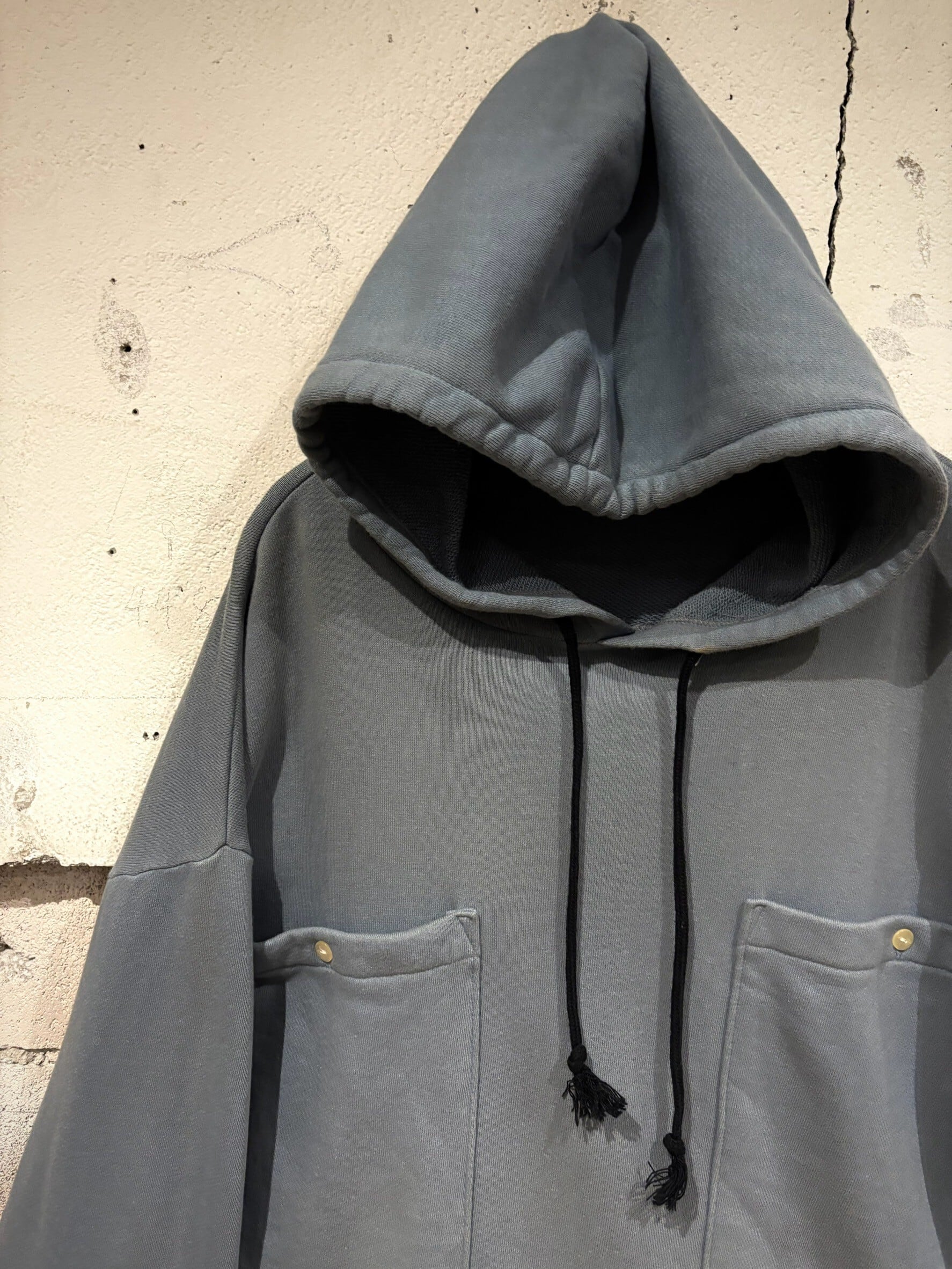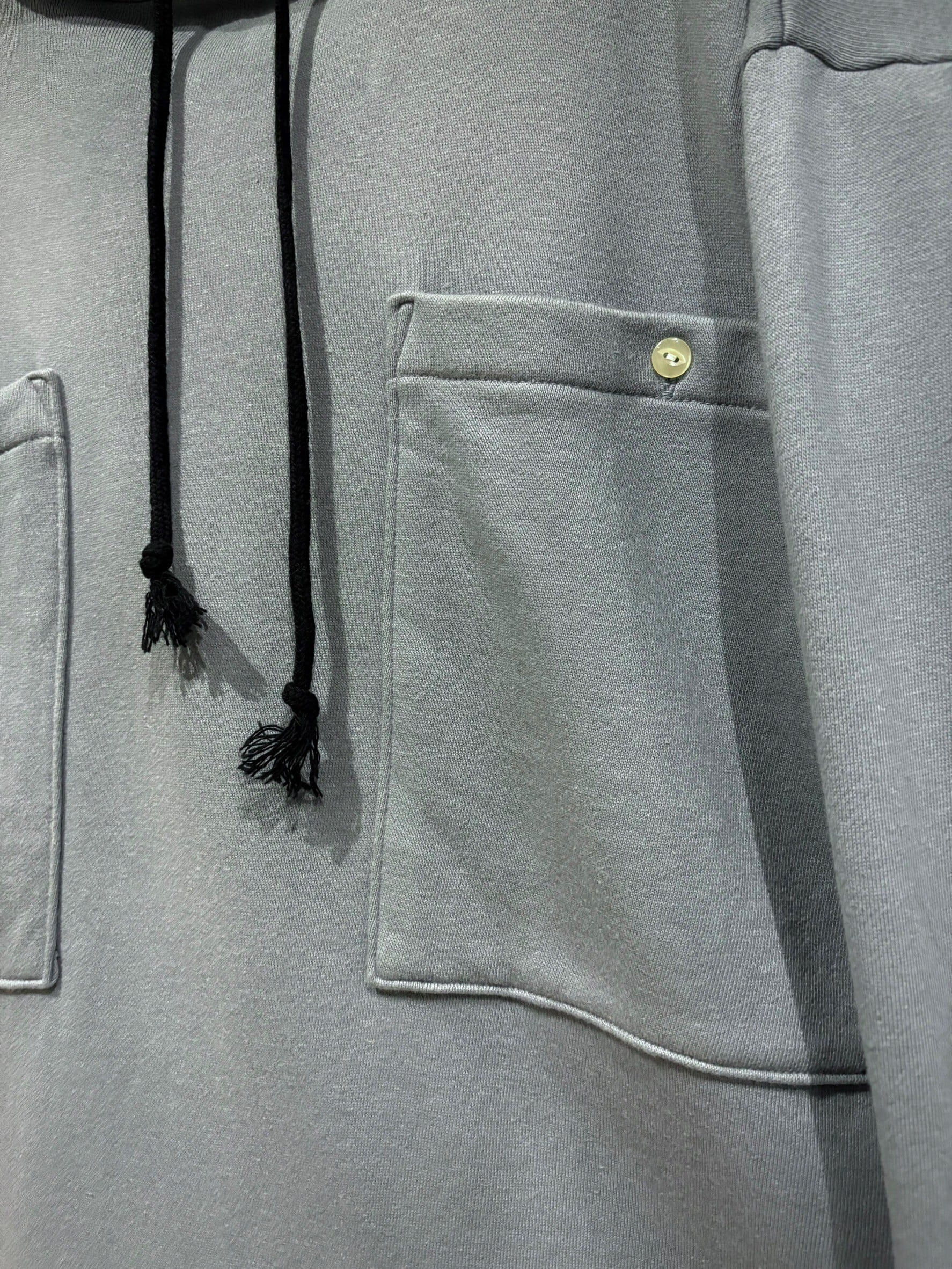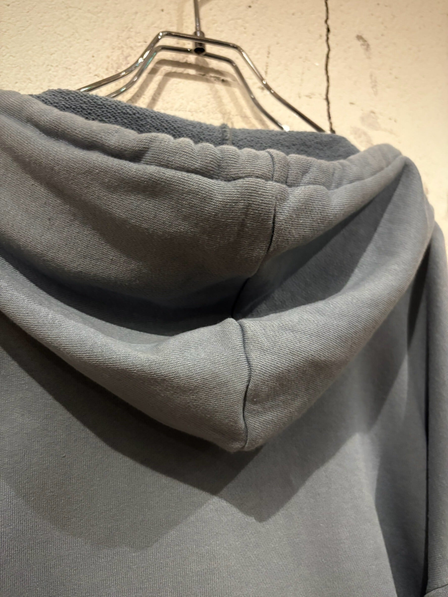 くすんだ水色のボディに、フロントには大ぶりのパッチポケット、裾にはドローコードのギミックを載せたプルオーバーフーディ。