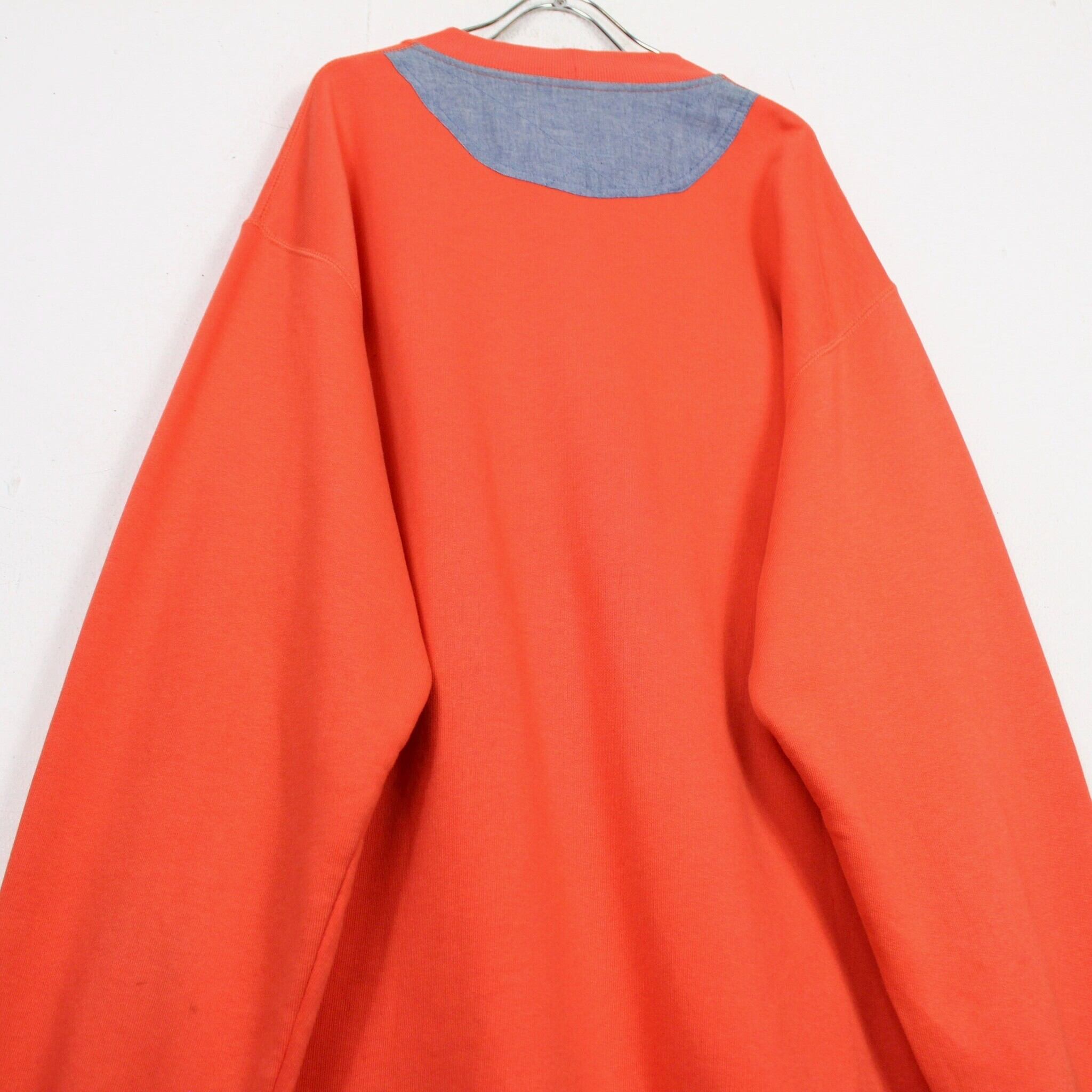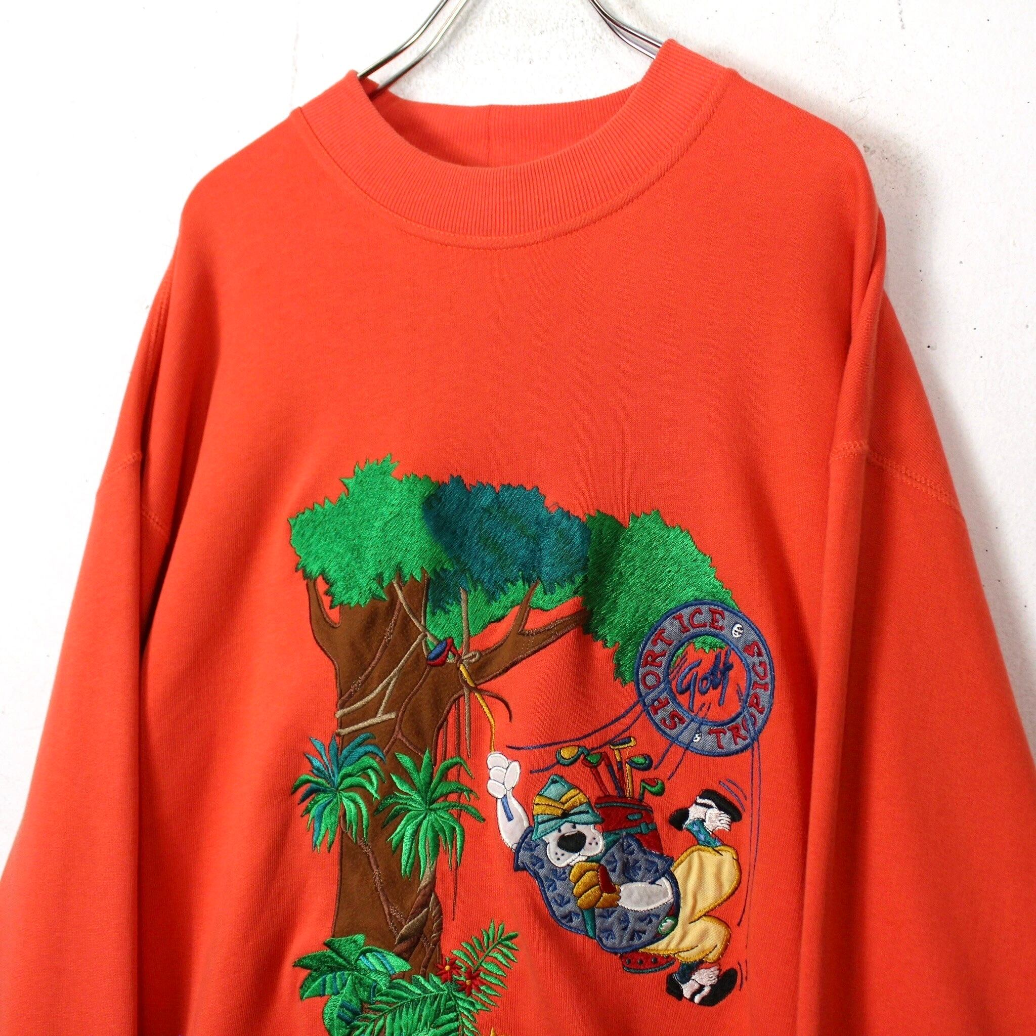 若干フェードのかかったオレンジのスウェットボディに、木や犬にはフェルトの切り替え、草の部分には刺繍を施したデザイン性の高い1着に仕上がっています。