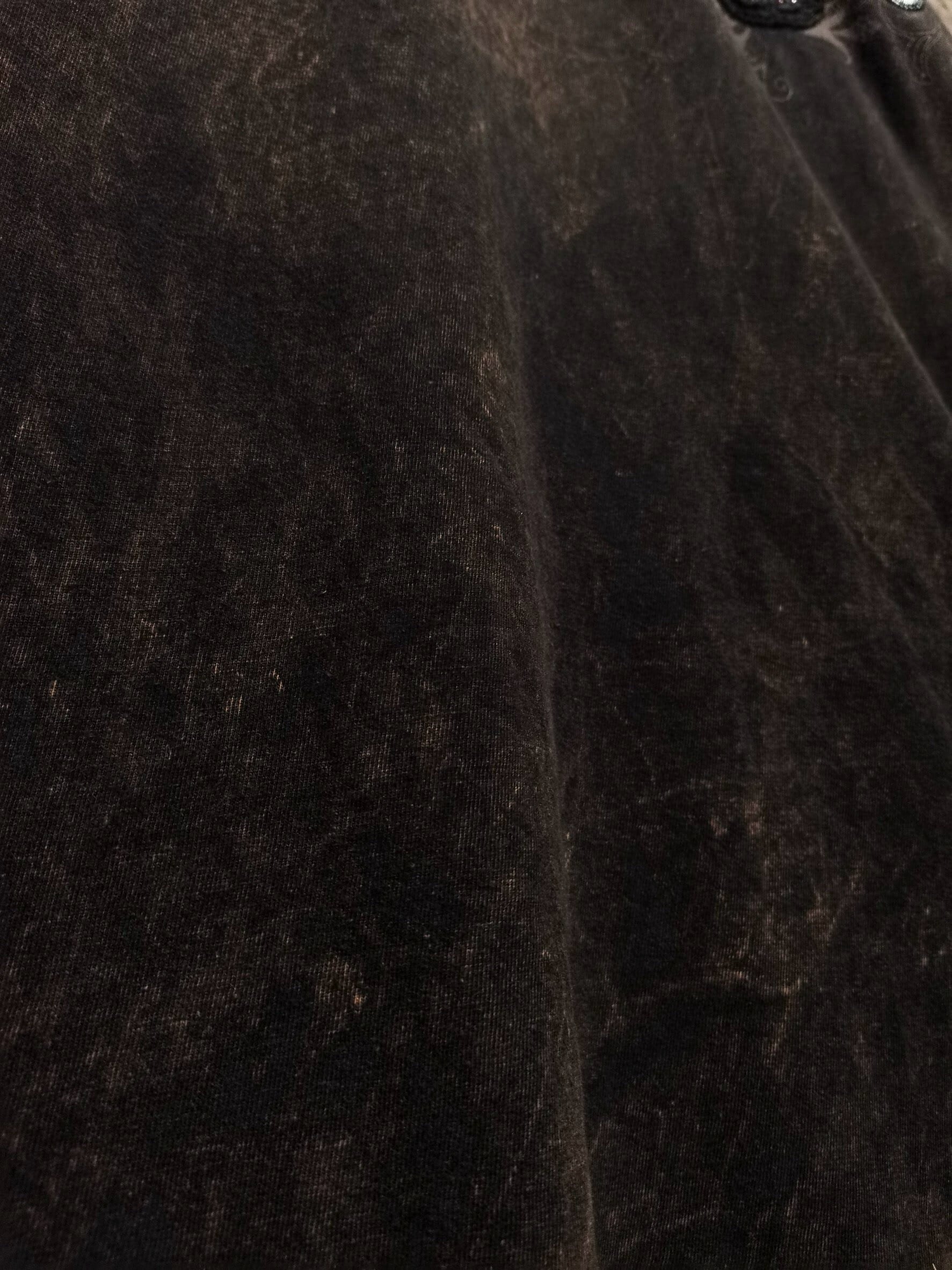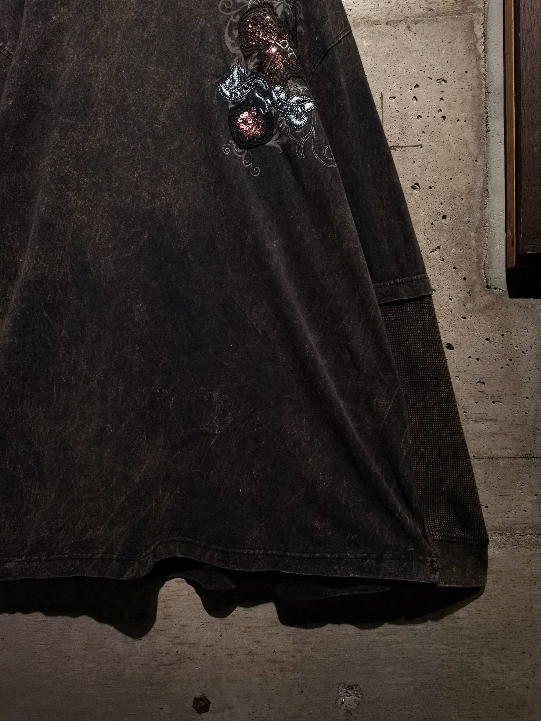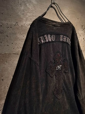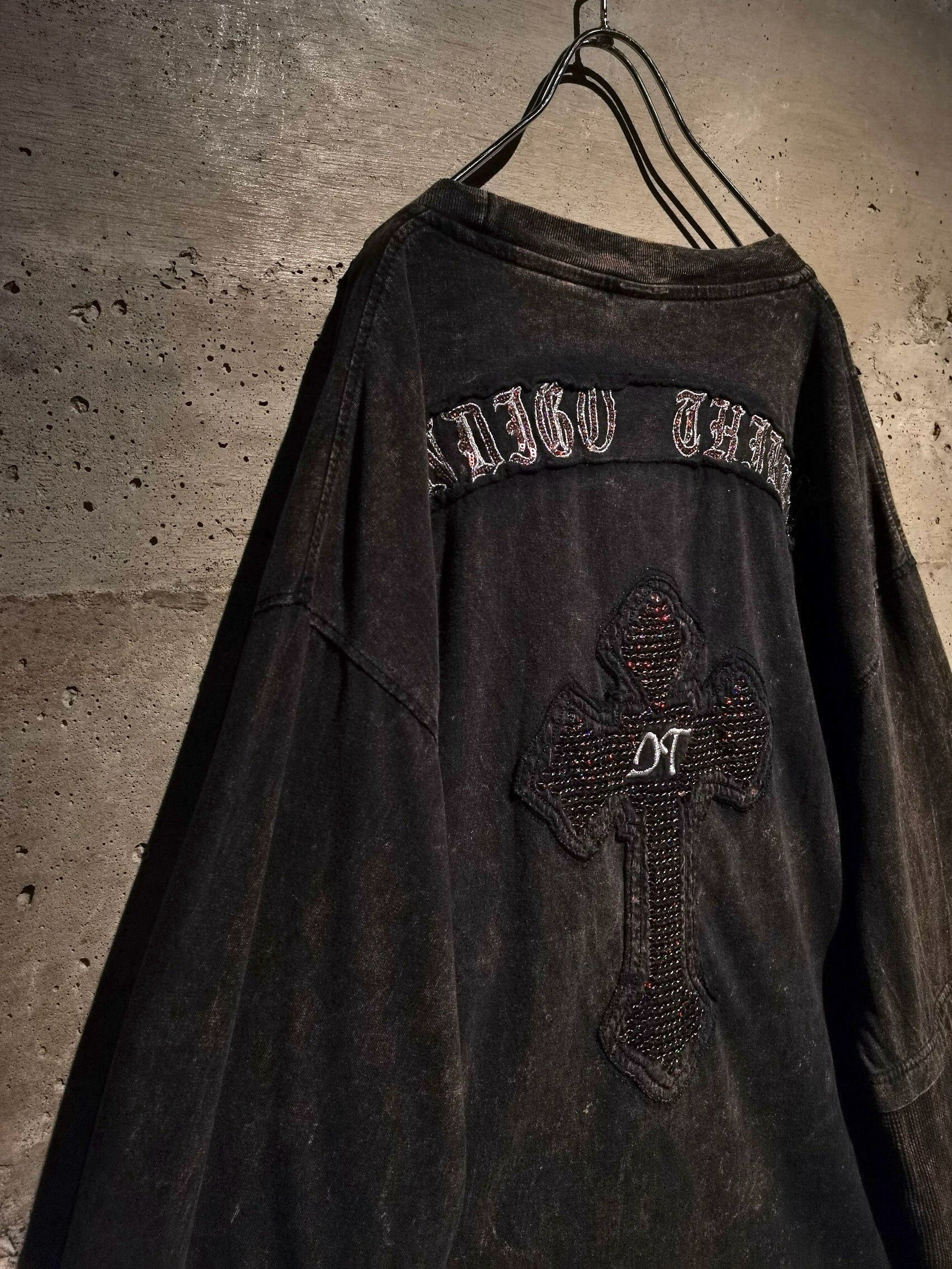 フェード風に加工が施されたボディ。左胸にはゴシック風のプリントの上からスパンコールを用いたクロス、背面にもスパンコールのブランドネームとクロスが配された、昨今のトレンド感のあるデザインが超気分。