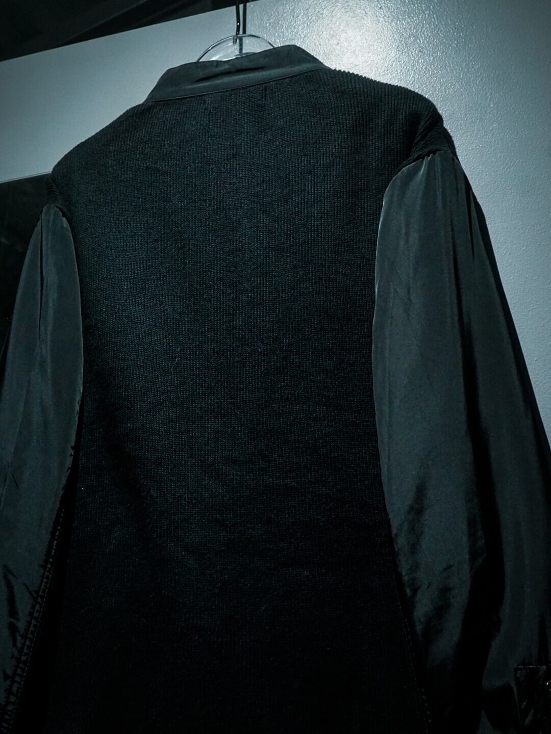 シルクのような光沢に滑らかさを持ち合わせた素材を前身頃に使用、背面には伸縮性のあるニット素材を切り替えた稀有な素材使いのジャケット。