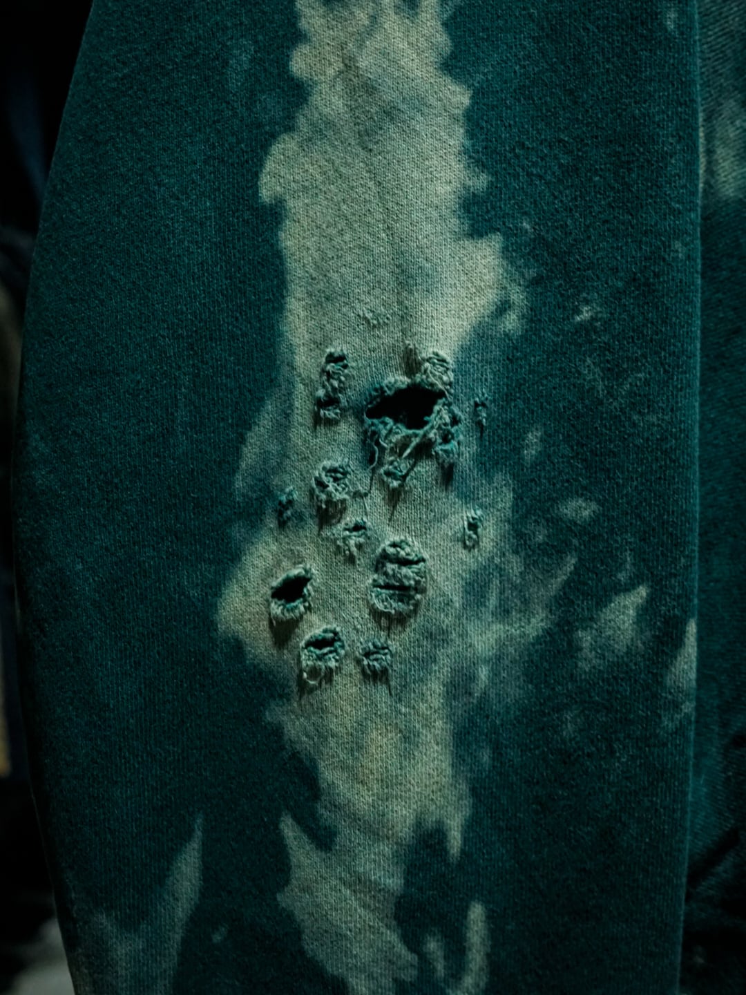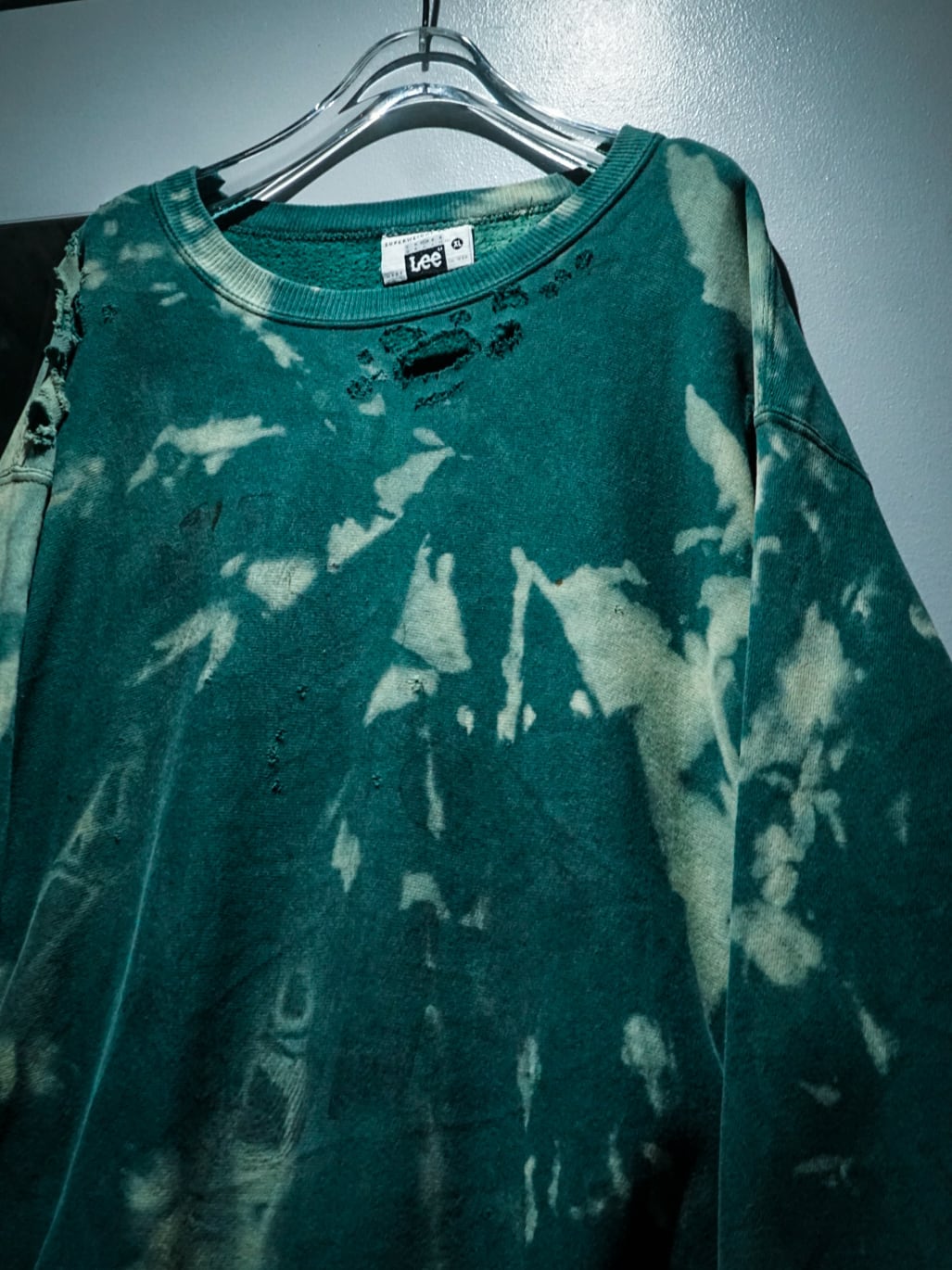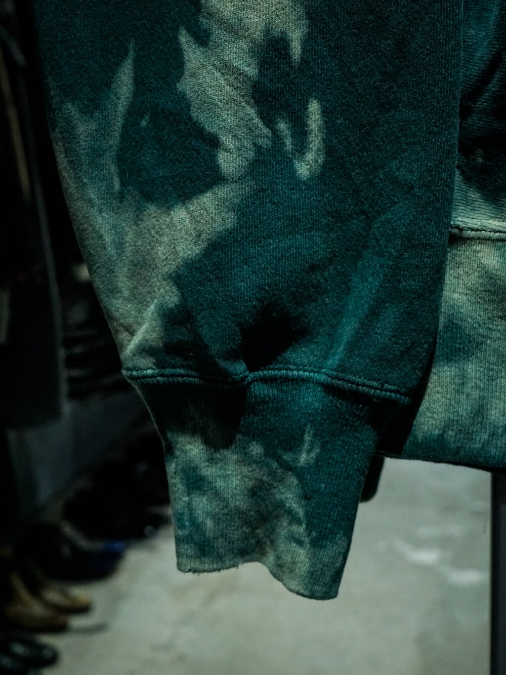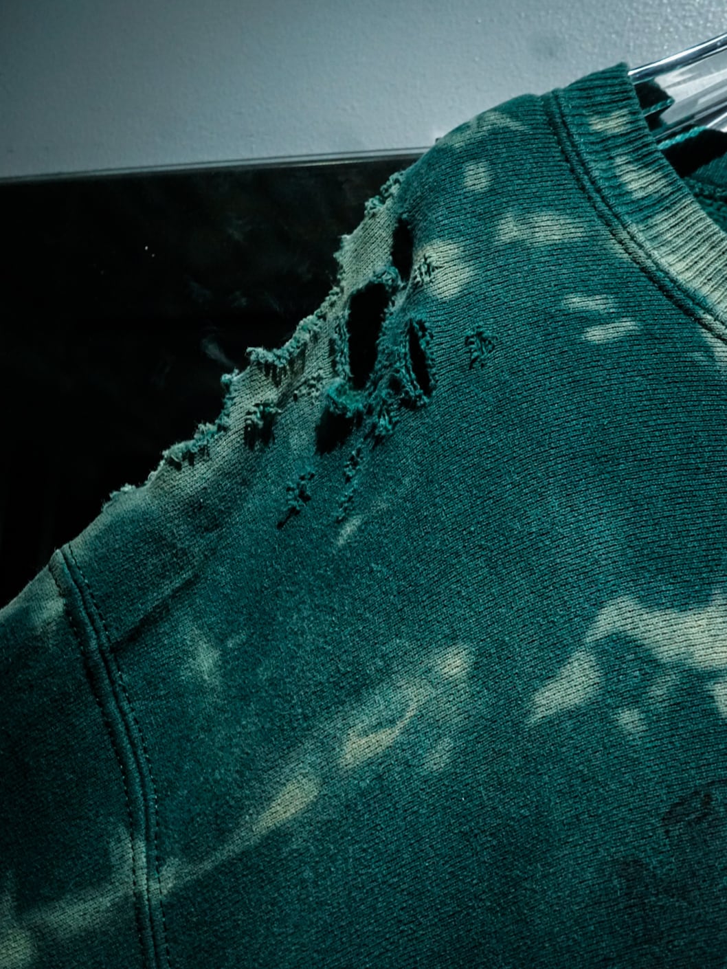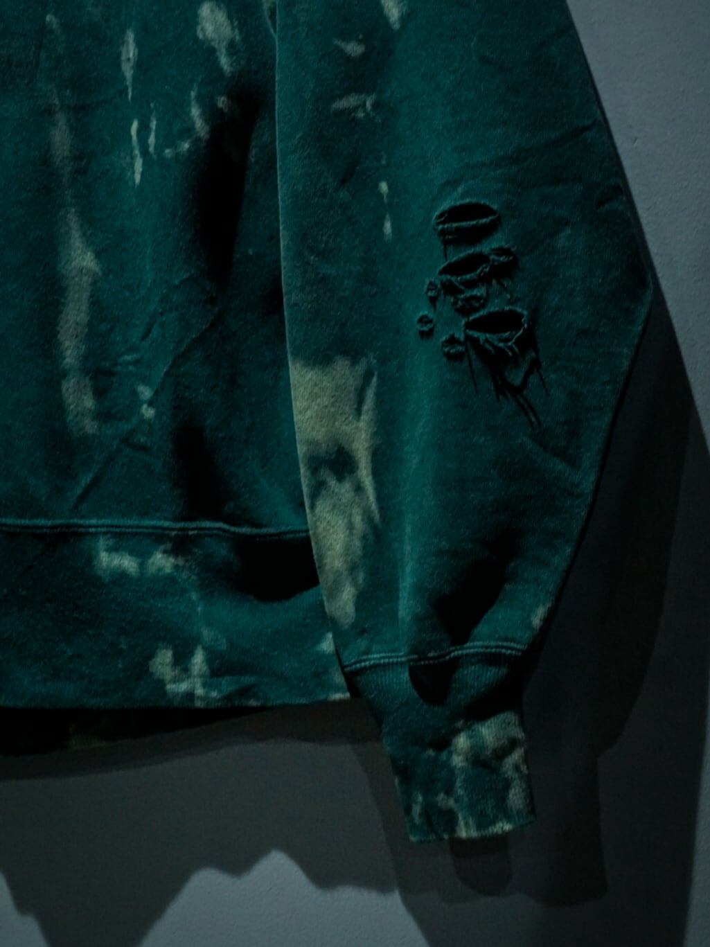 緑を基調としボロとブリーチ加工が施されたボディに、背面に載せられた"愛其"~Love it~のプリントがユニークなスウェット。