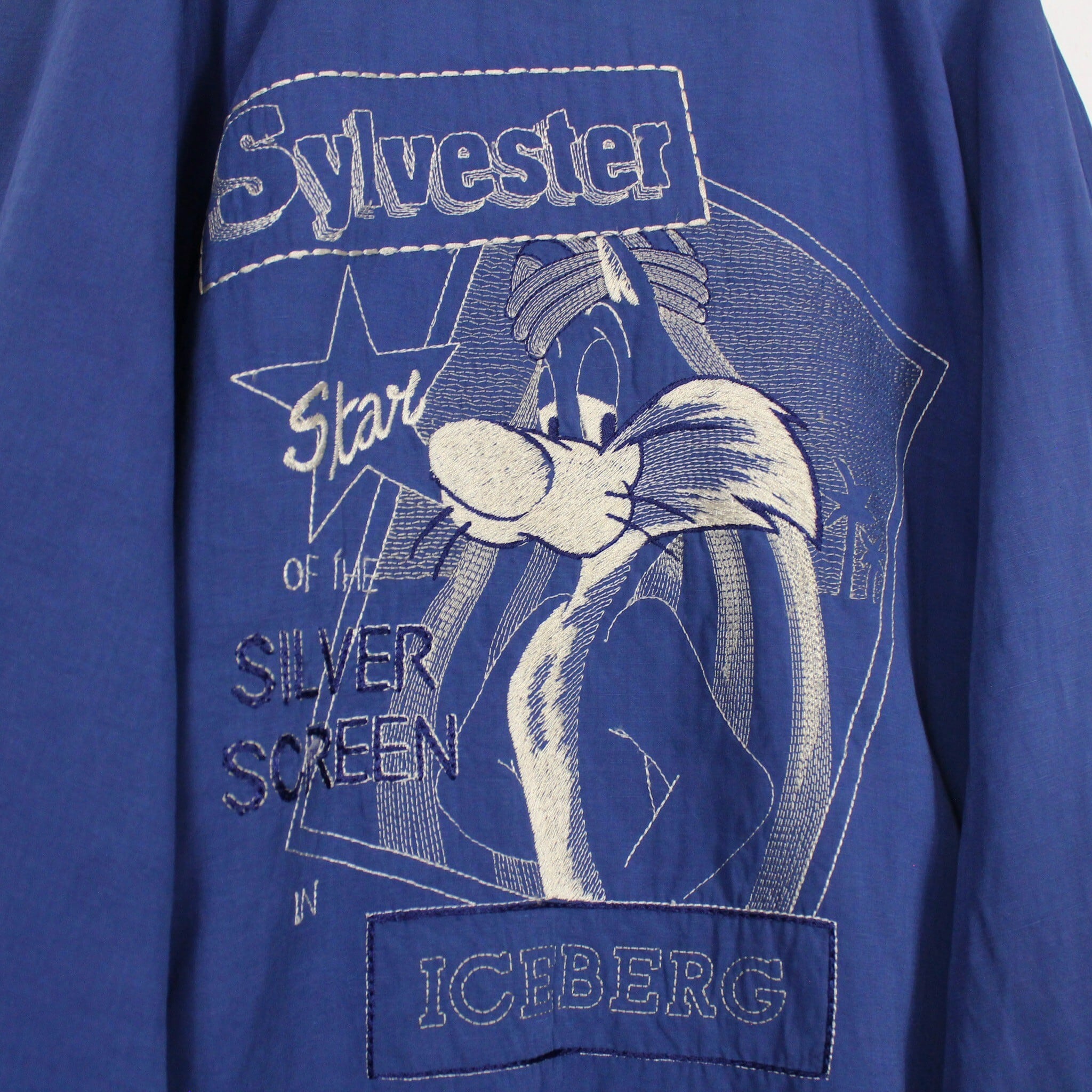 明るいトーンのブルーカラー単色でまとめ上げられ、左胸、背面にはルーニー・テューンズのシルベスターキャットを刺繍によって刻み込んだブランドらしいデザインの載ったブルゾンジャケット。