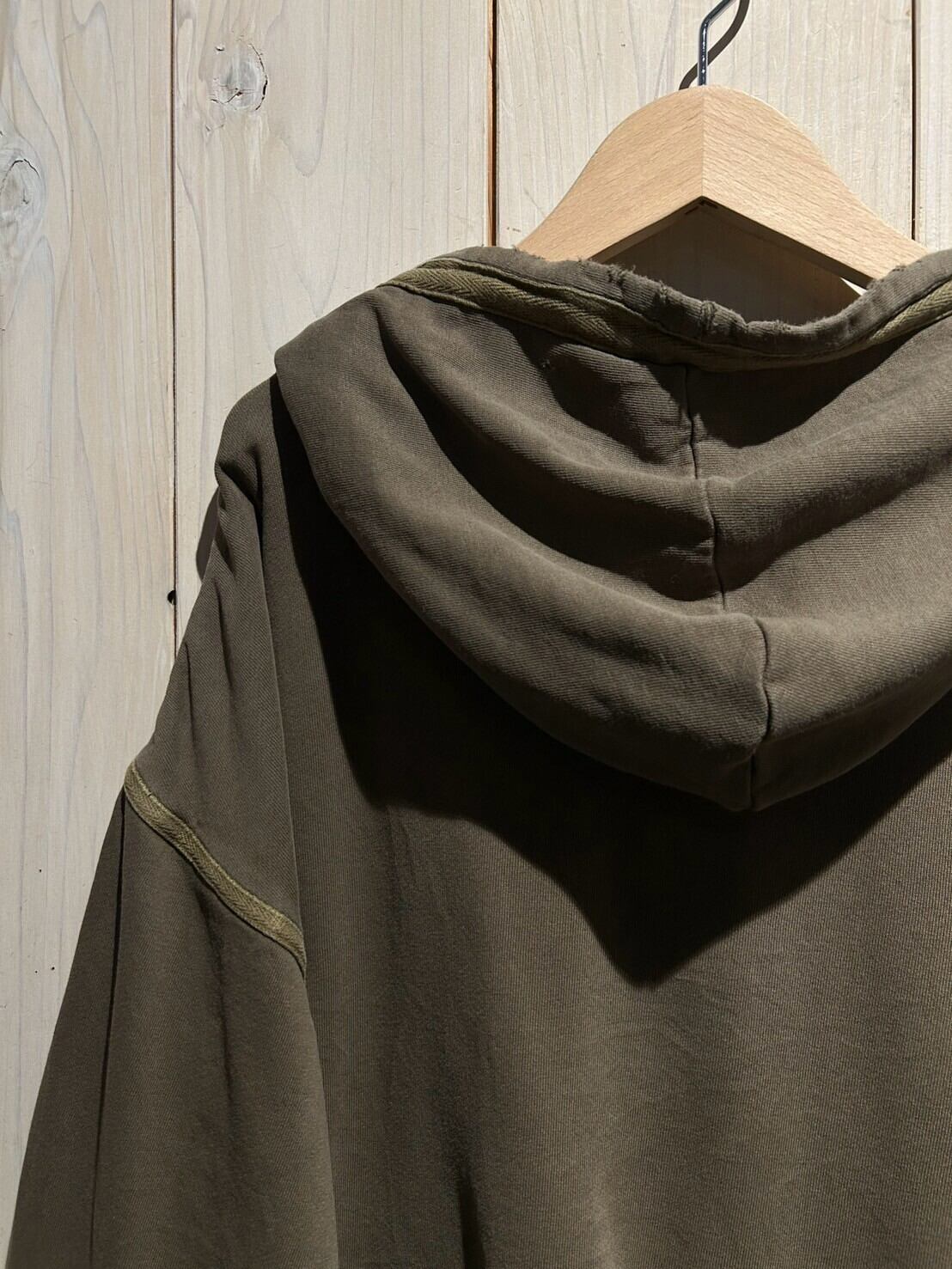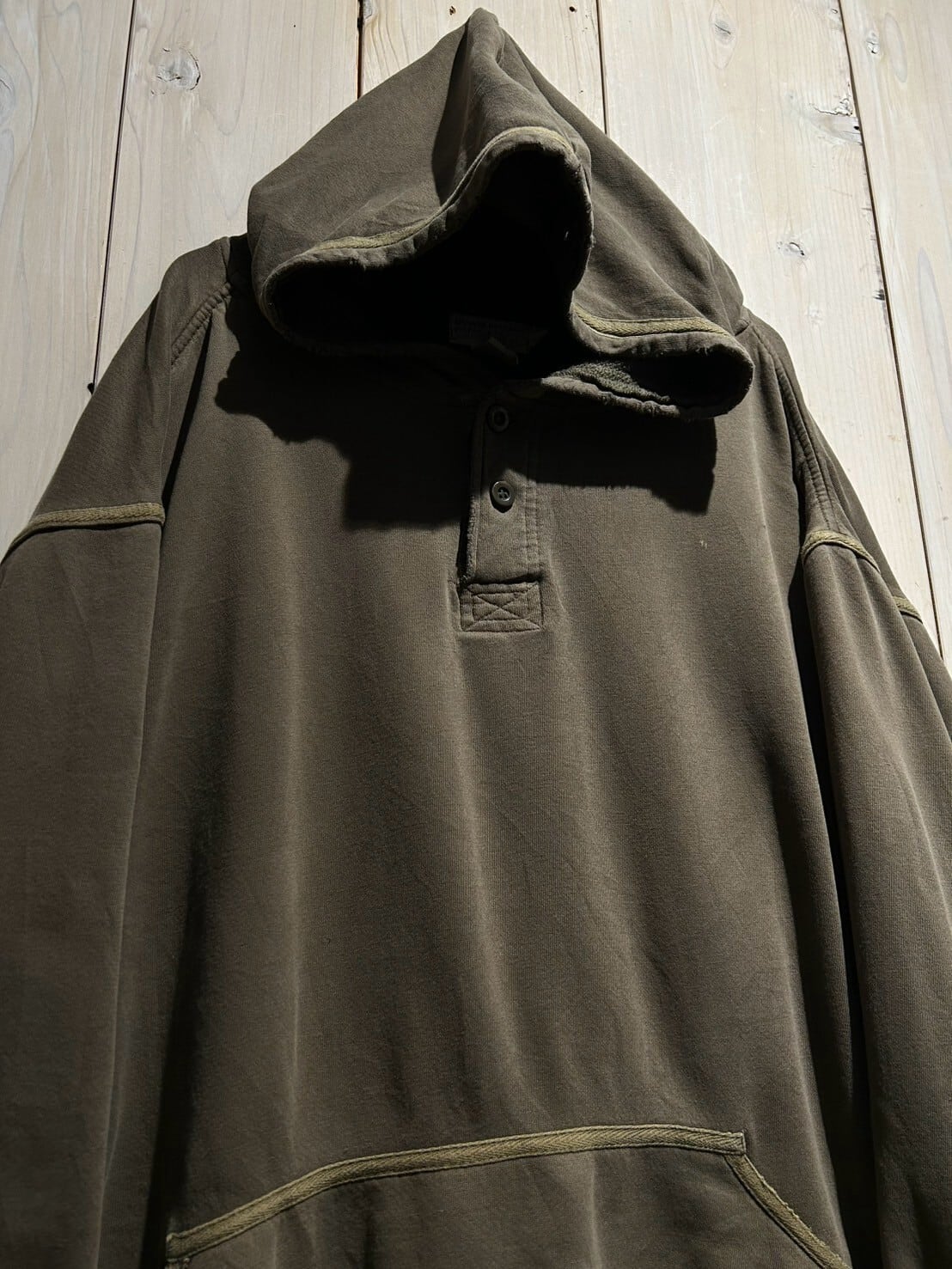 経年により、ボディ全体がフェードしたプルオーバーフーディ。