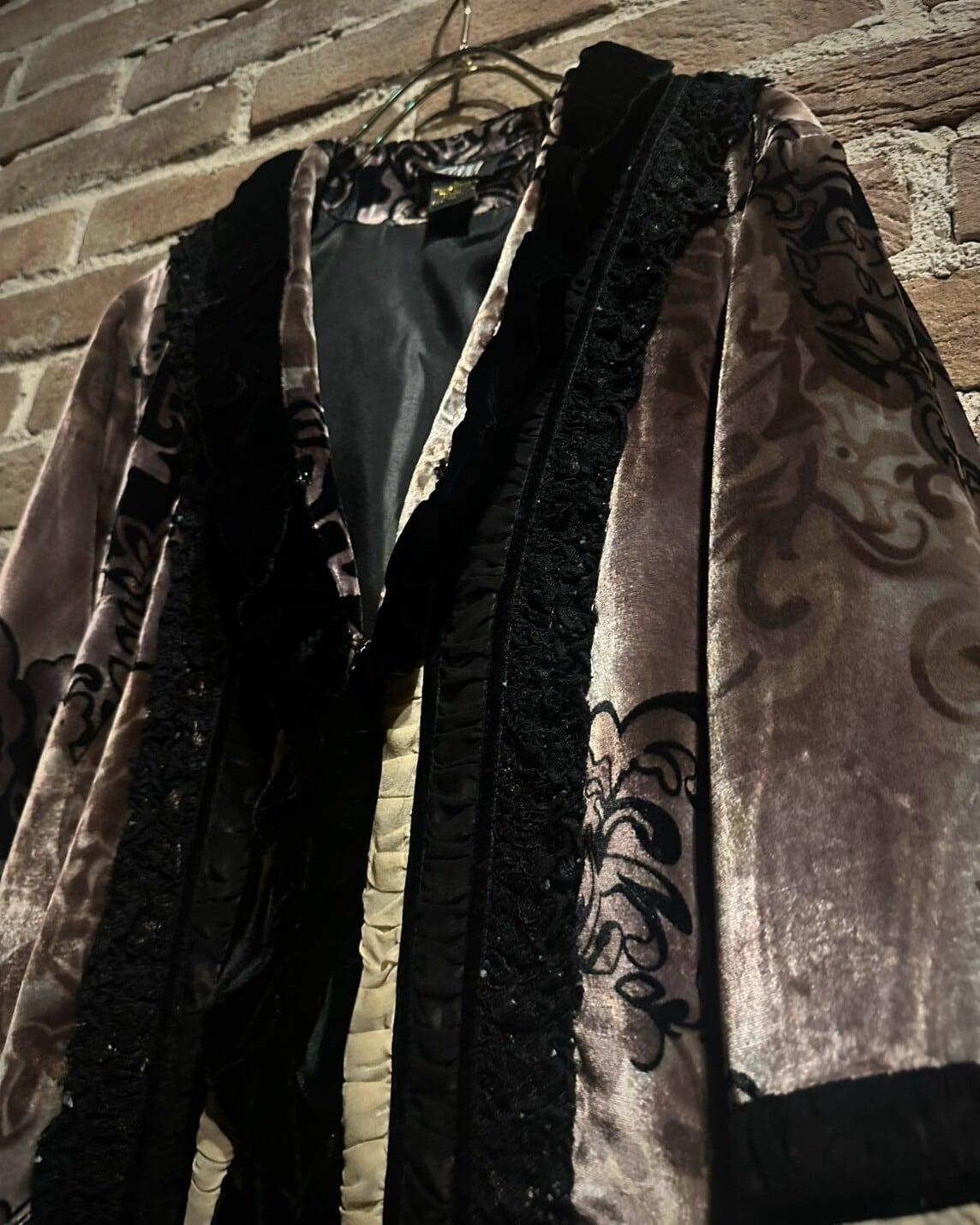 ダマスク柄があしらわれた、美しい光沢を帯びたベロア生地をボディのベースとし、レースやシアー素材による切り替えが随所に施されたジャケット。