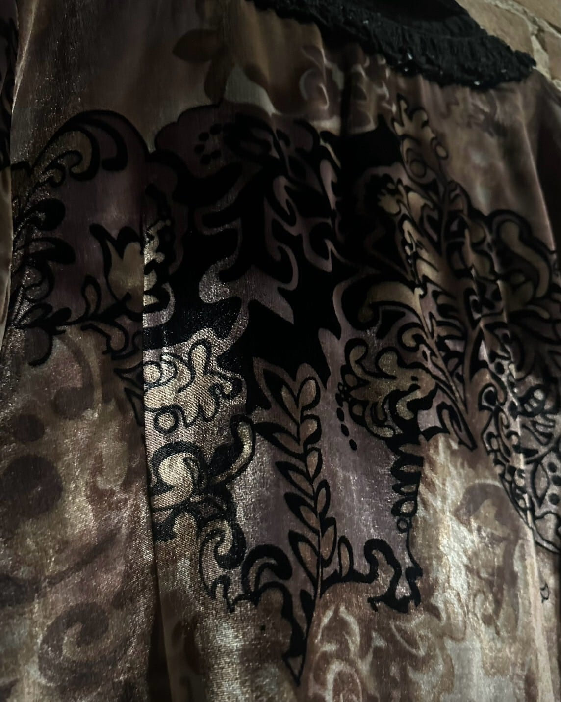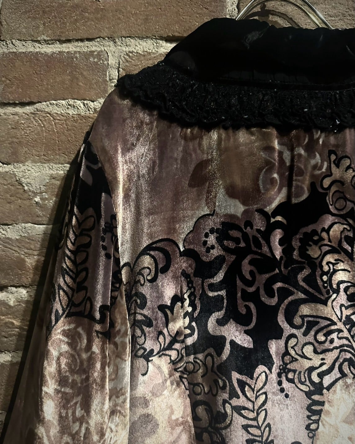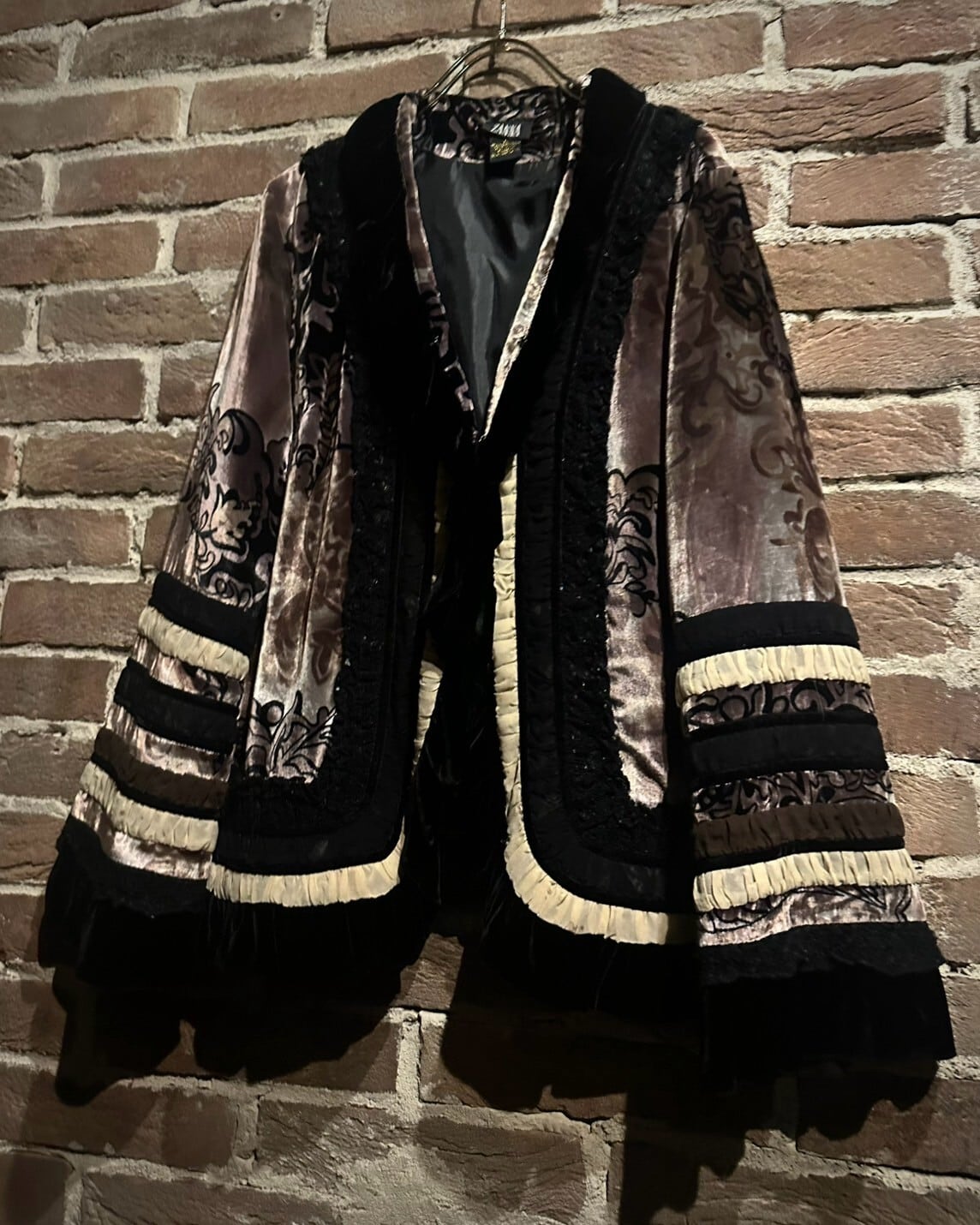 襟から裾、袖口にかけてはブラックベロアを用いたフリルを装飾することで、ラグジュアルな雰囲気をグッとUP。全体の色合い、異素材の合わせも非常に美しく、古着ならではの高いデザイン性に高級感を兼ね備えた仕上がりに。