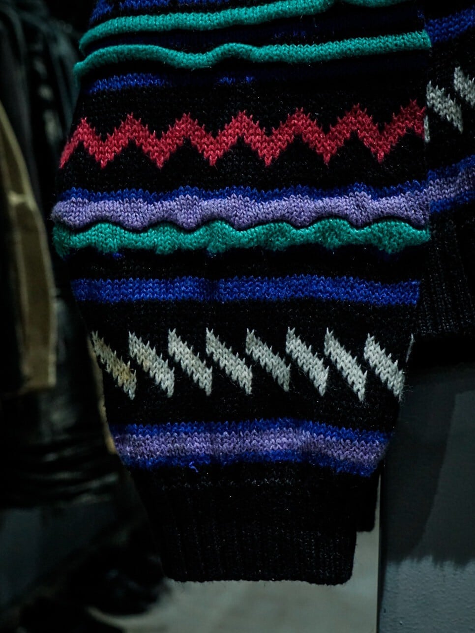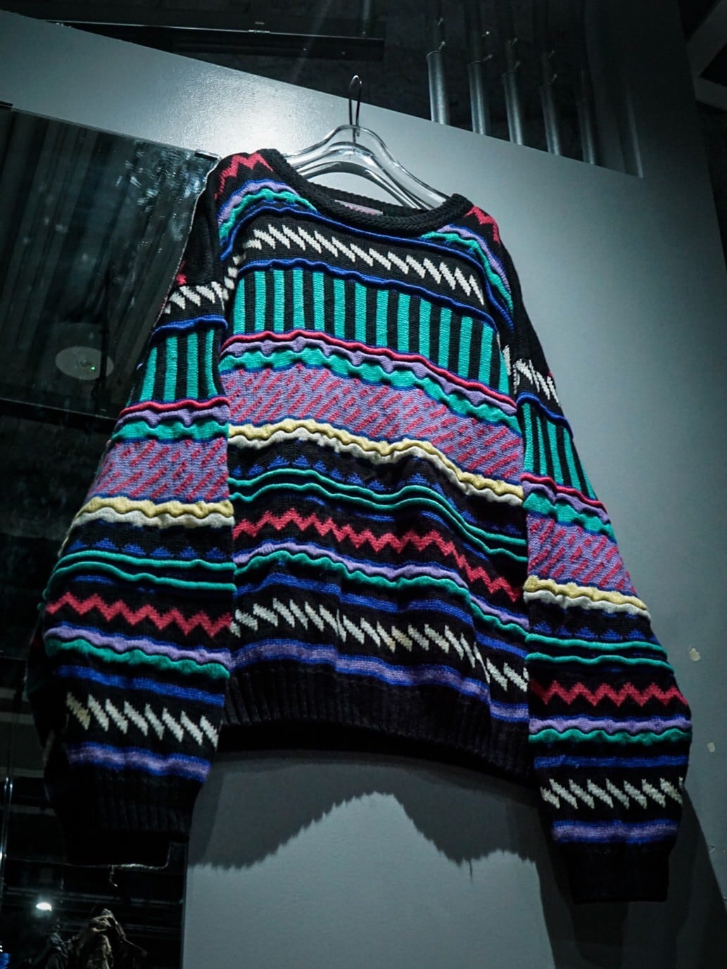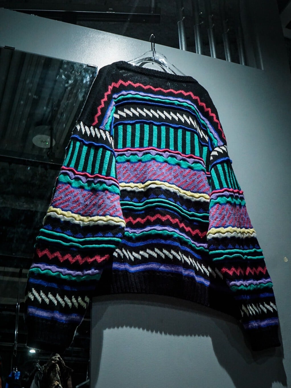 毒々しいカラーリングのマルチカラーで様々な柄をボーダー状に載せたプルオーバーニット。ベースはブラックなのでインパクトは強いですが纏まりはよく、様々なスタイルにアクセントとしてハマってくれます。