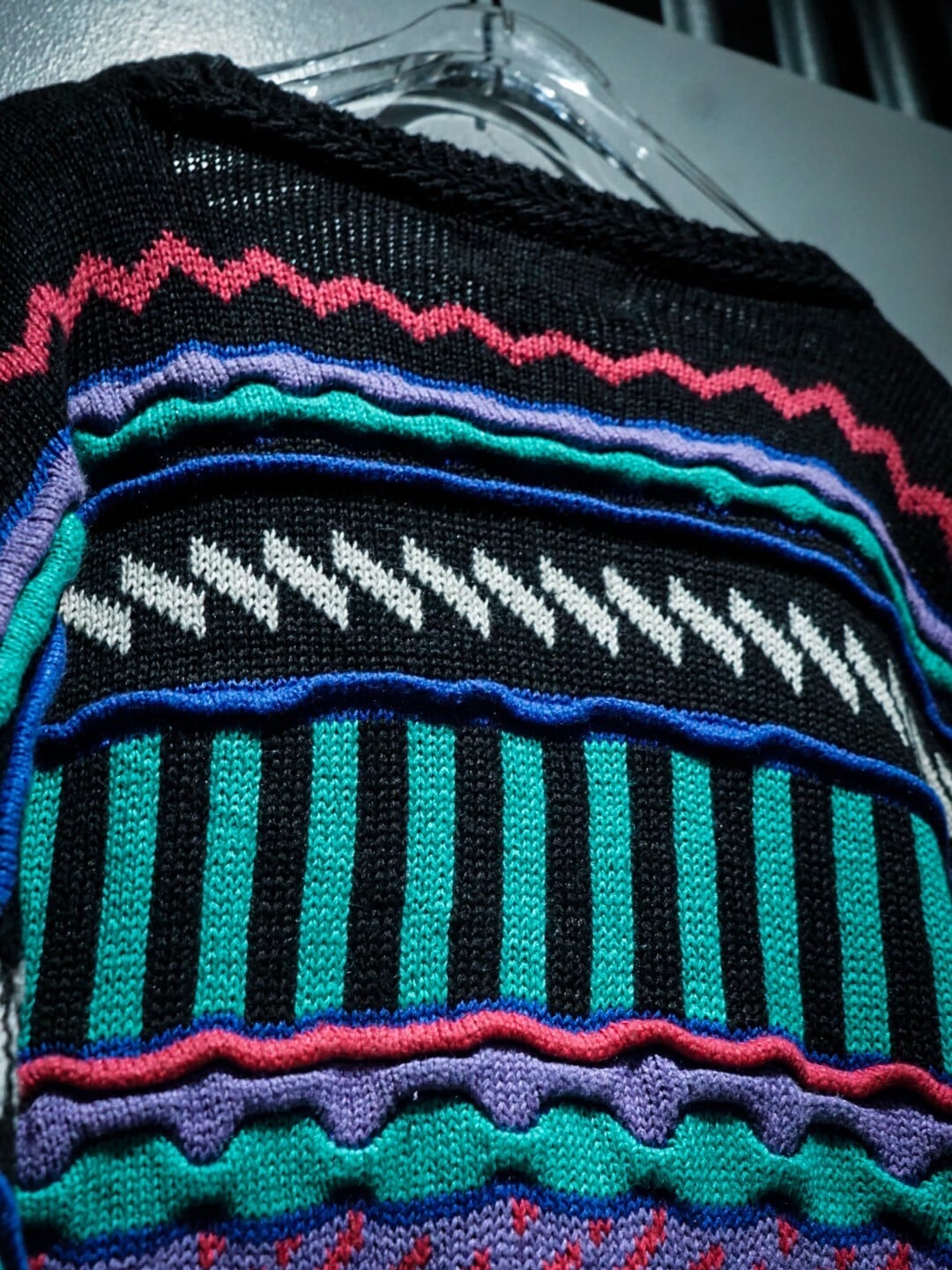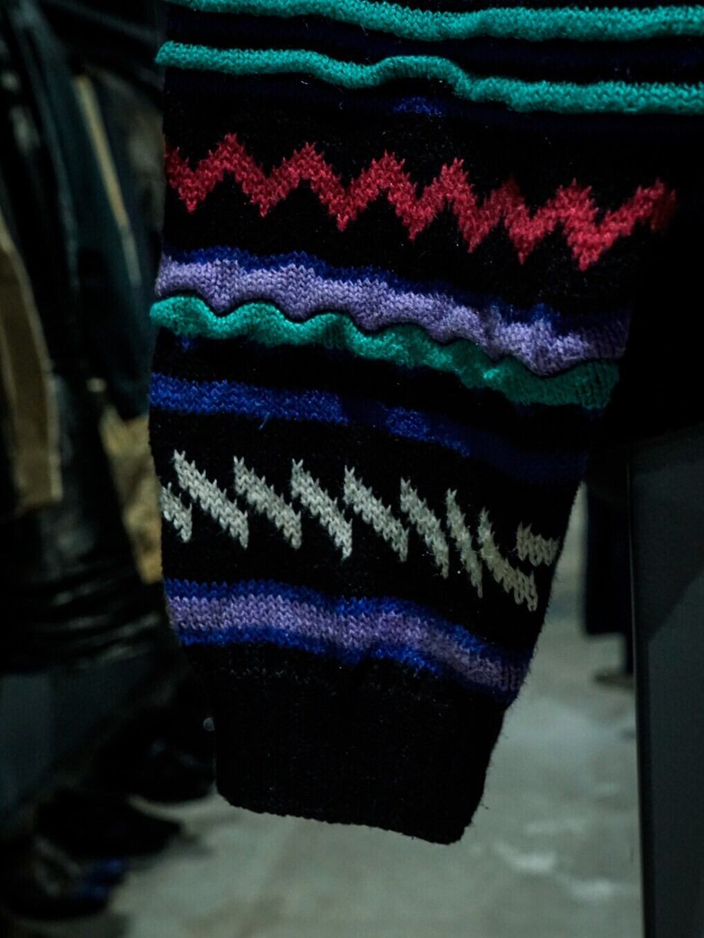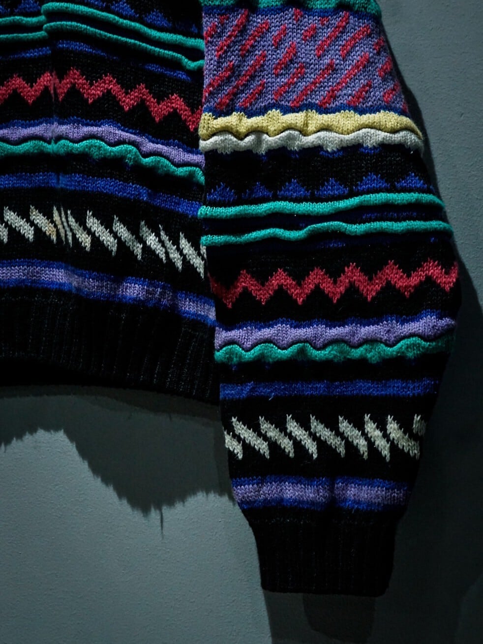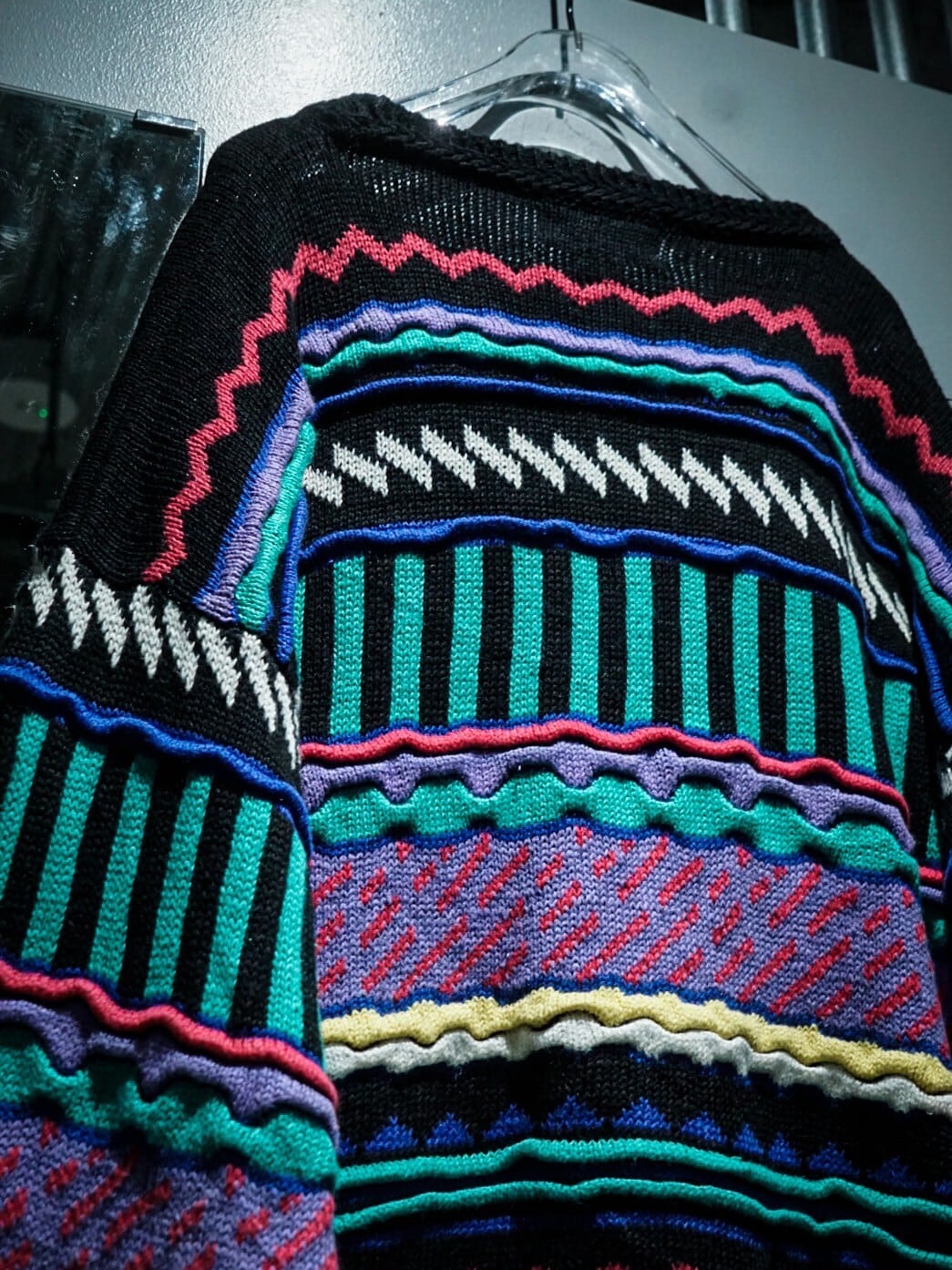 毒々しいカラーリングのマルチカラーで様々な柄をボーダー状に載せたプルオーバーニット。ベースはブラックなのでインパクトは強いですが纏まりはよく、様々なスタイルにアクセントとしてハマってくれます。