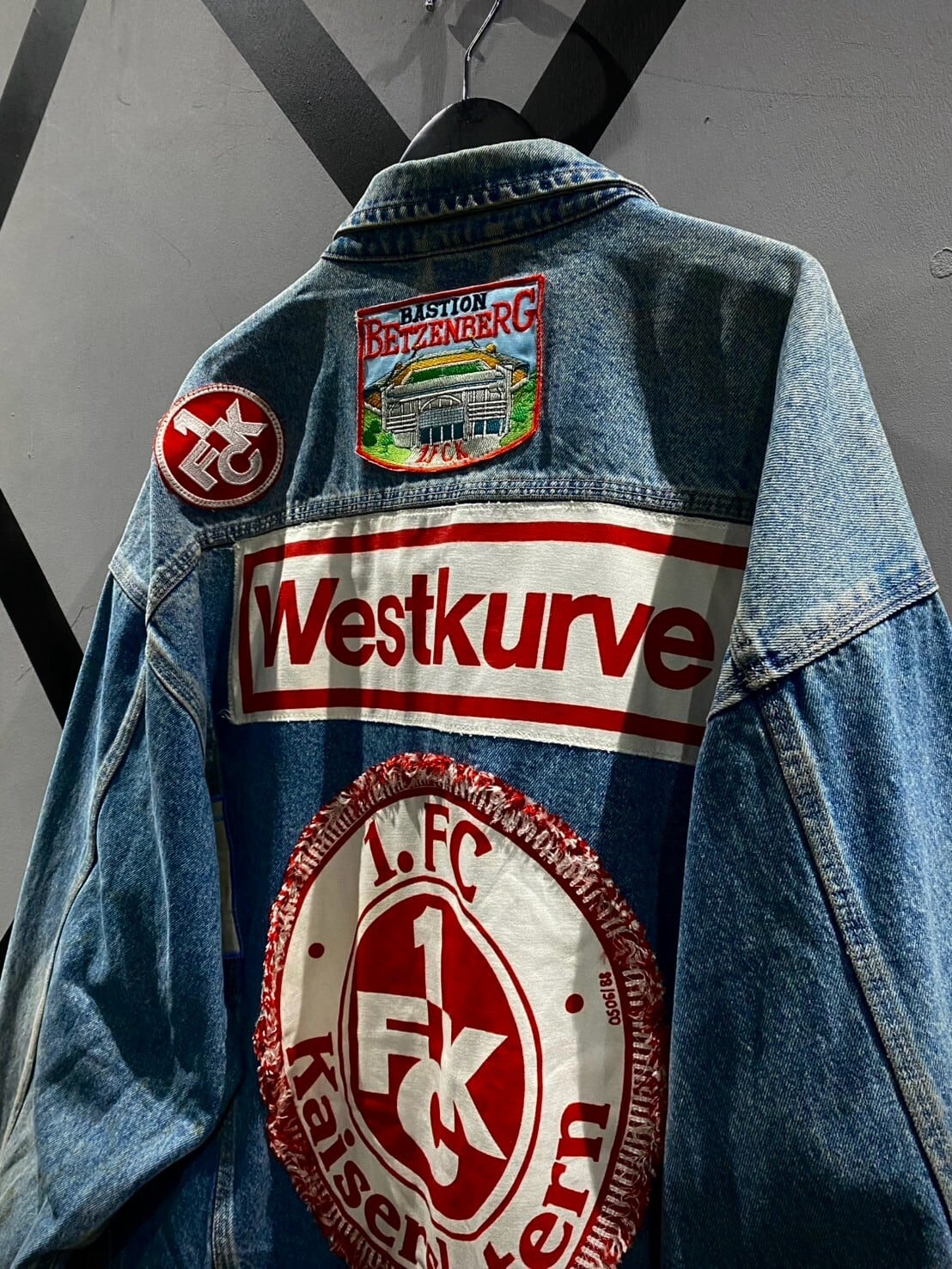 美しくフェードしたアイスブルーのデニムボディに、ドイツのサッカークラブであるFCカイザースラウテルンのワッペンを施したデニムジャケット。