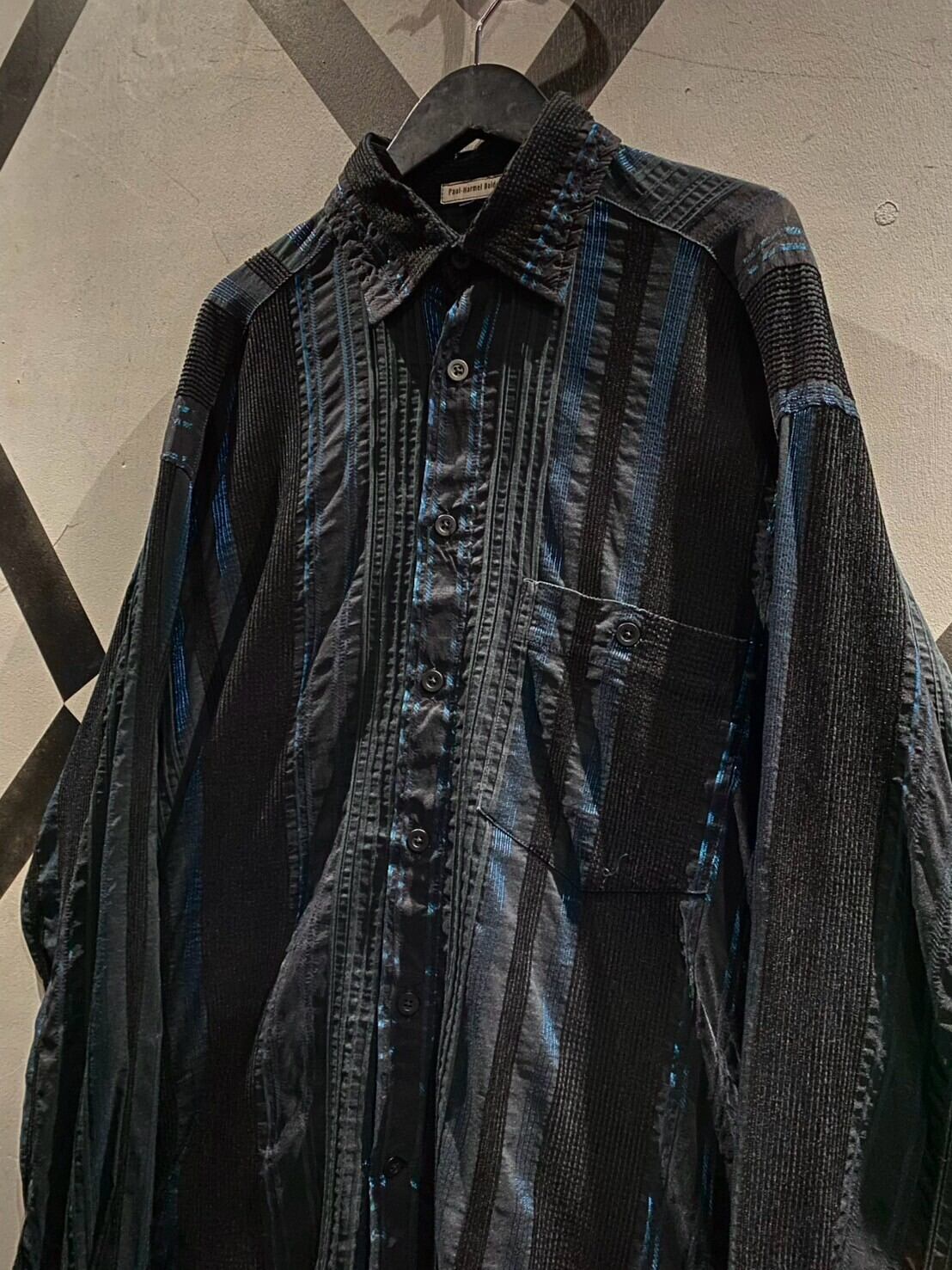 落ち着いた色使いの中に光沢を放つ青糸、サイジング全てがマッチして雰囲気をムンムンに漂わせる長袖シャツの逸品です。