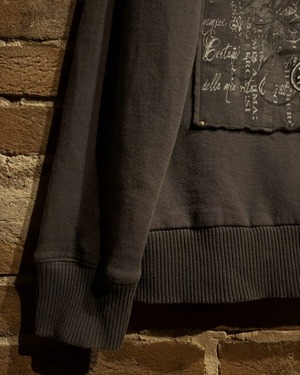 フェードグレーのボディをベースに、レタリング、ゴシックなプリントを載せたジップアップフーディ。