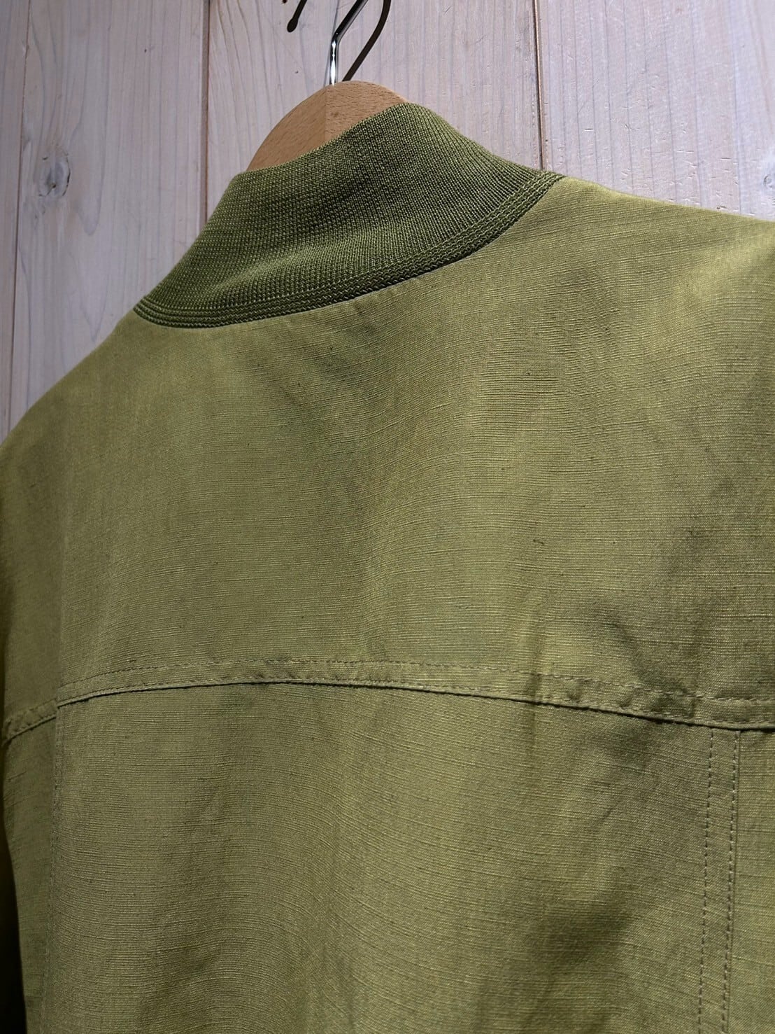 ハリ、柔らかさを兼ね備えたコットンやリネンなどを混紡素材を用いたバルスタージャケット。美しい黄緑色で春服の気分高まりますね。