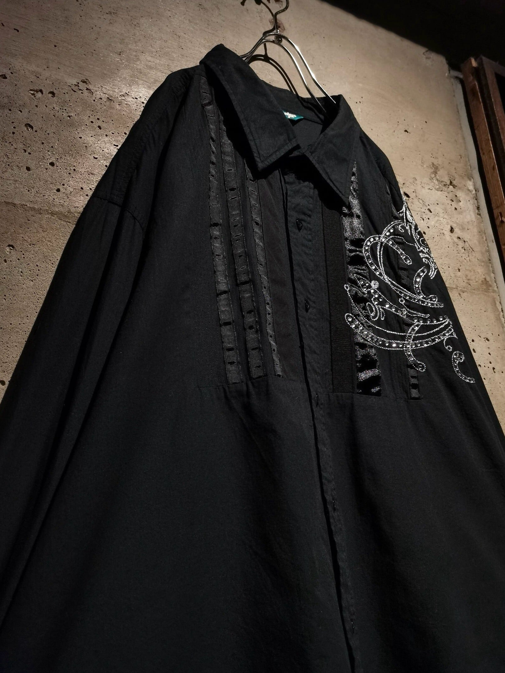 サラッとした黒のコットンボディに、フロントには光沢のあるテープの装飾、左肩周りにはシルバーの糸の刺繍とラインストーンによってボタニカルな柄を施した1着。