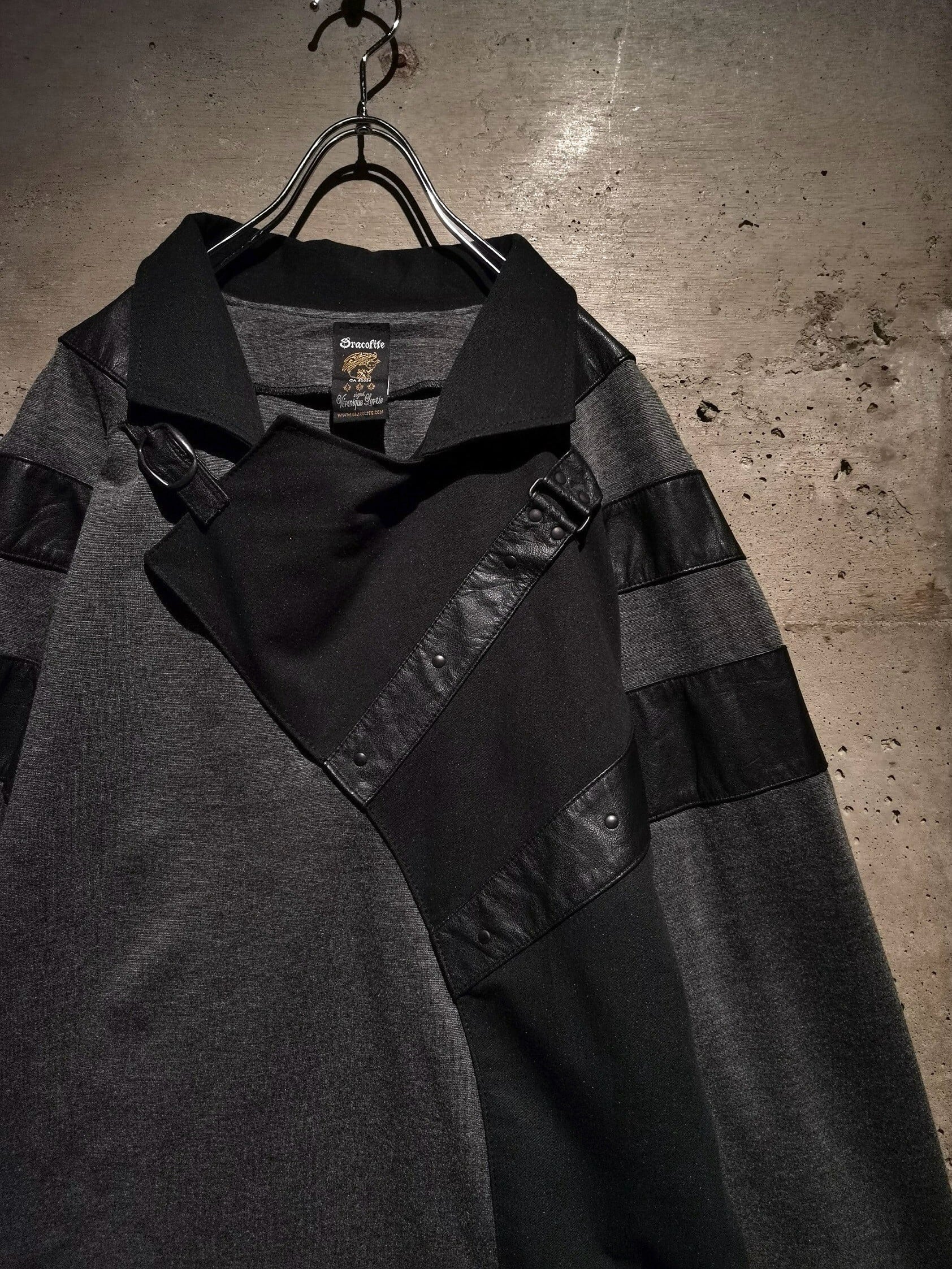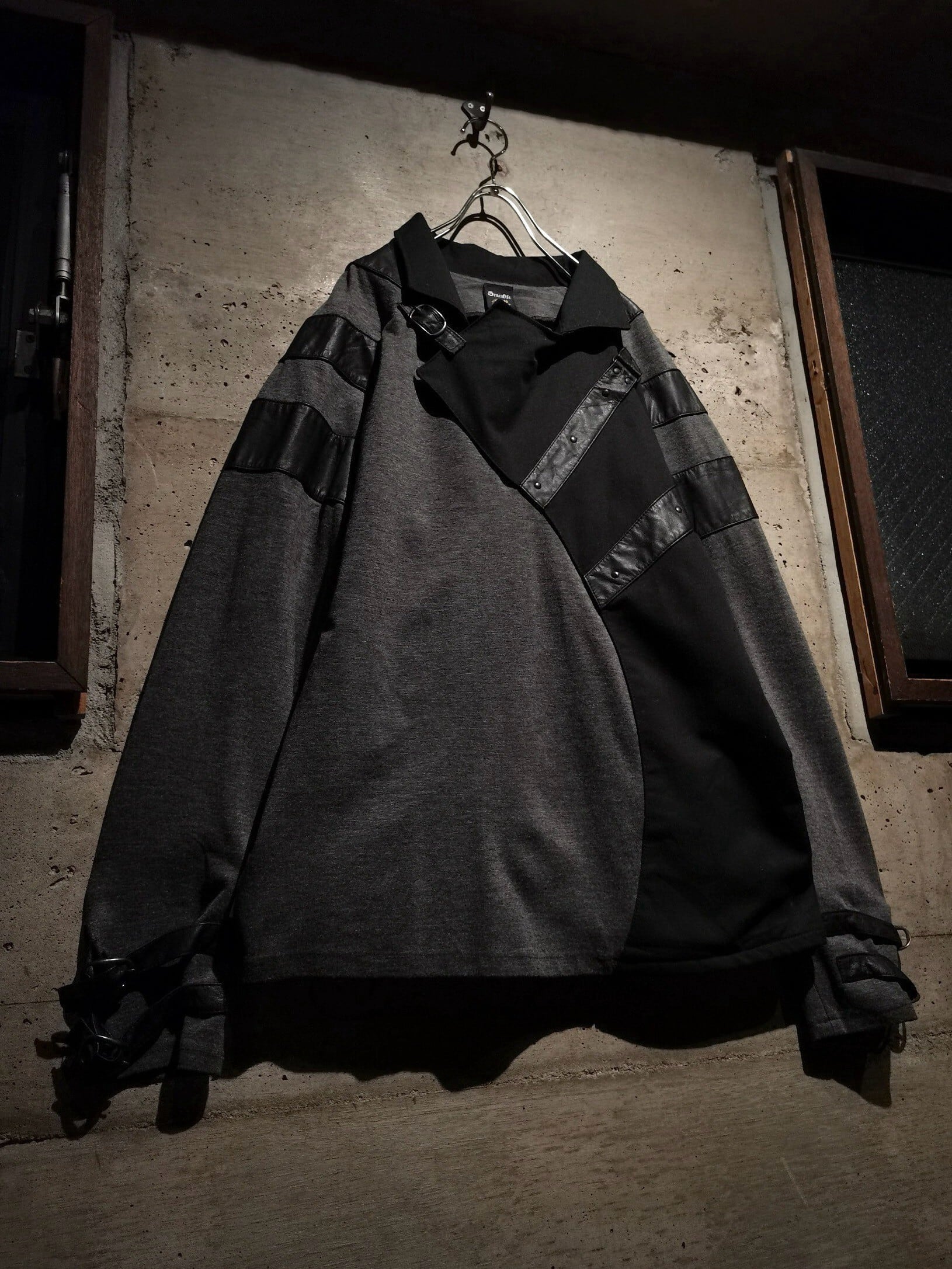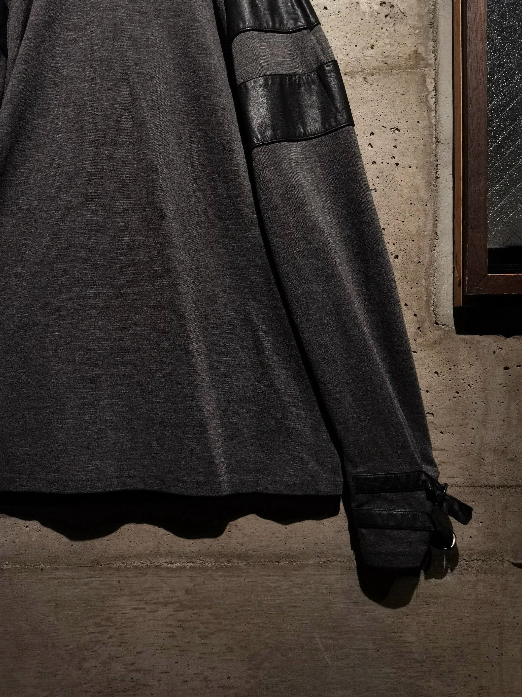 柔らかくツルッとしたグレーのボディをベースに、ハリのあるブラックのツイル生地とブラックのフェイクレザーを切り替えたプルオーバーシャツ。