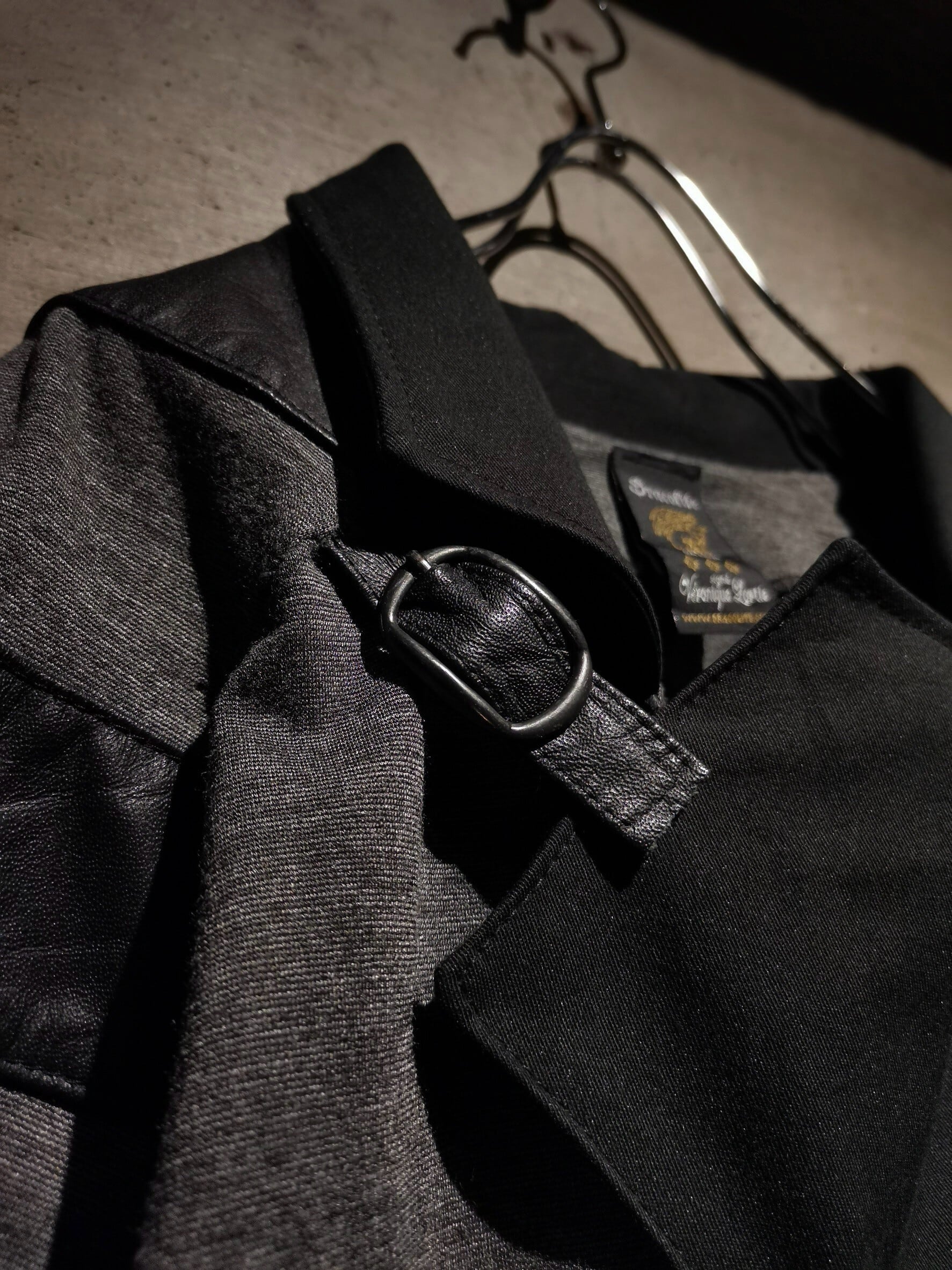 フロントには変形の前立てとベルトのデザインが施された1着。袖口にもレザーを切り替えた稀有なデザイン性。裾から脇にかけてコンシールファスナーが施され、両サイドに深いスリットを入れることも可能。