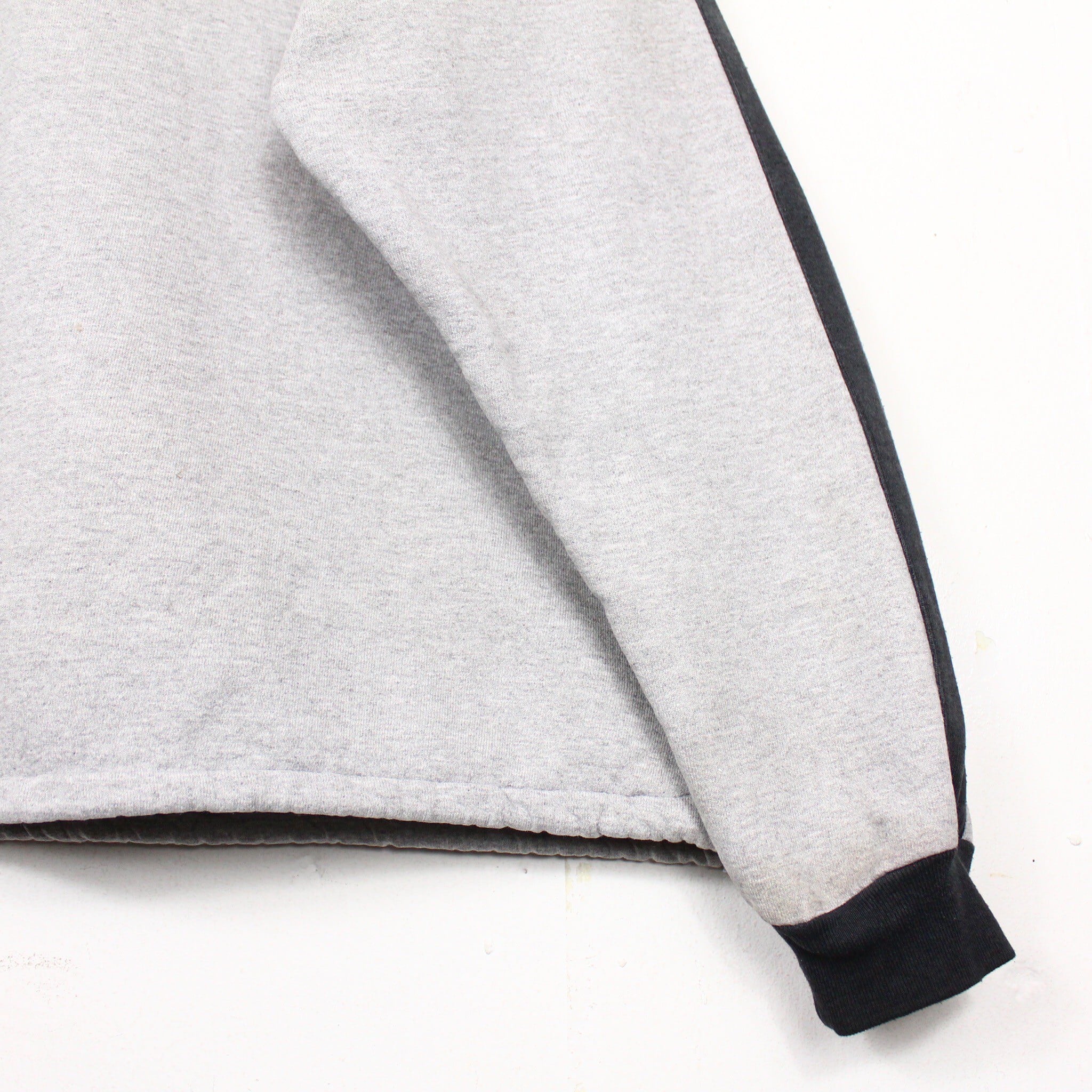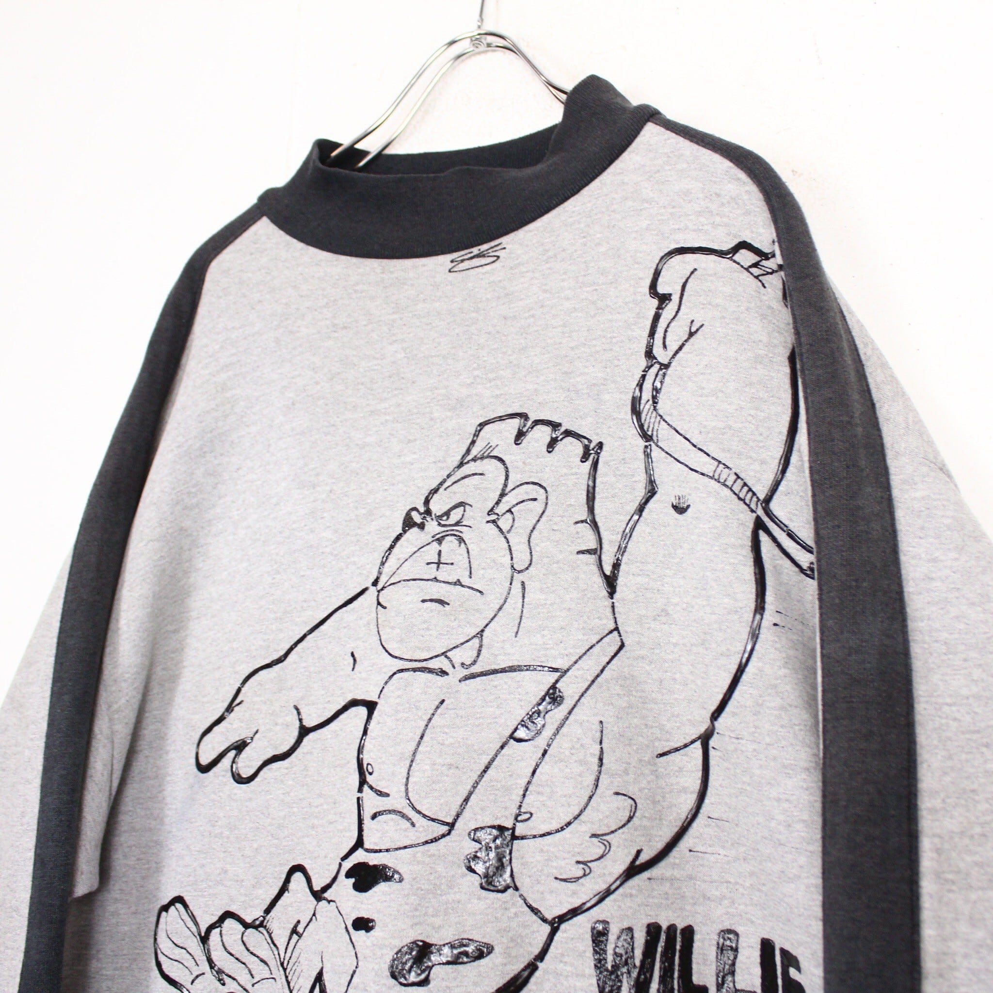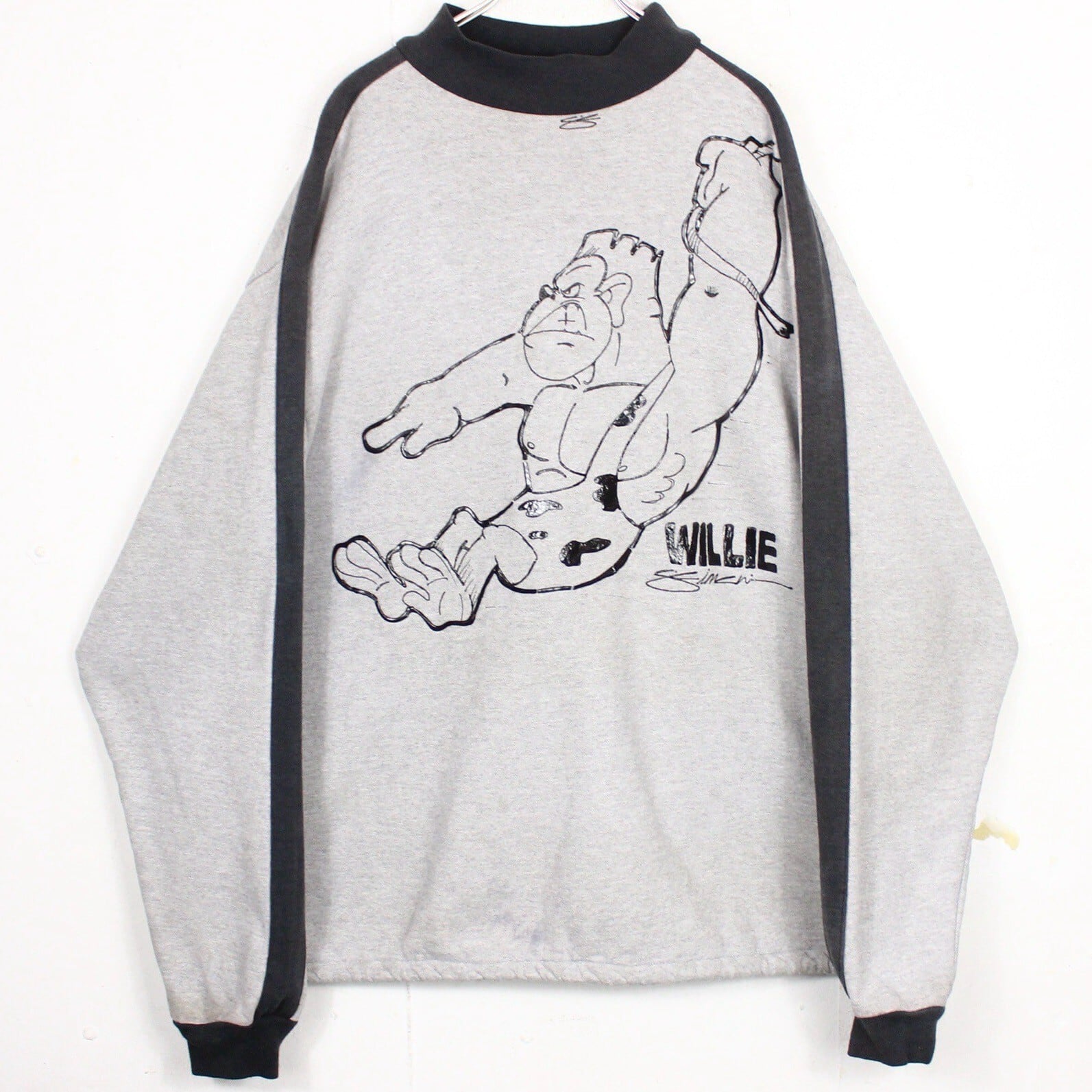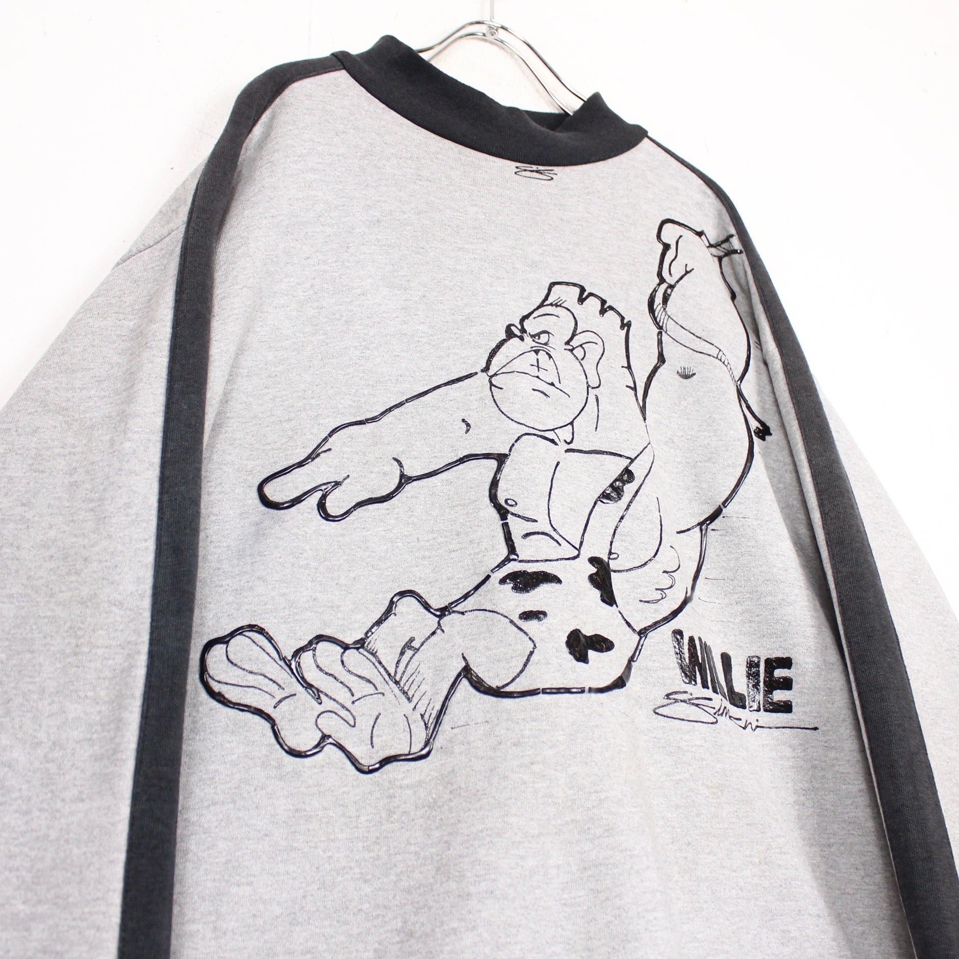 薄手のグレーのボディに、首元、アームに黒色を切り替え、フロントに躍動感のあるゴリラのイラストをラバー風のプリントで載せたスウェット。