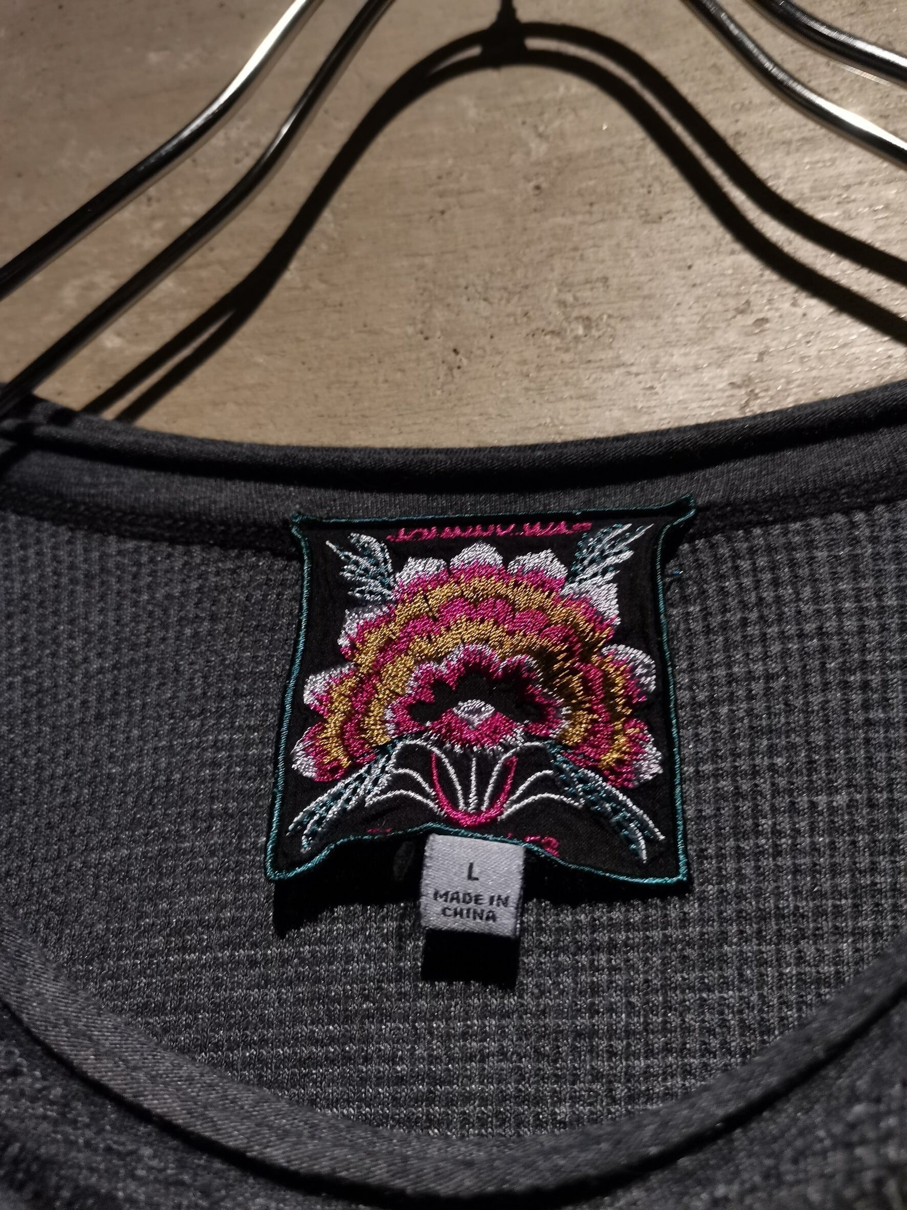 ダークグレーのサーマルボディをベースに、上品な花や鳥を繊細な刺繍によって刻み込んだサーマルロンT。