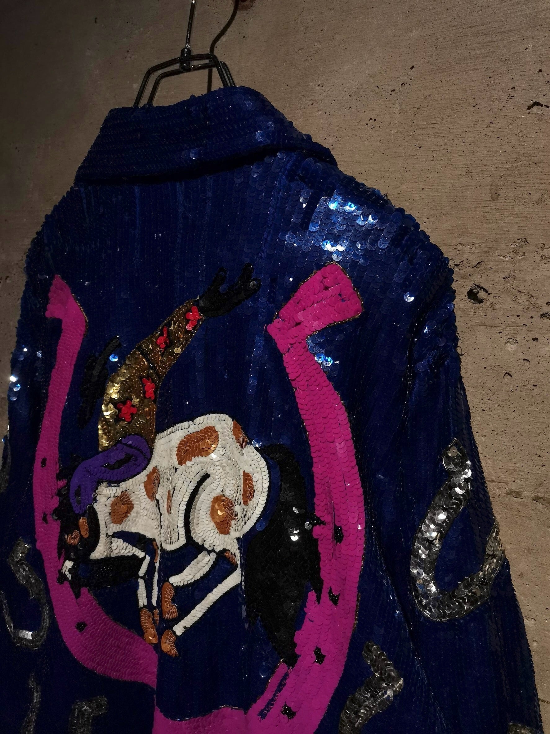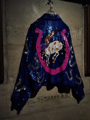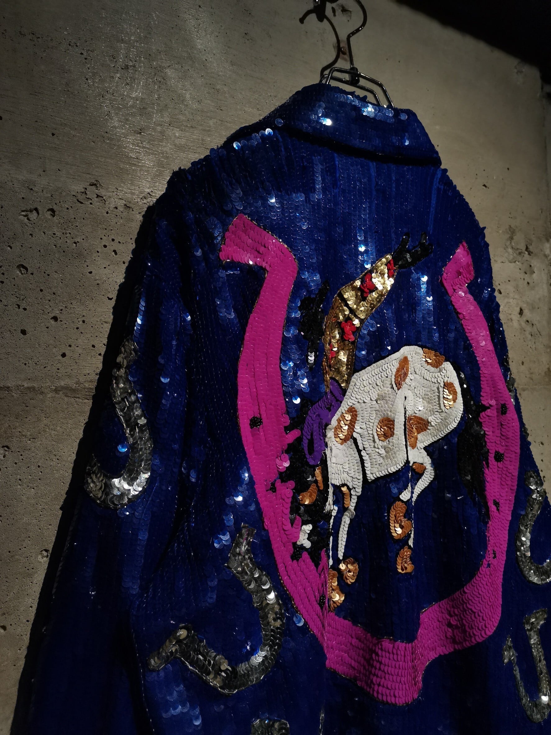 艶やかな光沢を放つ上質な素材を用いたボディに、スパンコールを全面みっちみちに敷き詰めたジャケット。