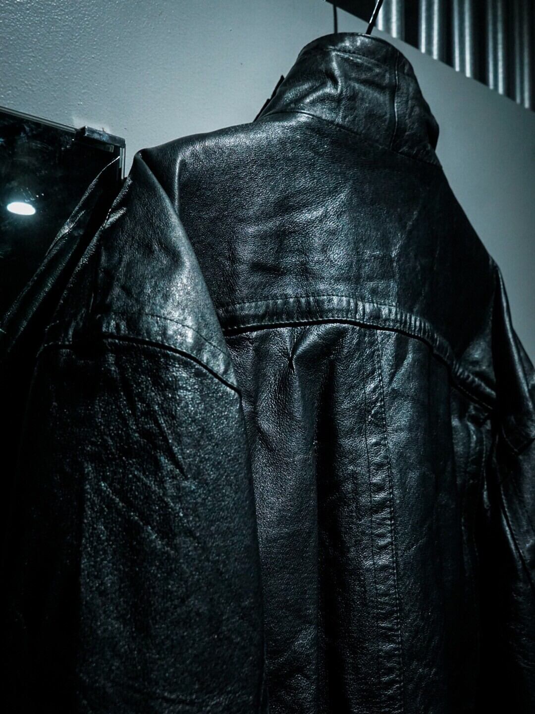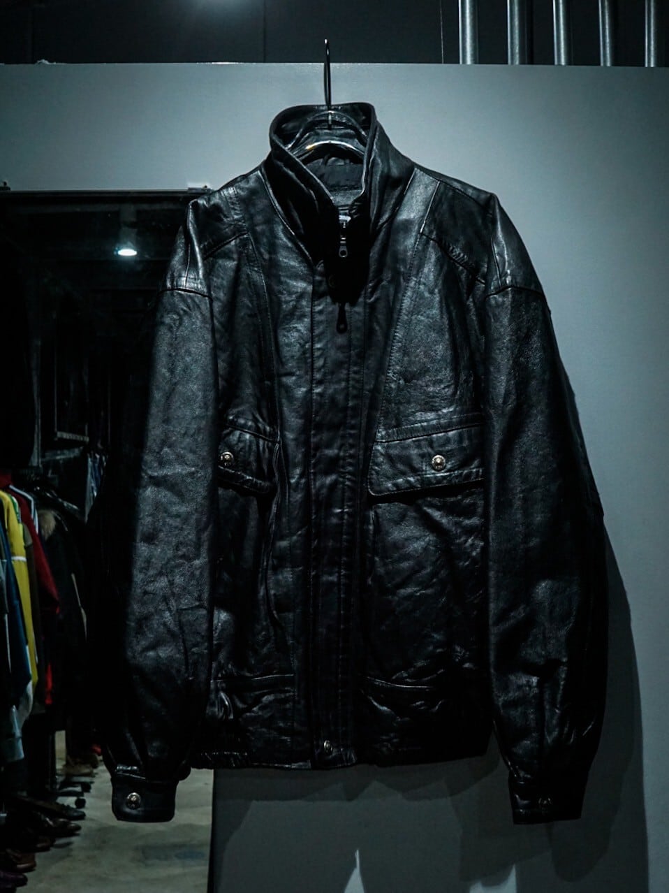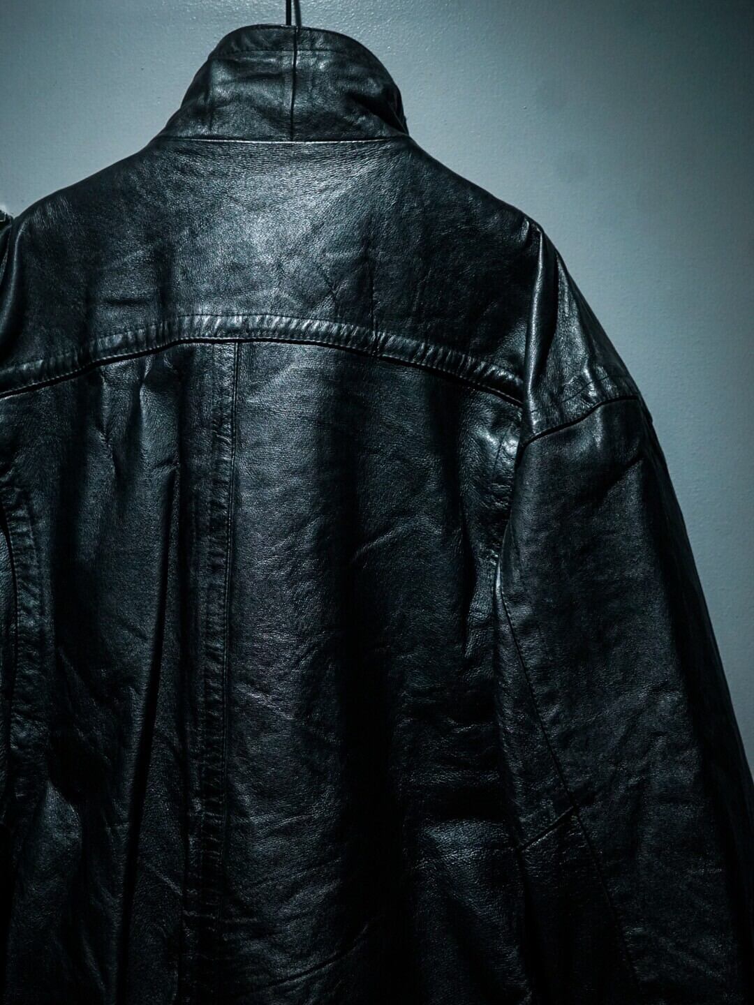 ハリがありながらも柔らかい、上質なブラックレザーを用いた、高級感を存分に漂わせる稀有なハイネック仕様のレザージャケット。
