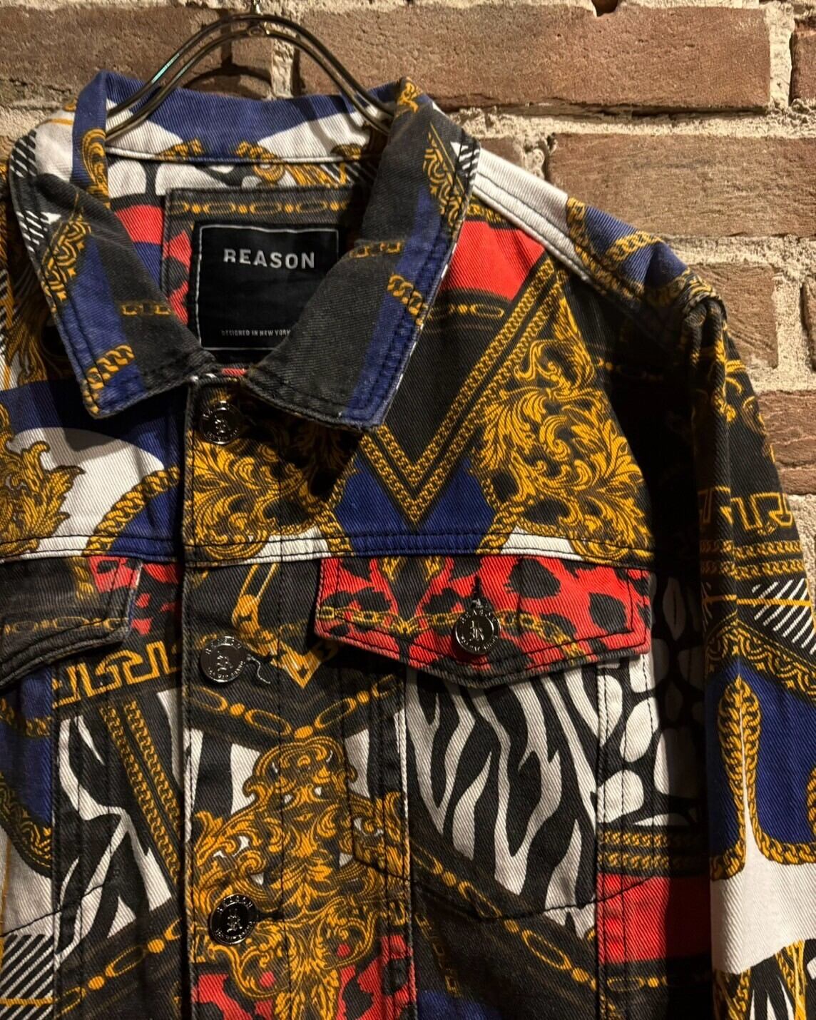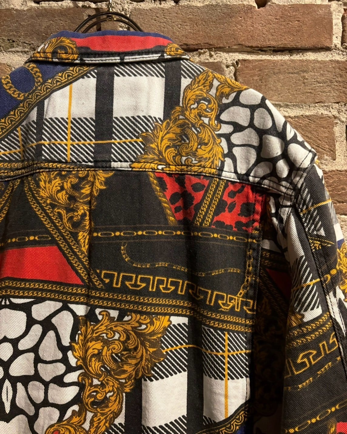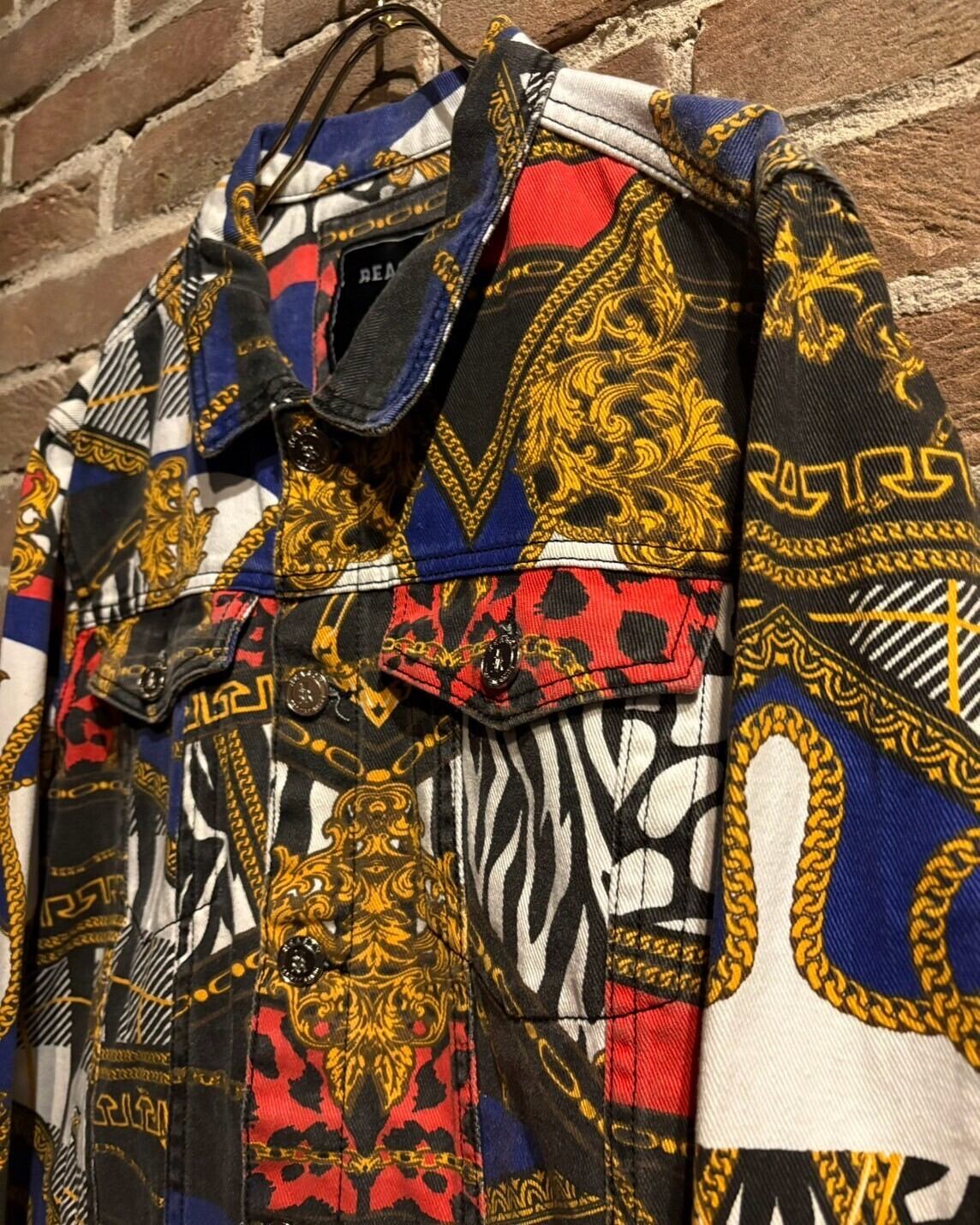 様々な柄模様を重ねた奥行きに加えて、カジュアルなトラッカー型のデニムジャケットに高級感のあるデザインを落とし込んだ、デザインバランスが素晴らしい1着。