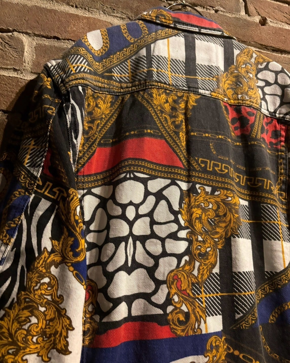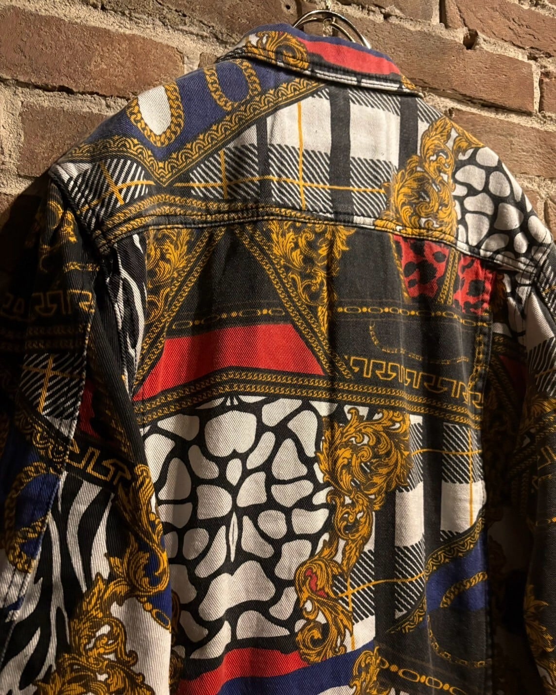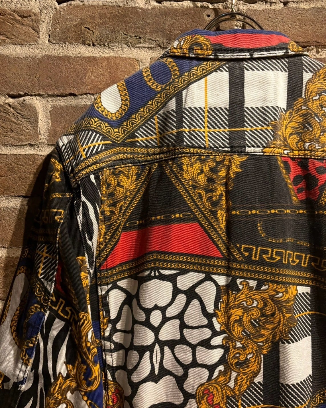 様々な柄模様を重ねた奥行きに加えて、カジュアルなトラッカー型のデニムジャケットに高級感のあるデザインを落とし込んだ、デザインバランスが素晴らしい1着。