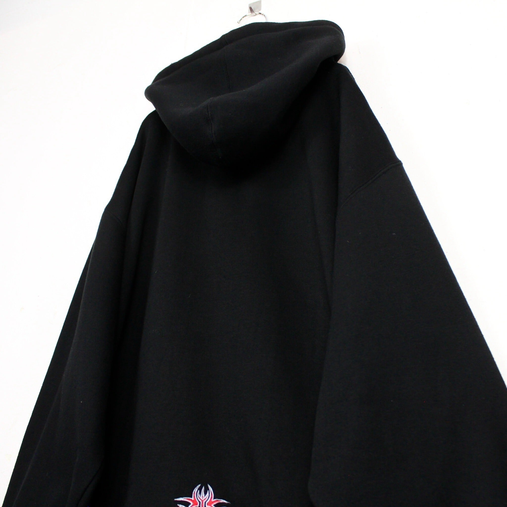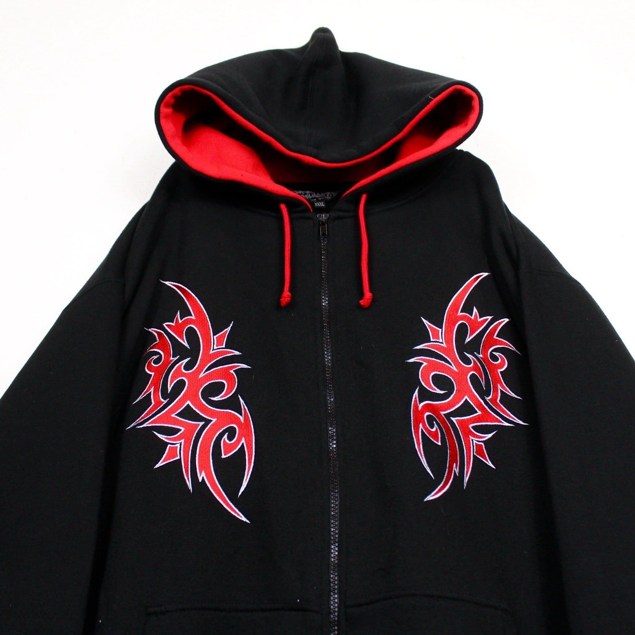 ブラックのボディをベースに、フロント、背面裾付近に真紅のカラーリングでトライバル柄の刺繍を刻んだフーディ。