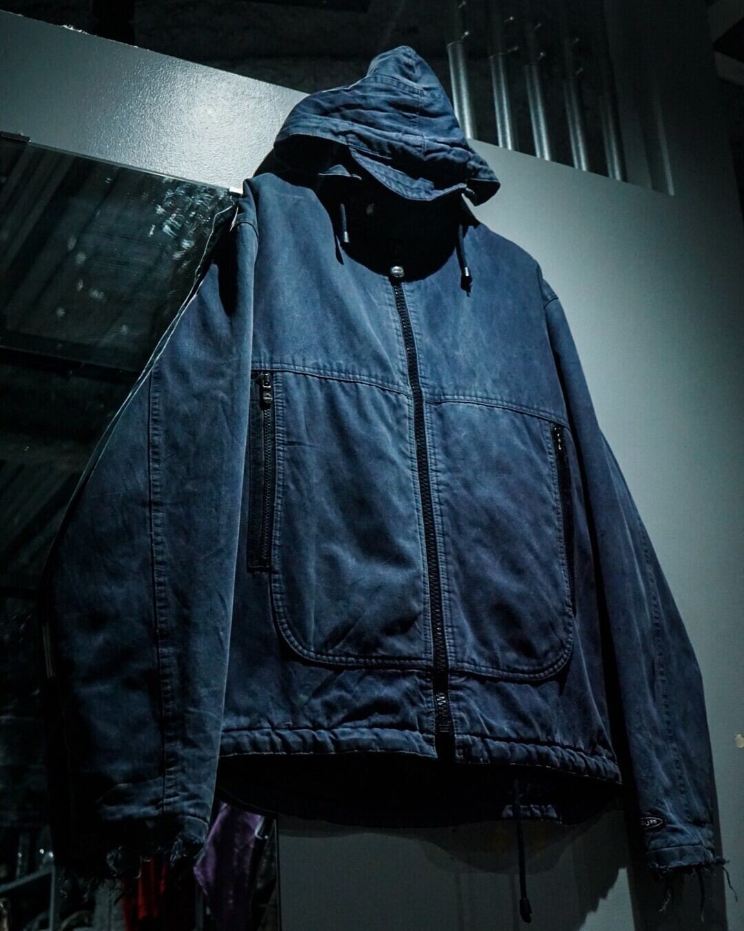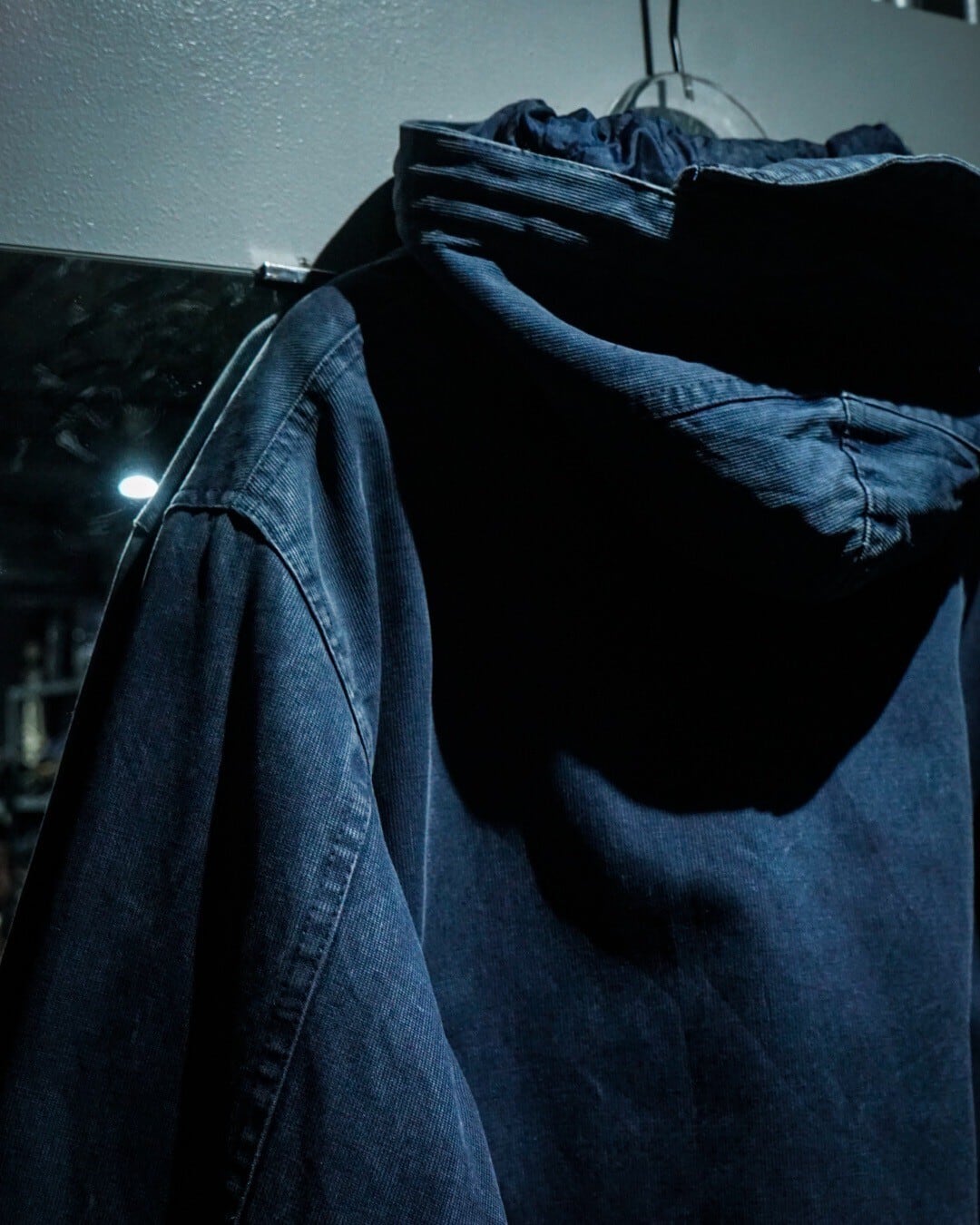 特有の表情を持つインディゴのタフな素材をボディに使用し、様々なギミックを載せたフーディージャケット。