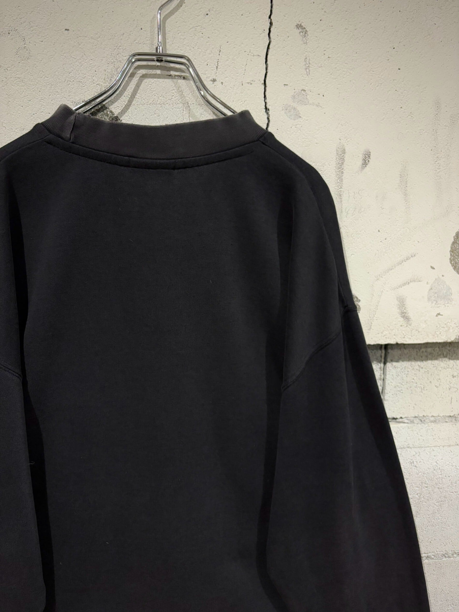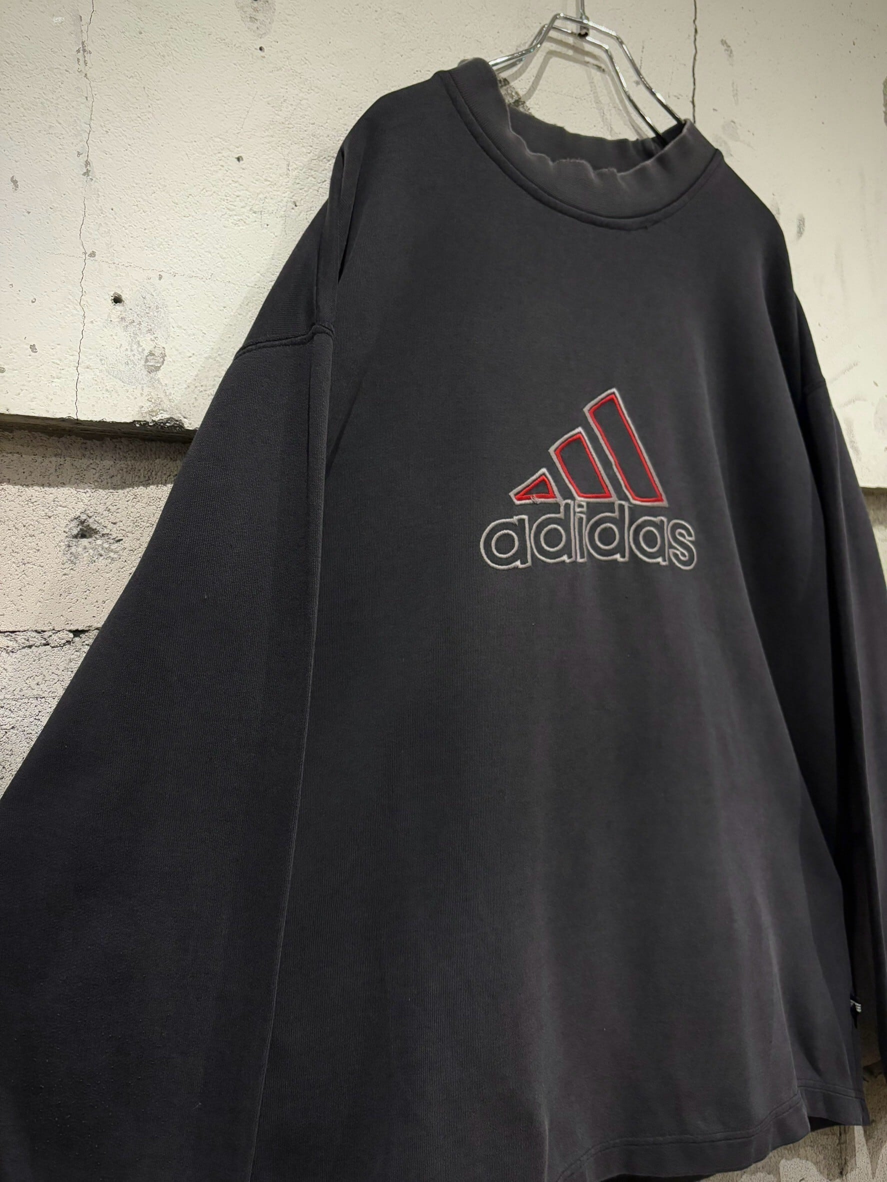 エイジングによる美しいフェードが効いた墨黒のボディに、ブランドネーム、トレフォイルロゴを刺繍で刻んだ90's adidasのスウェット。