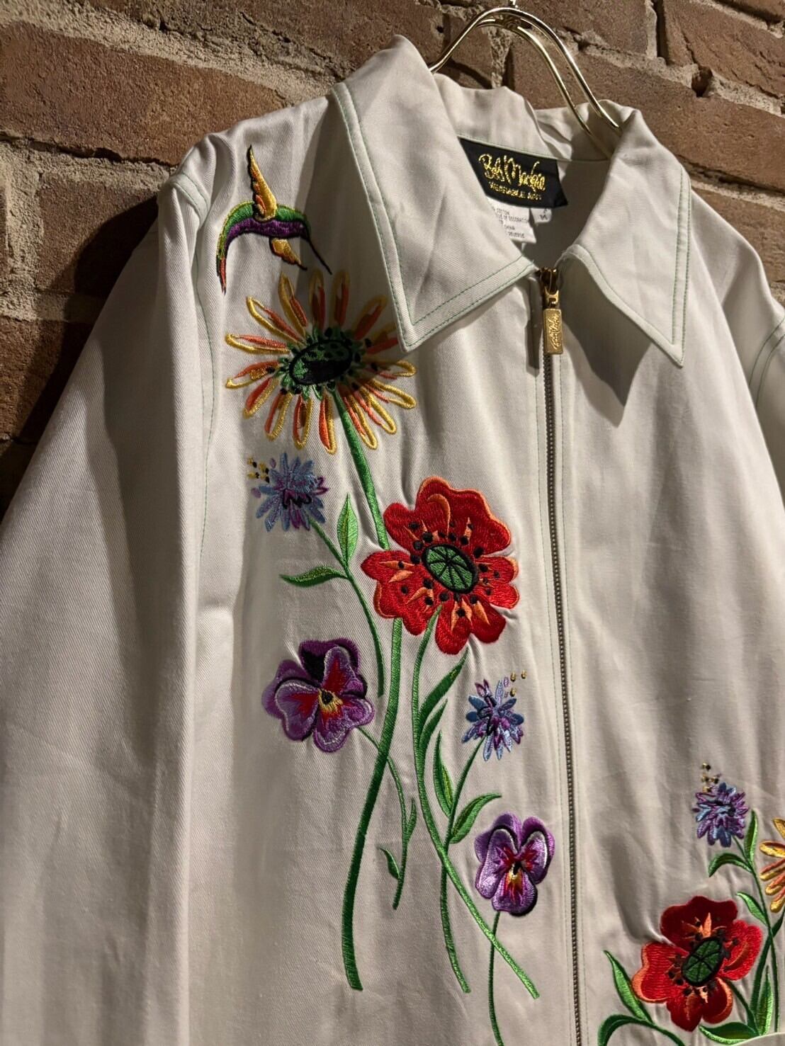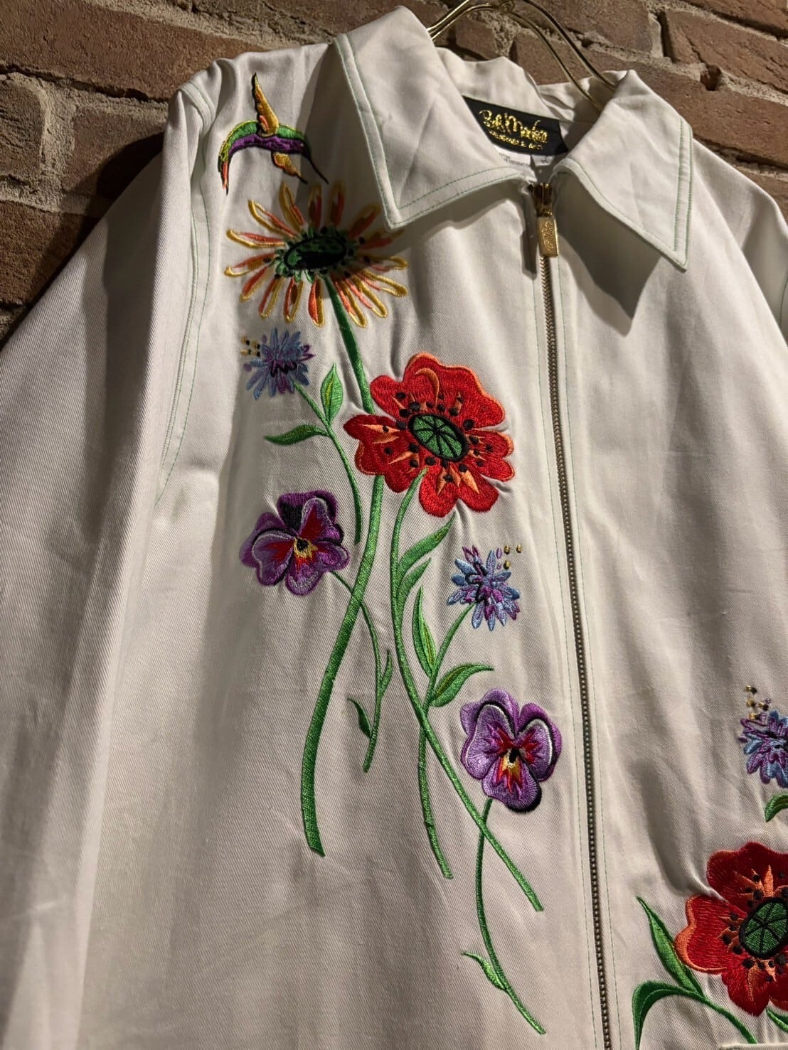ホワイトのボディに生える華やかな花が非常に美しい、、、ポケットに花が入っているようにデザインされており、遊び心が窺えます。そしてもはや作品とも言える刺繍のクオリティの高さ、圧巻です。