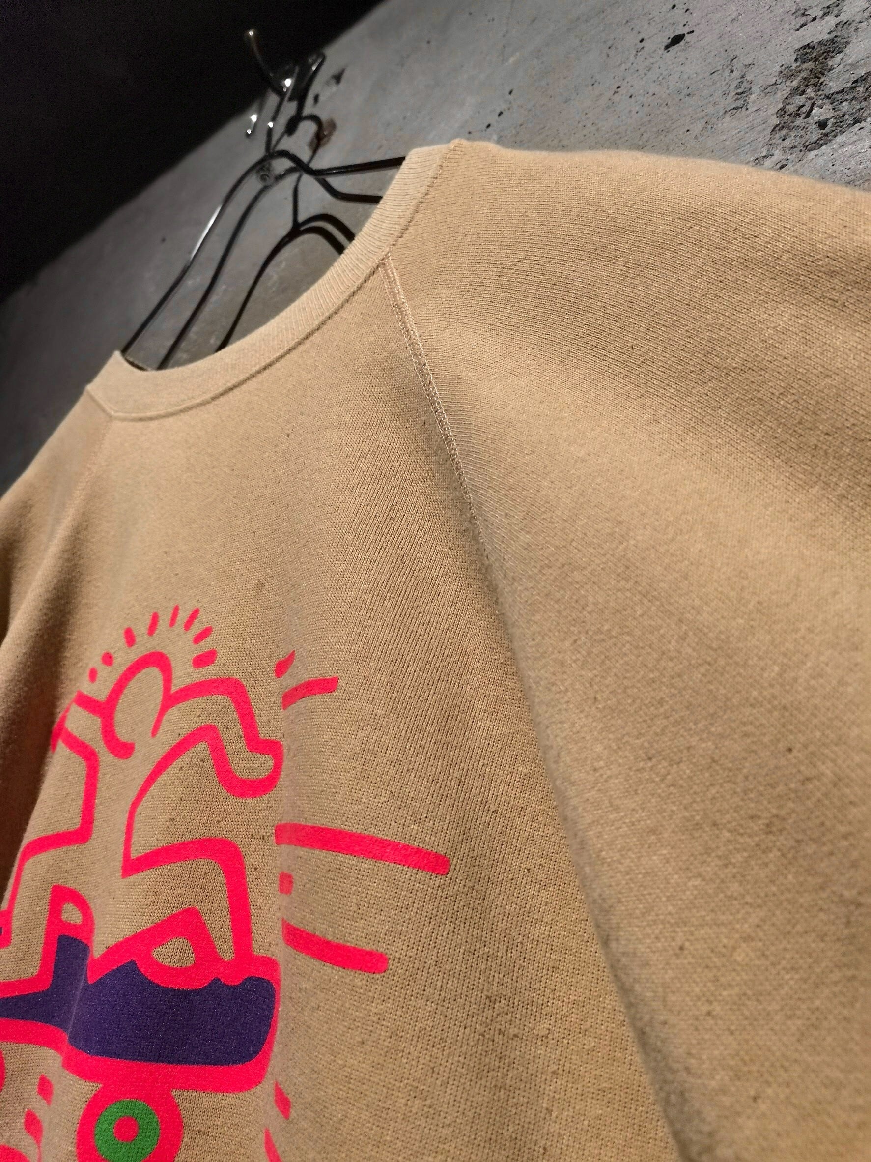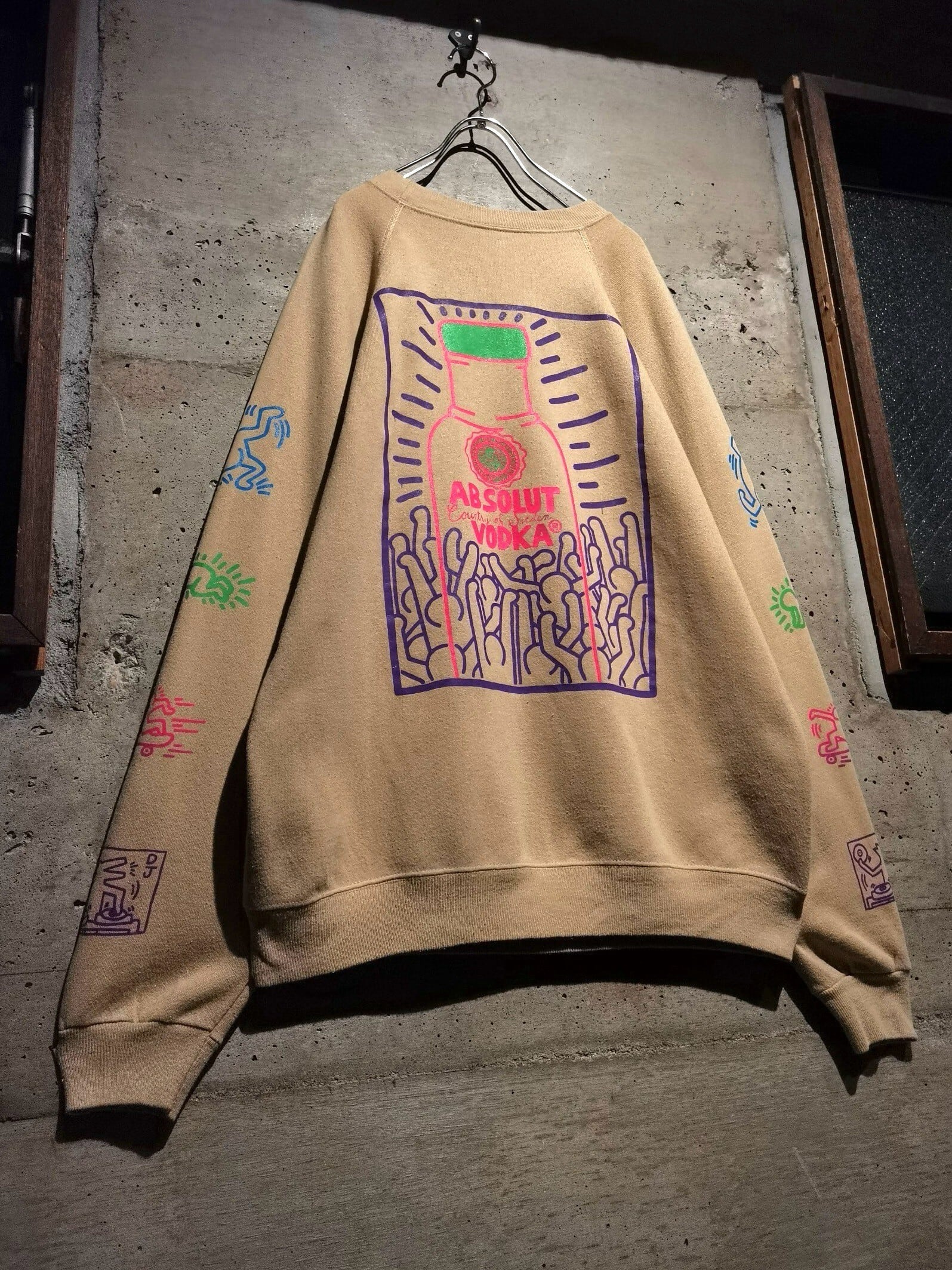 ベージュのスウェットボディに、1986年にキースヘリングが作成したアブソルートウォッカの広告デザインを載せた1着。