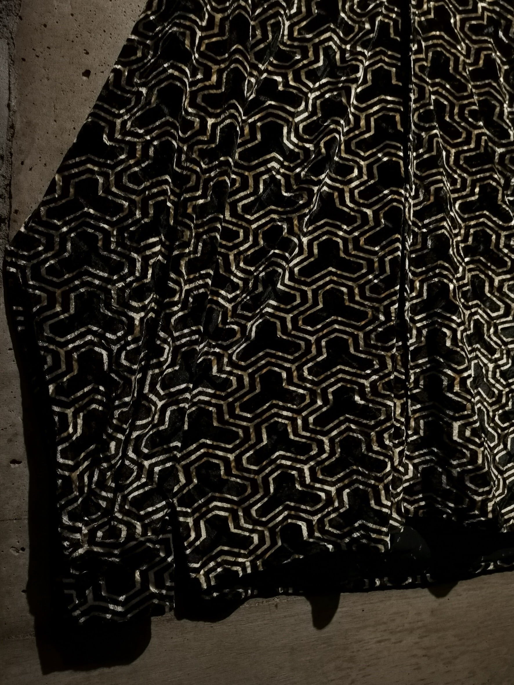 上品な見栄えに加え軽やかな着心地を誇るベロア生地に幾何学模様を載せた、当店ならではのモードな雰囲気漂う1着です。