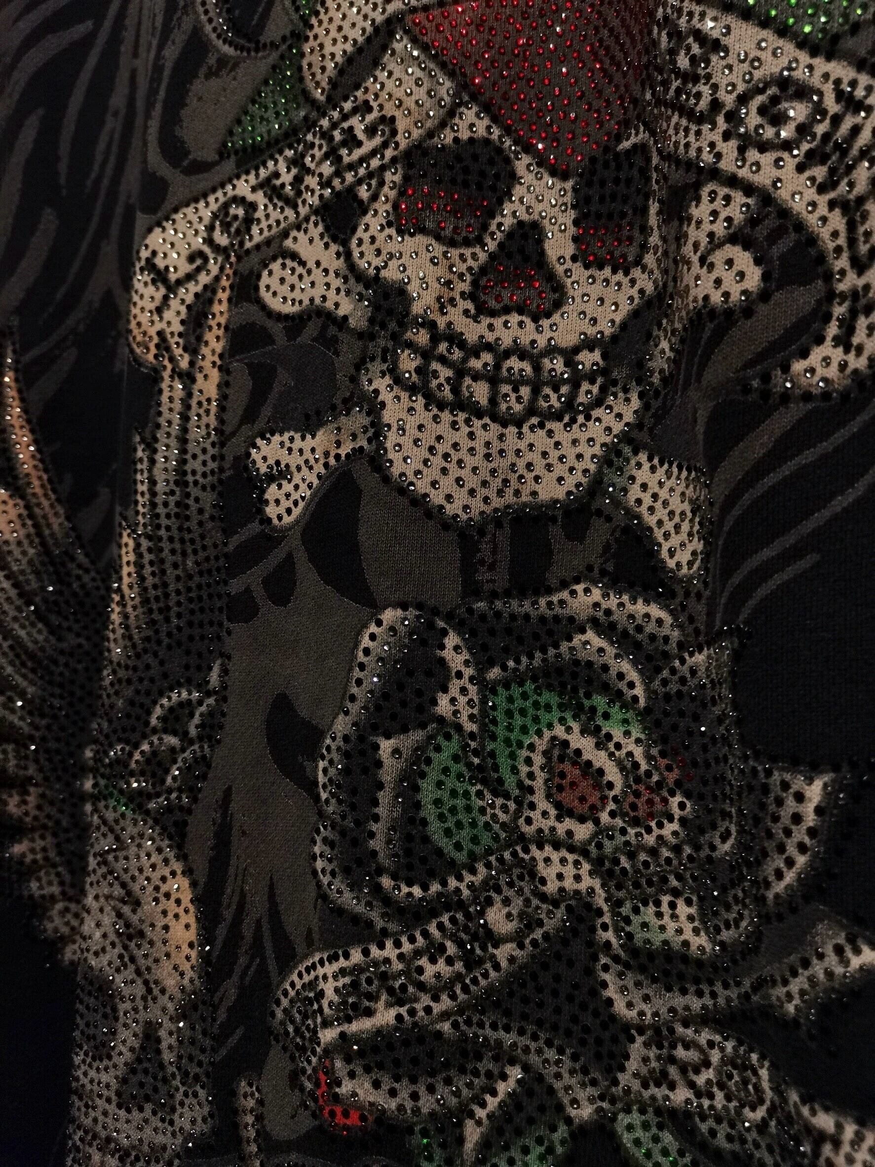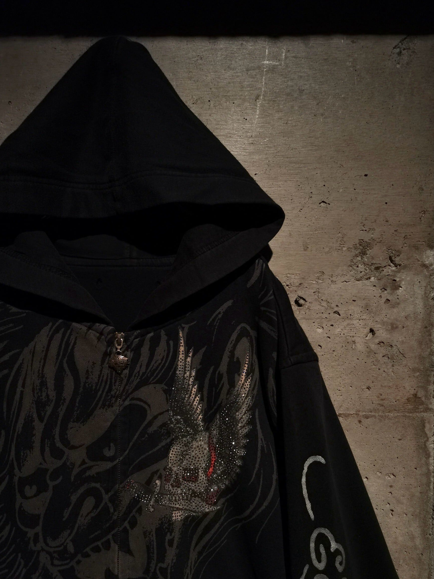ブラックのスウェットボディをベースに、前後に大判な鬼の顔のプリントをON。その上からスカルをベースとしたオールドスクールなデザインをプリント×ラインストーンで施したジップフーディー。
