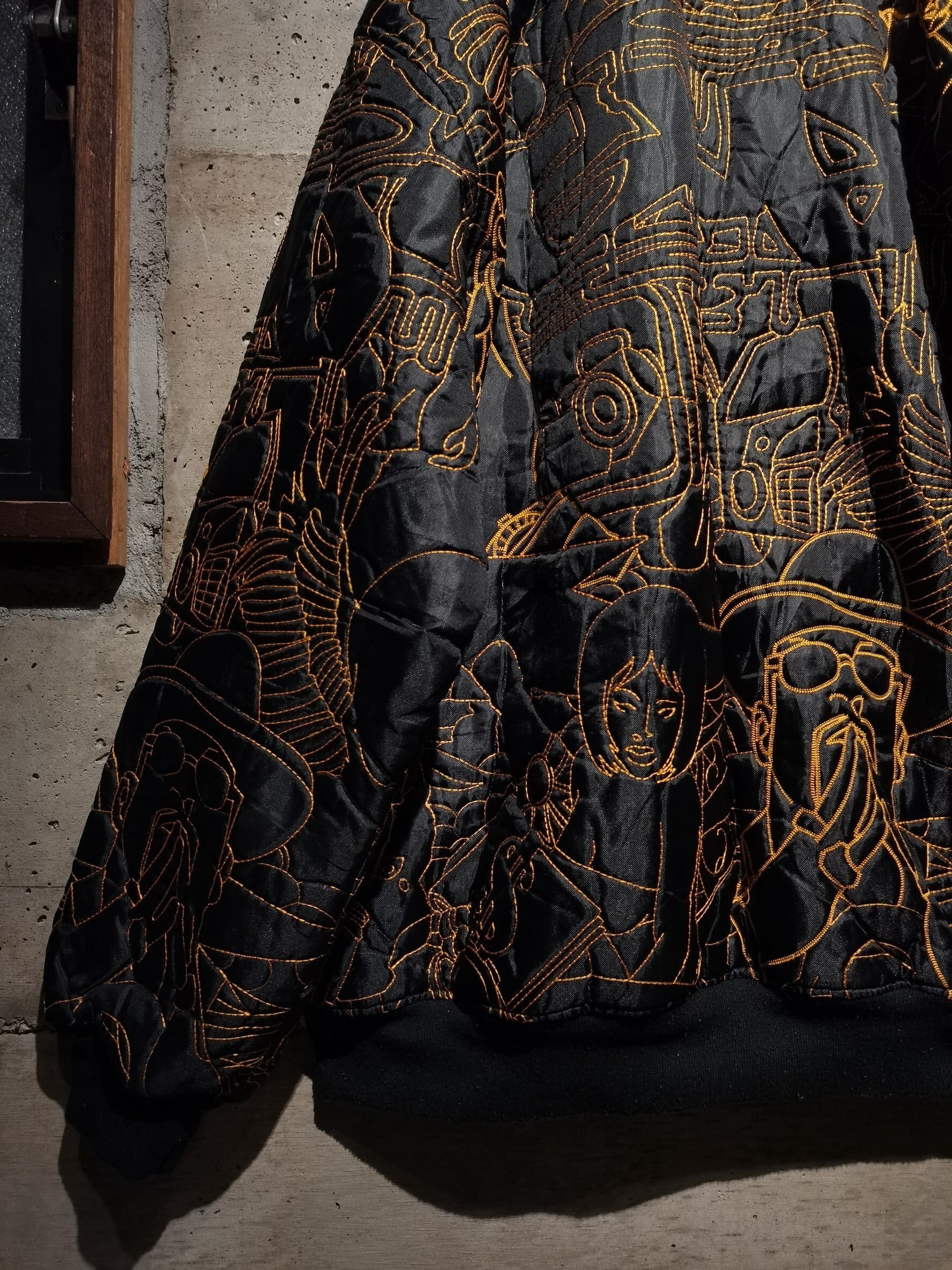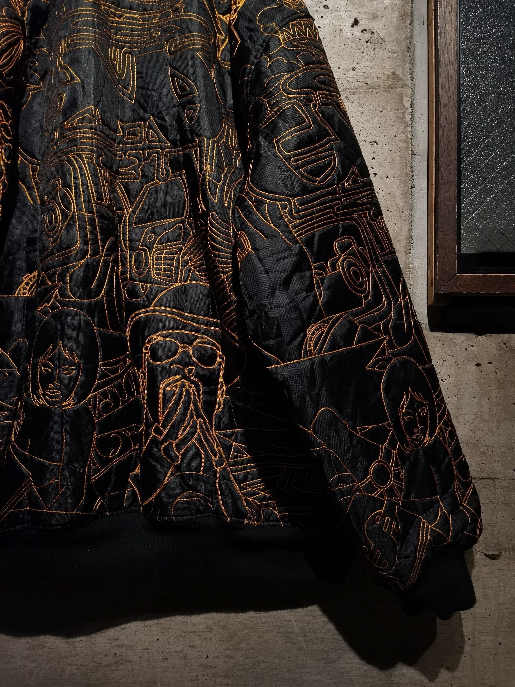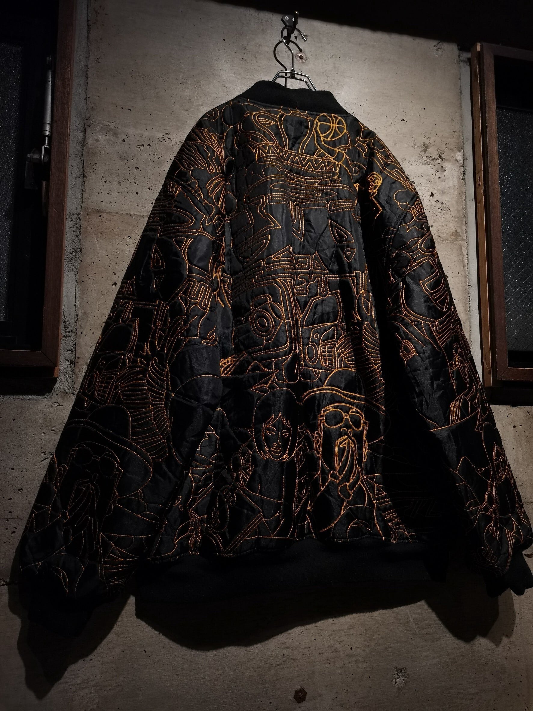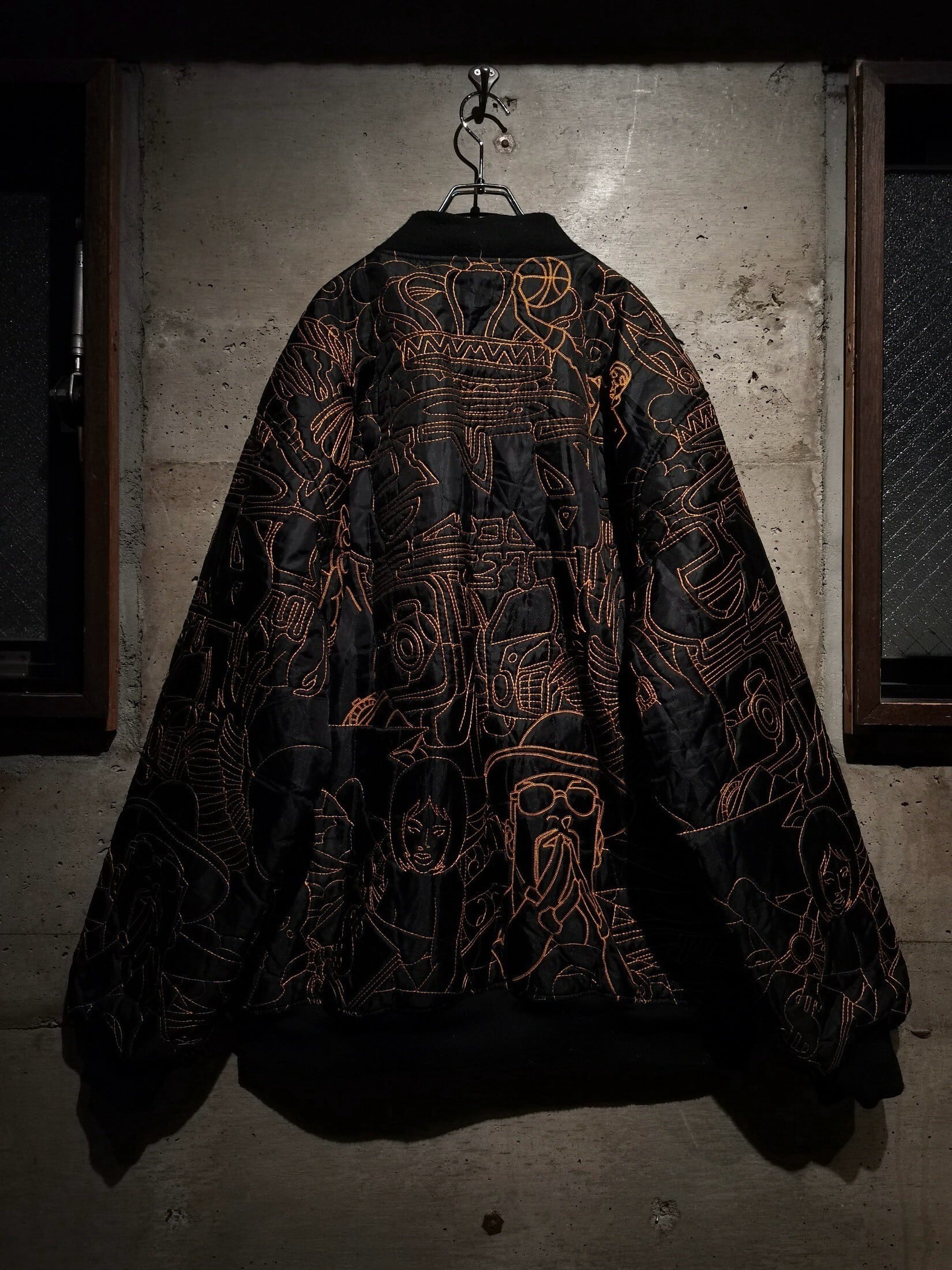 特有の光沢を持つブラックのボディに、総刺繍によってストリートなモチーフを全体にびっしりと刻み込んだボンバージャケット。