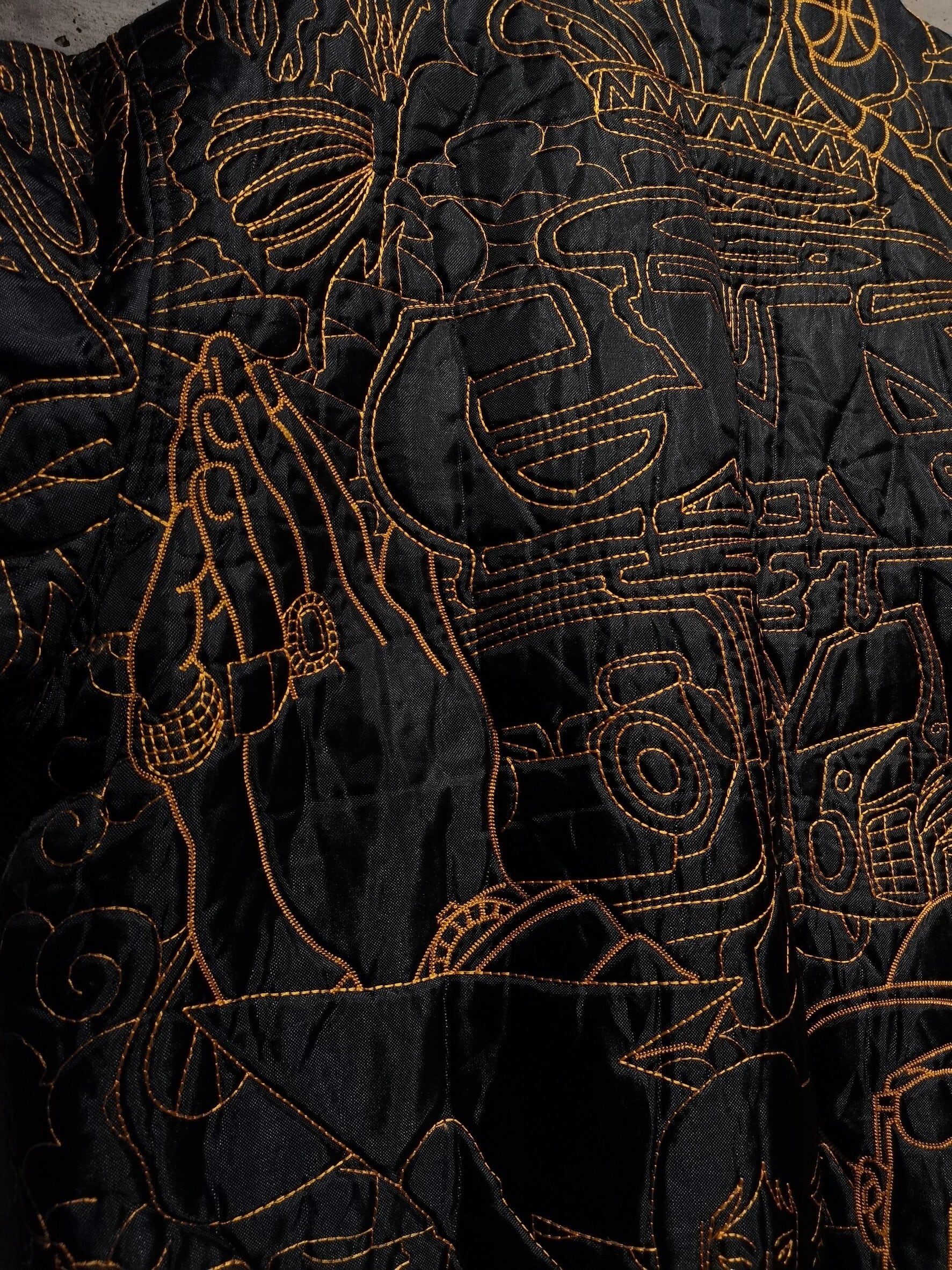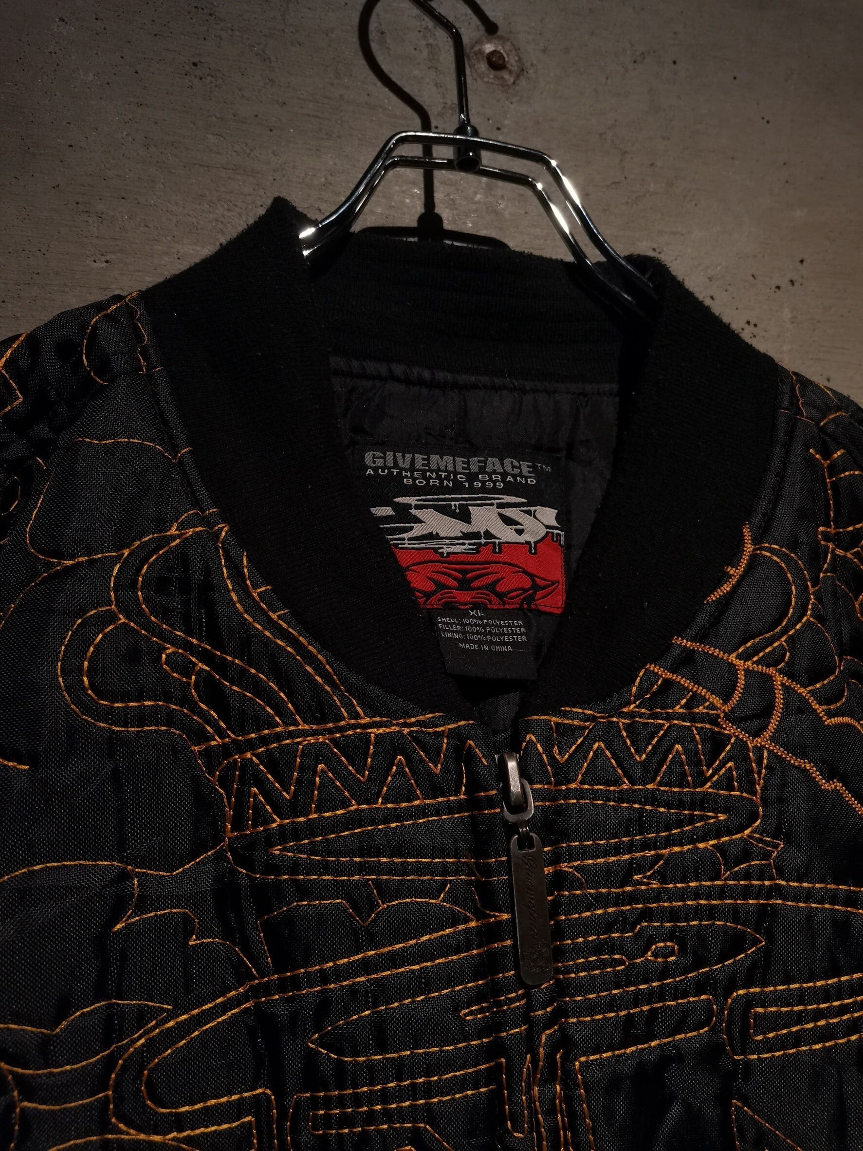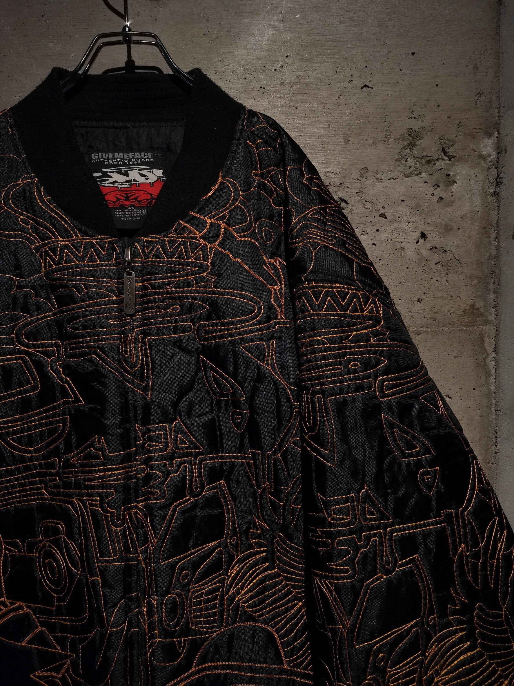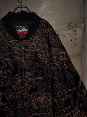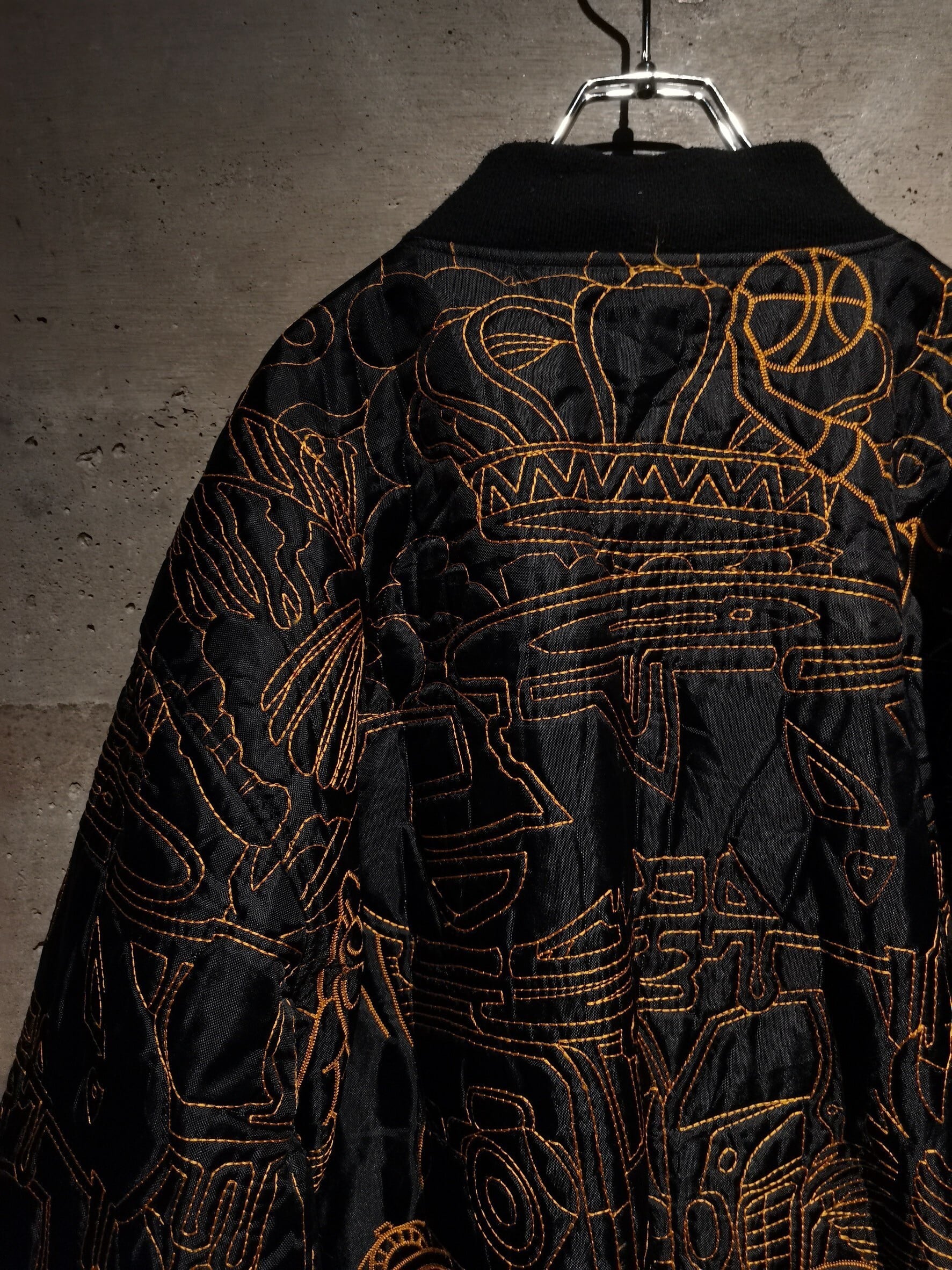 特有の光沢を持つブラックのボディに、総刺繍によってストリートなモチーフを全体にびっしりと刻み込んだボンバージャケット。