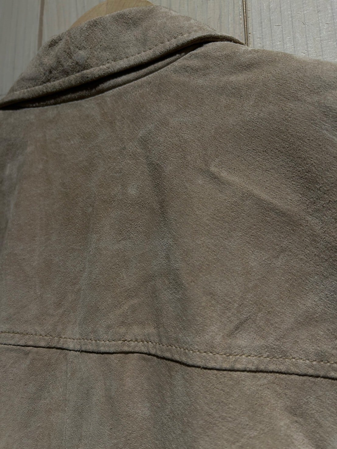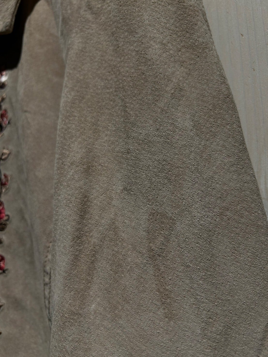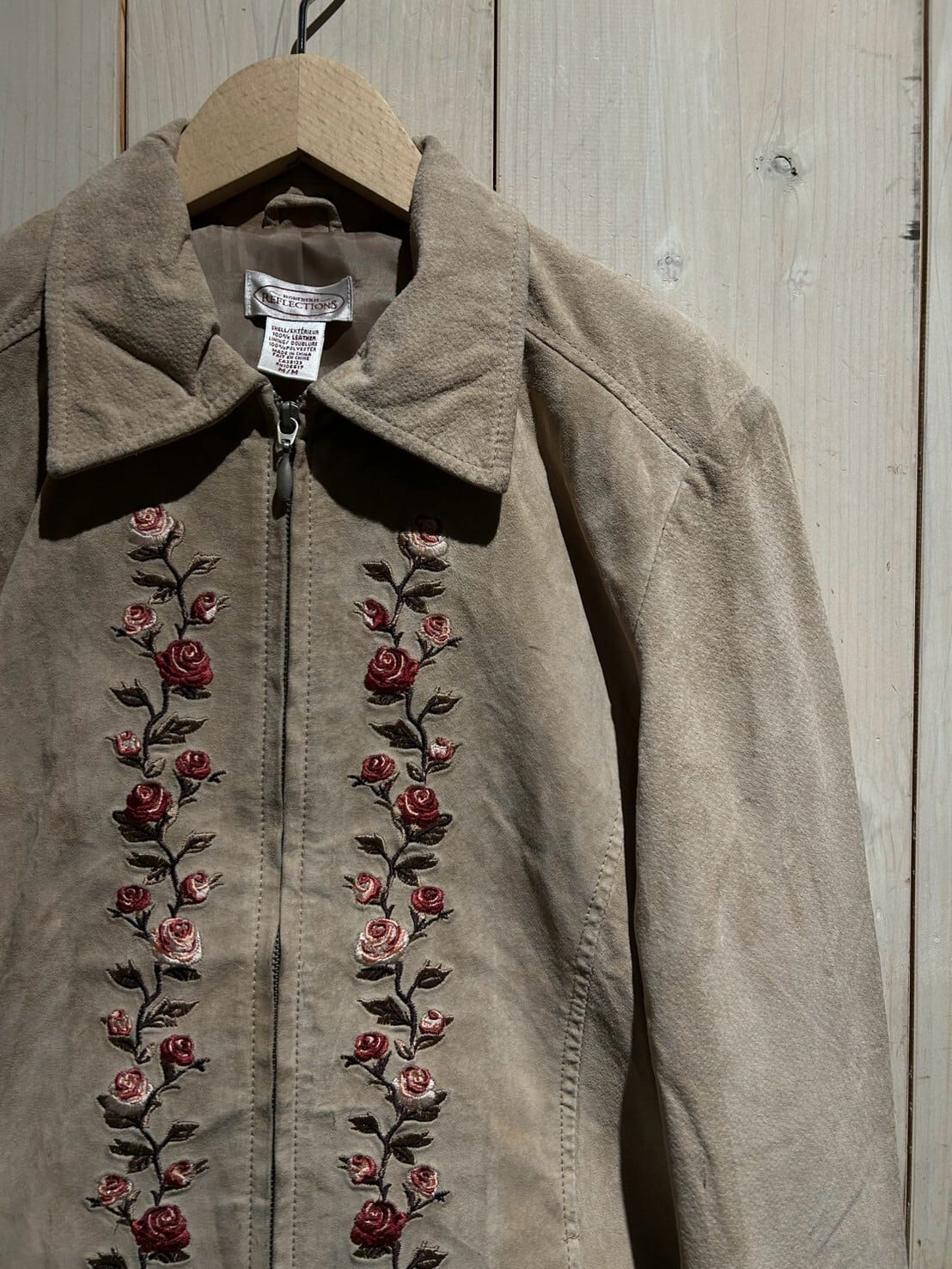 しっとりと柔らかくしなやかなベージュのスエードレザーに、美しい花の刺繍を刻んだレザージャケット。