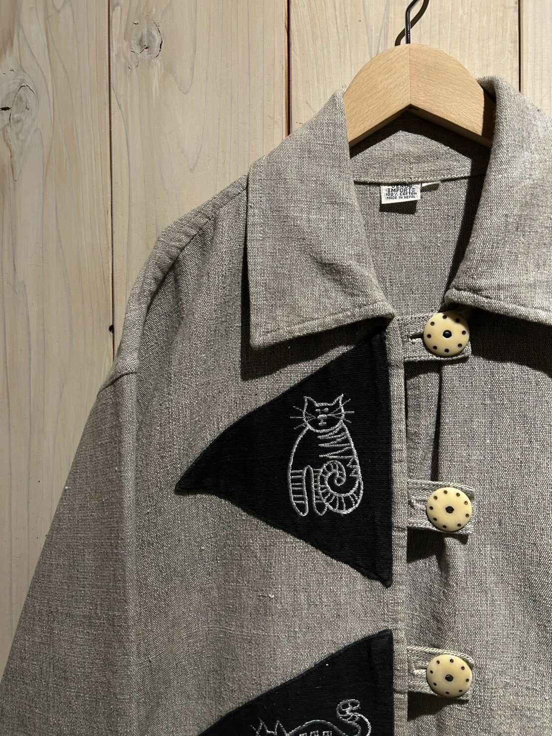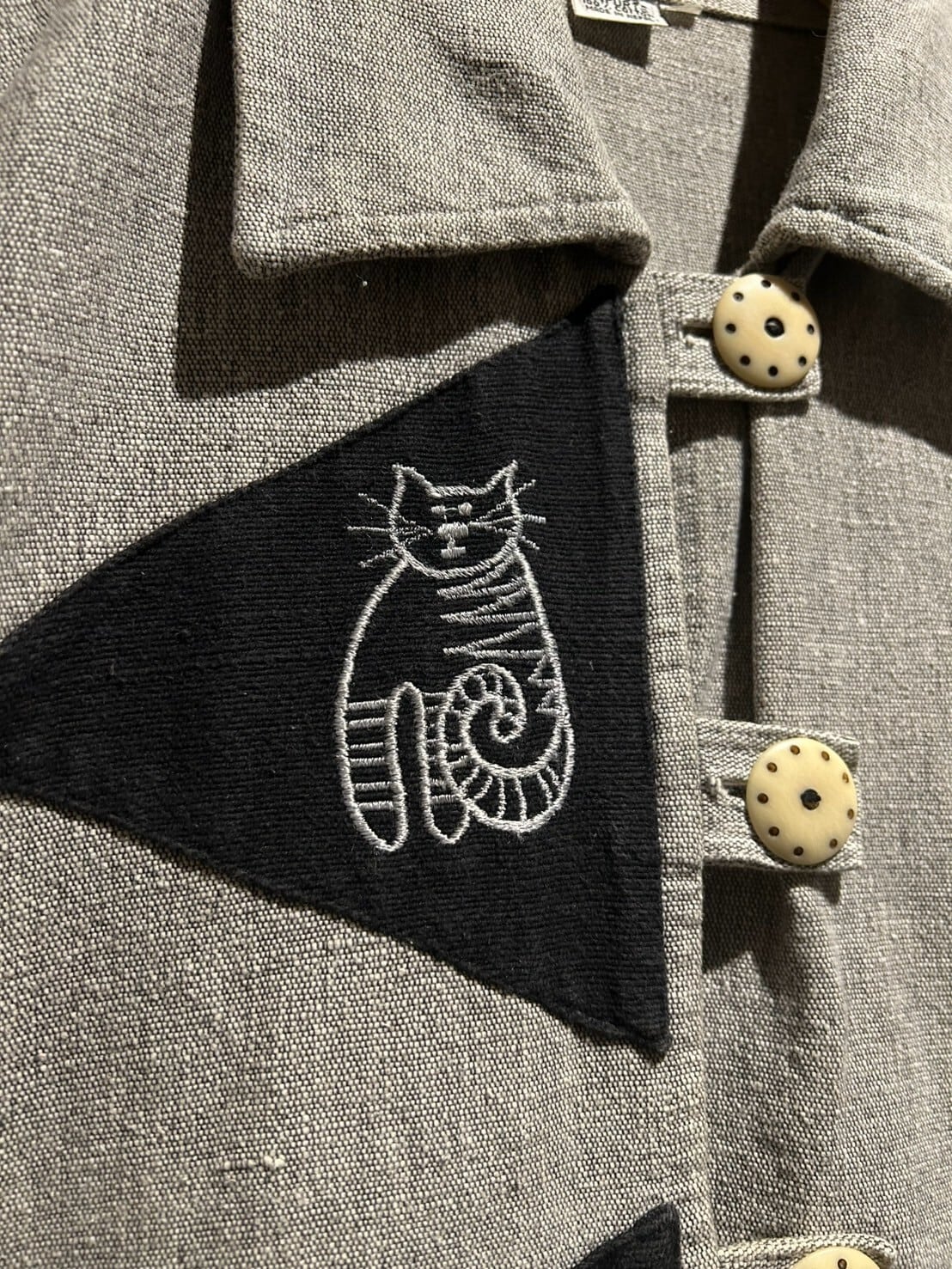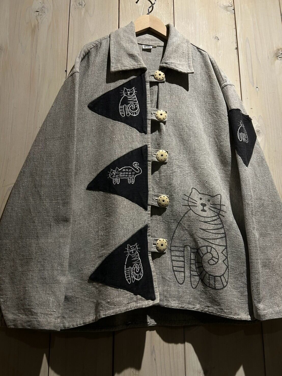 上質なネパールコットンを用いた柔らかなボディに、黒の三角形の生地を載せ、猫のデザインをプリントで表現したジャケット。