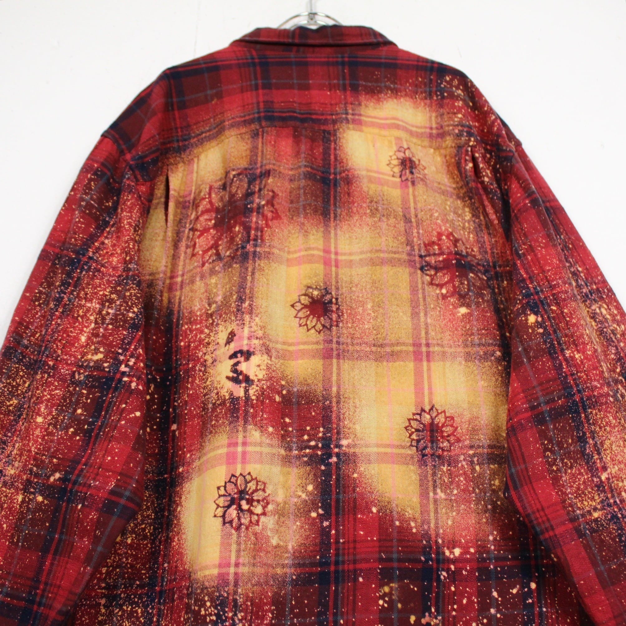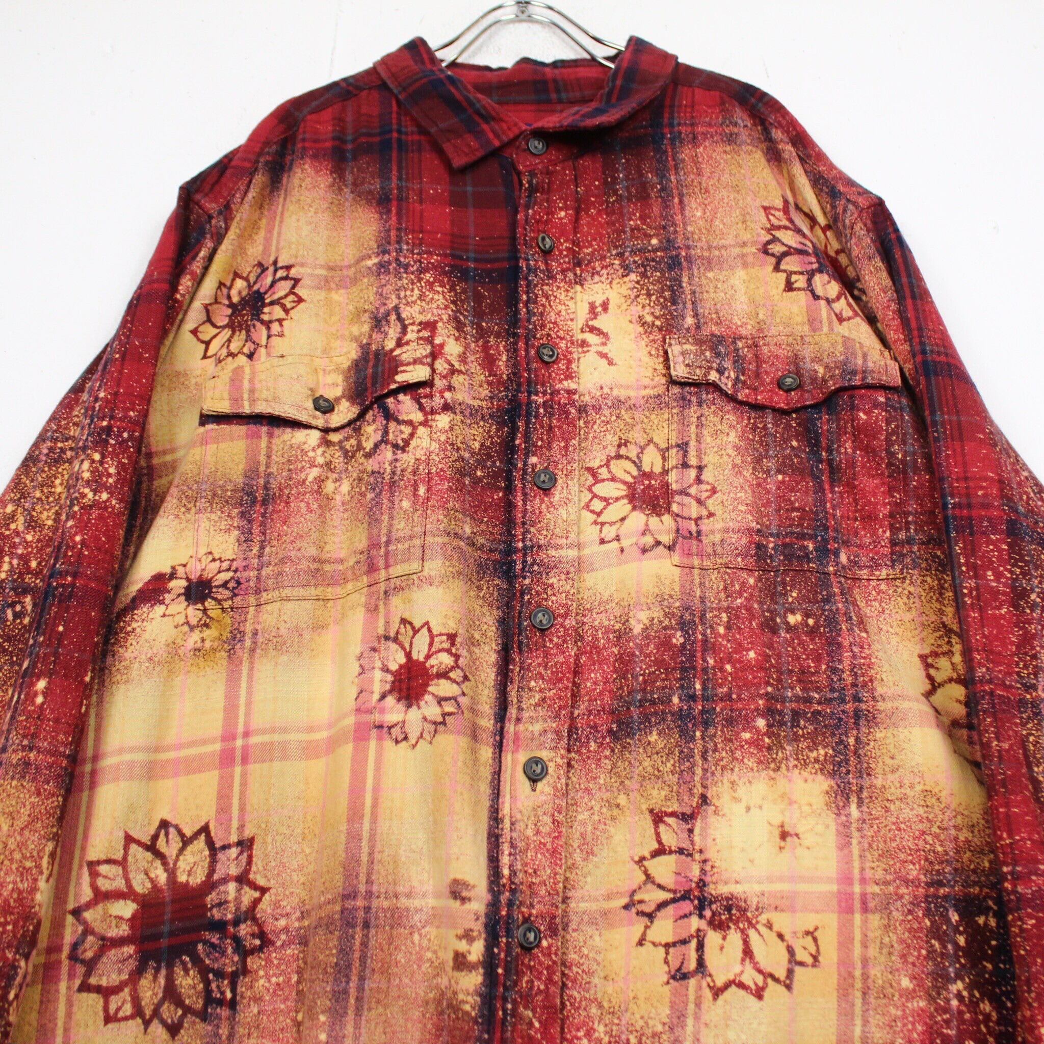 ふわっと柔らかいコットン素材のボディに、赤のタータンチェックを載せ、その上からブリーチ、更に花柄のデザインを施した長袖シャツ。
