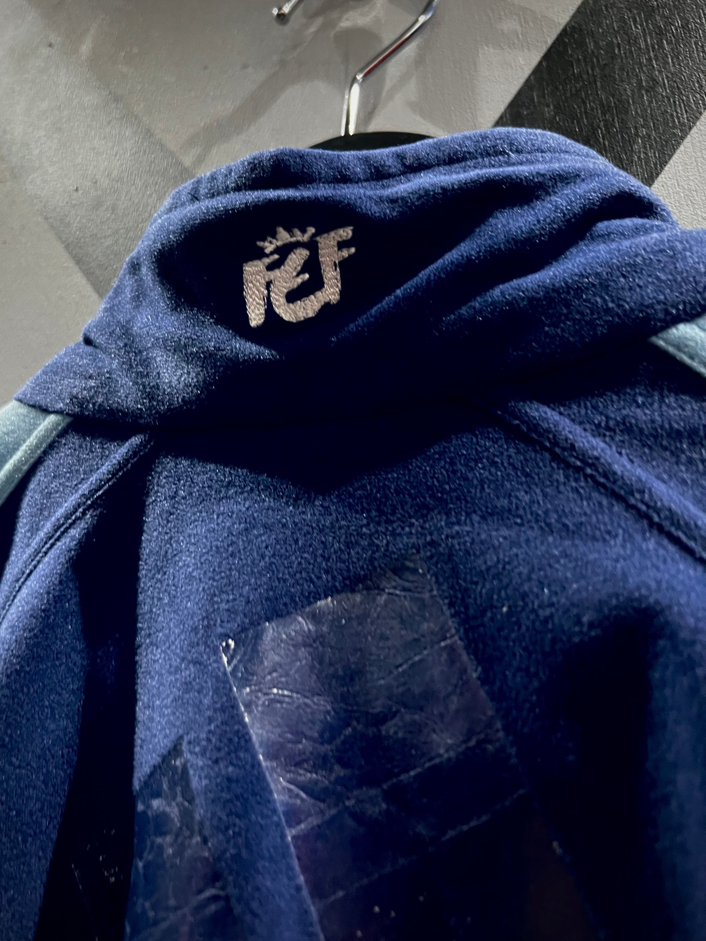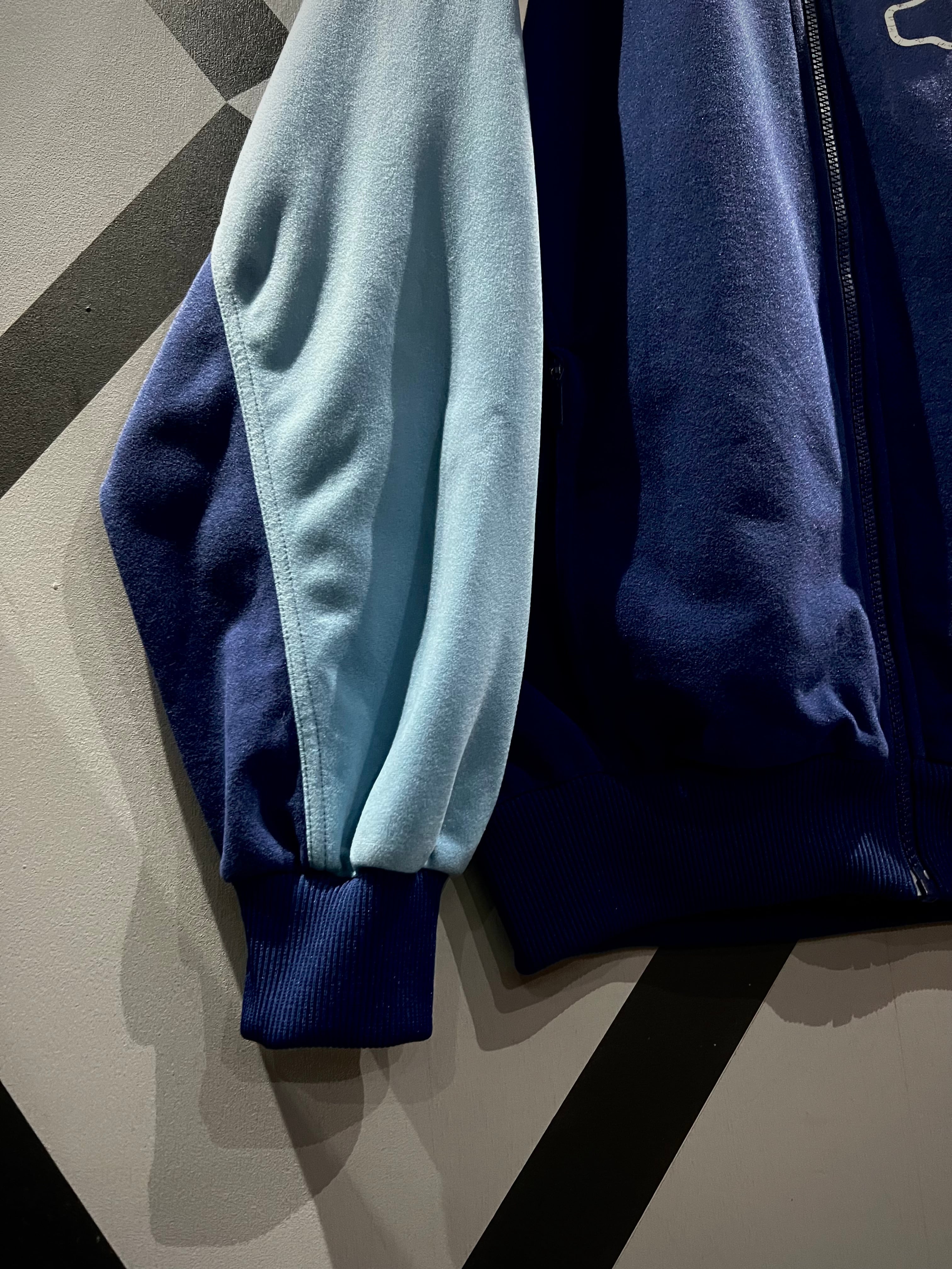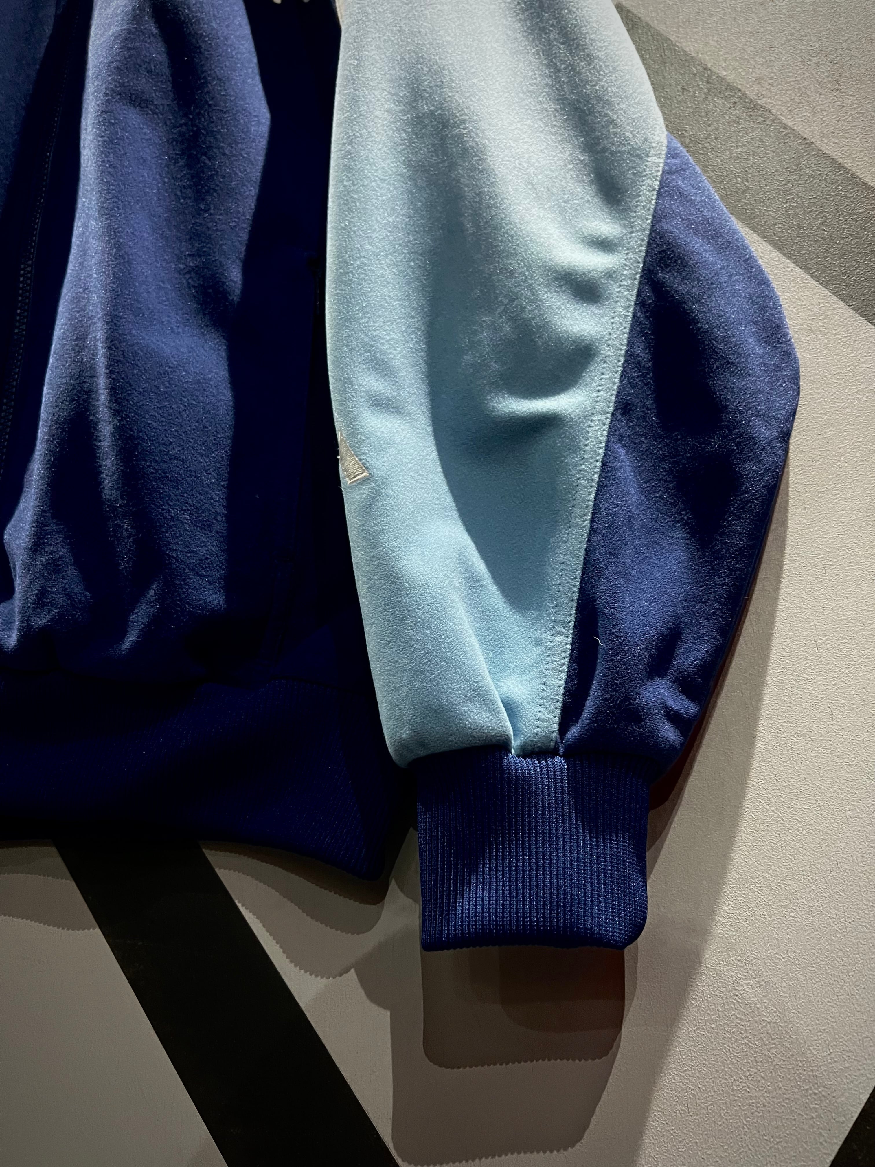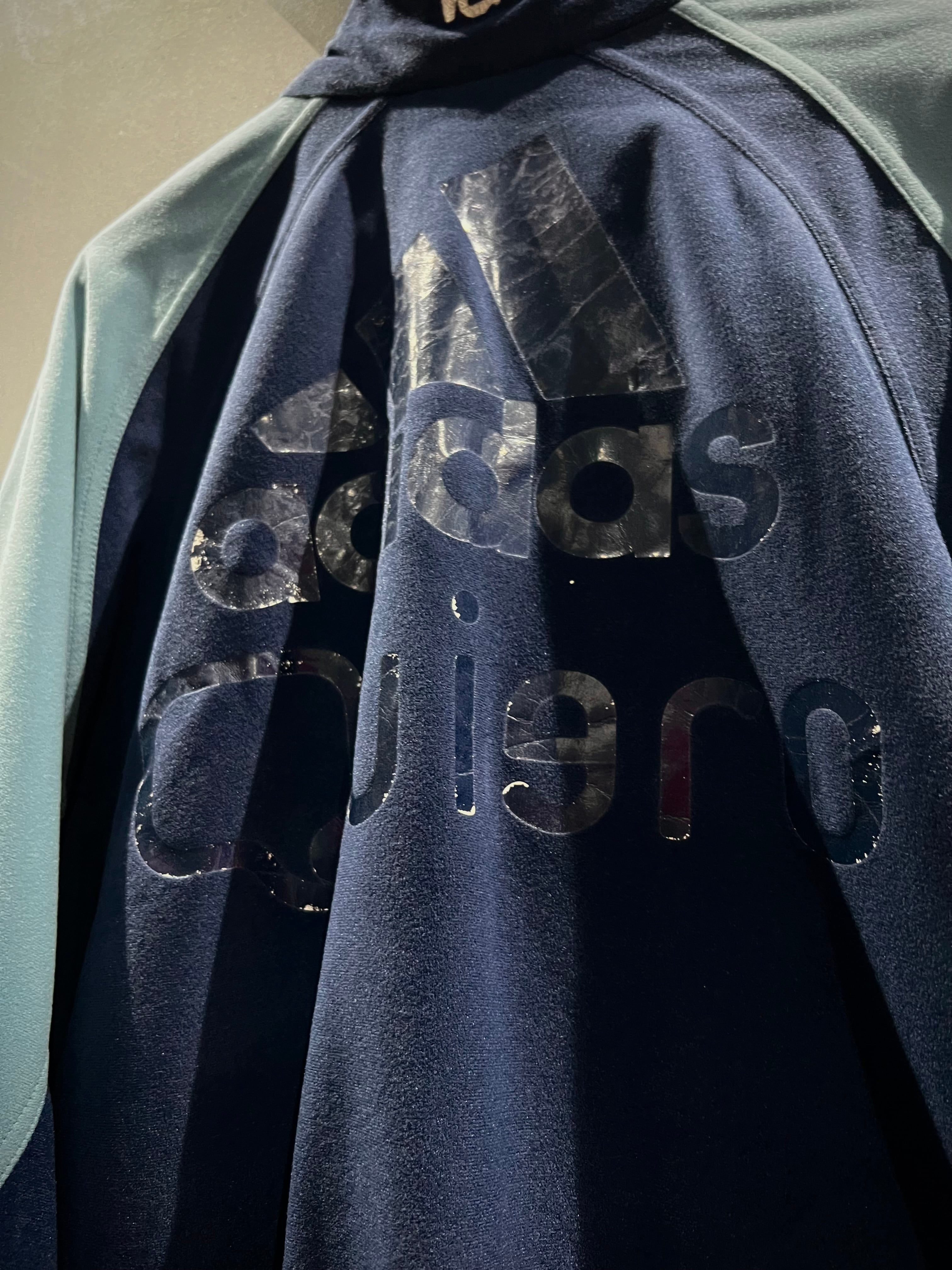 ネイビーと水色の切り替えに、adidasのシグネチャーでもある三本ラインを施したボディ。ワッペンの映えるカラーリングで、シンプルながらデザイン性の高い1着に仕上がっています。