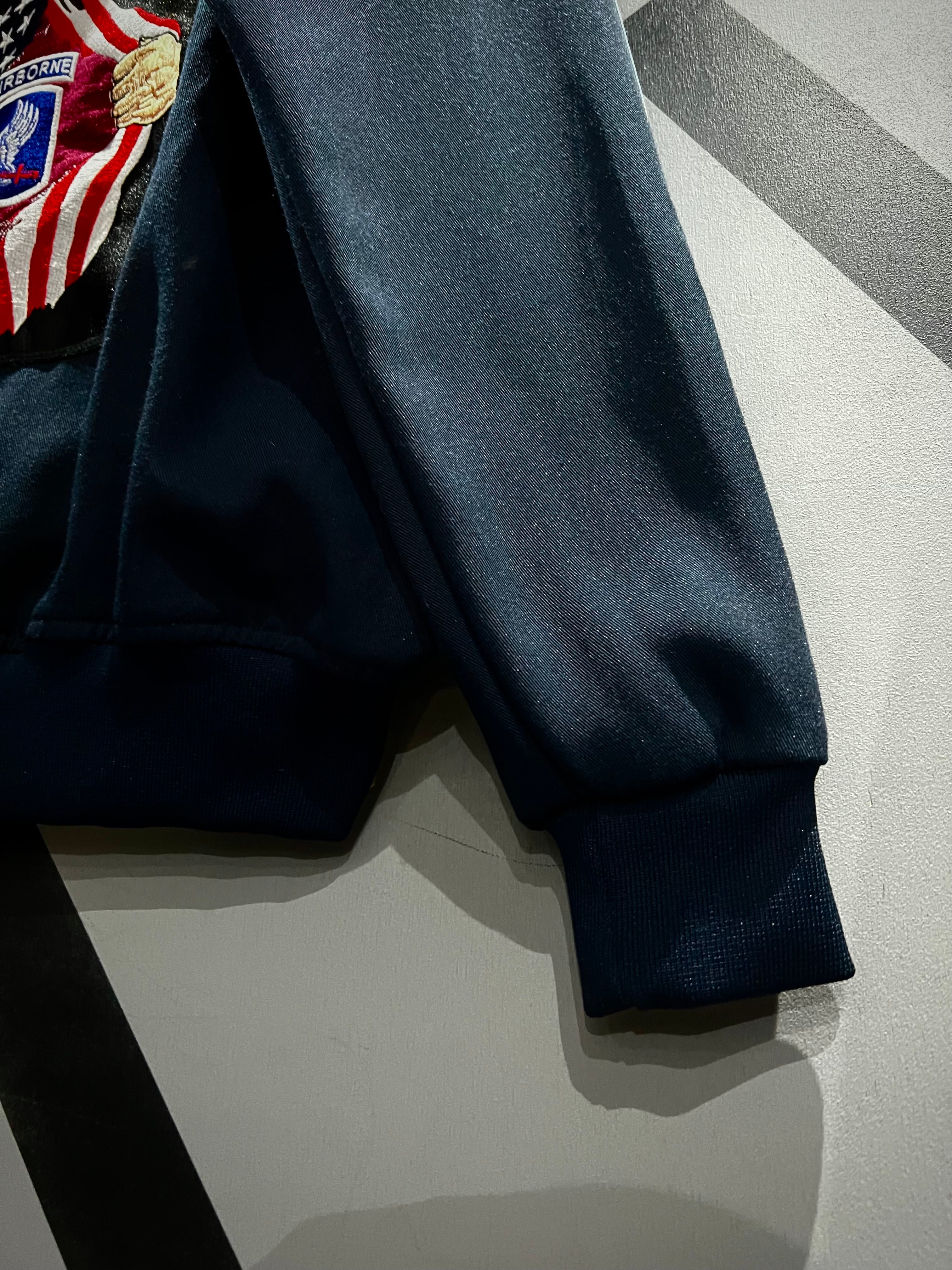 ネイビーのボディをベースに、セーラーアイテム特有のセーラーカラーの施し。袖、襟に水色のラインを施し、右胸には刺繍デザイン、背面にはセーラー特有の大ぶりの襟に刺繍、アメリカ国旗を引き裂き、アメリカの空挺師団のロゴを載せた遊び心あるデザインを載せた1着。