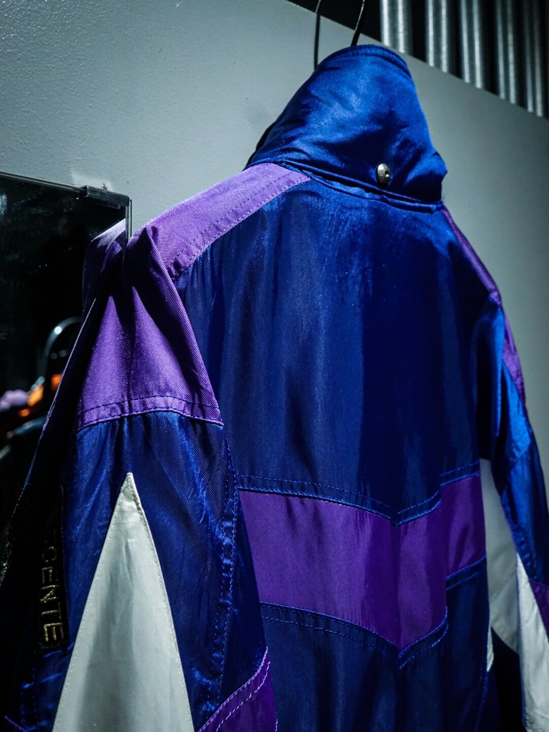 青、白、紫のカラーリングをベースにエッジの効いた切り替えが施されたボディに、3つのジップポケット、ジップ×スナップボタンの比翼仕立てでハイネック仕様、Dカンやジップストラップ、ブランドタグ等細部までデザインの凝った1着。