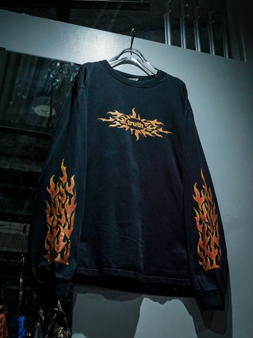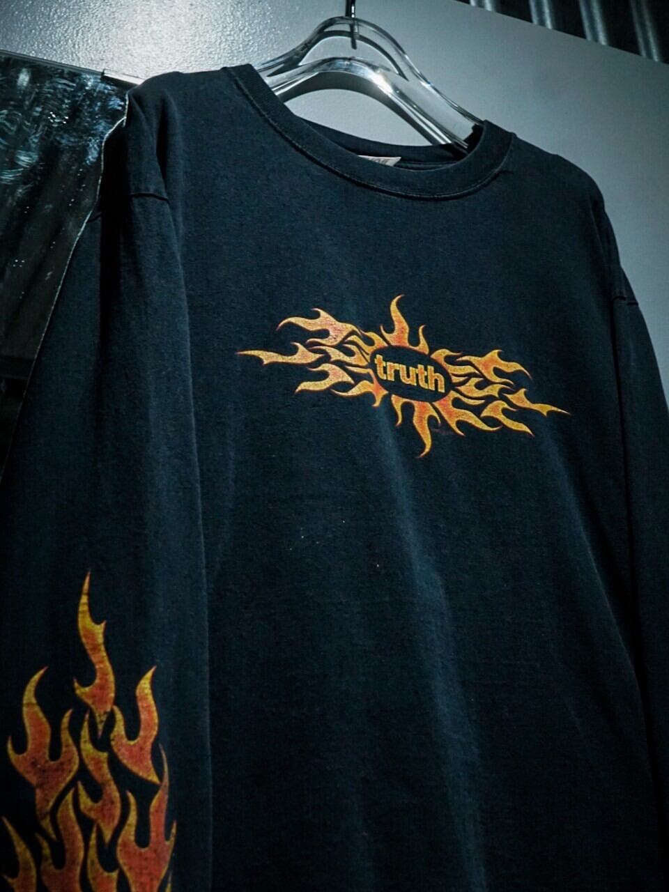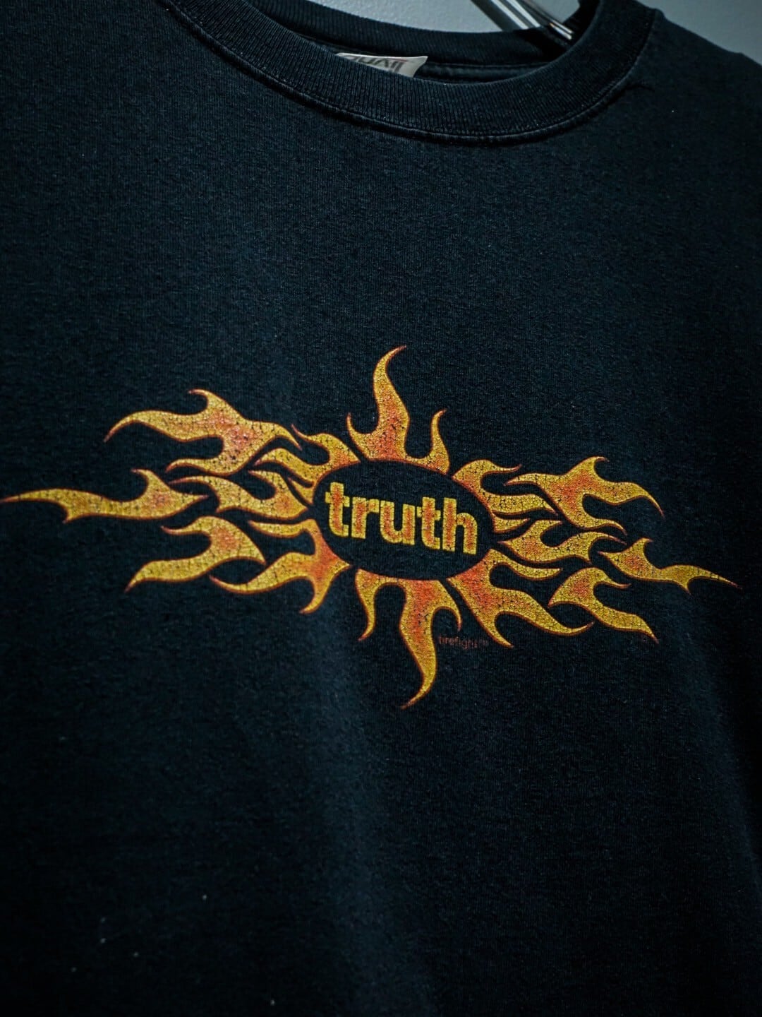 程よくフェードの効いたブラックのボディに、フロントにはtruthの文字とファイヤーパターン、背面にはヨハネの福音書14章6節の"私は道であり、真理であり、命である。わたしを通らなければ、だれ一人、父のところへは行くことはできない"の一節が載ったロンティー。