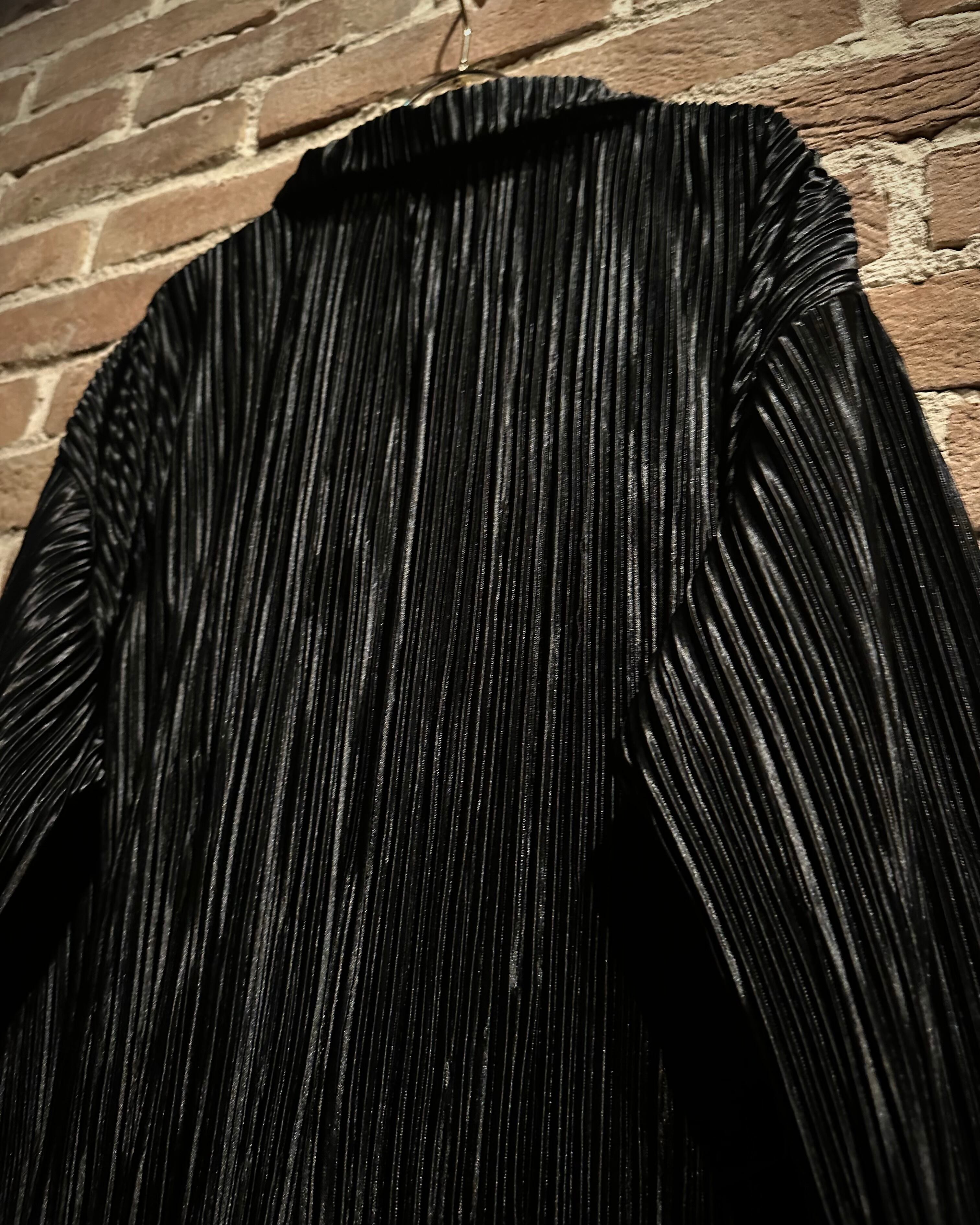 光沢のあるブラックの生地にプリーツ加工を施したシャツジャケット。